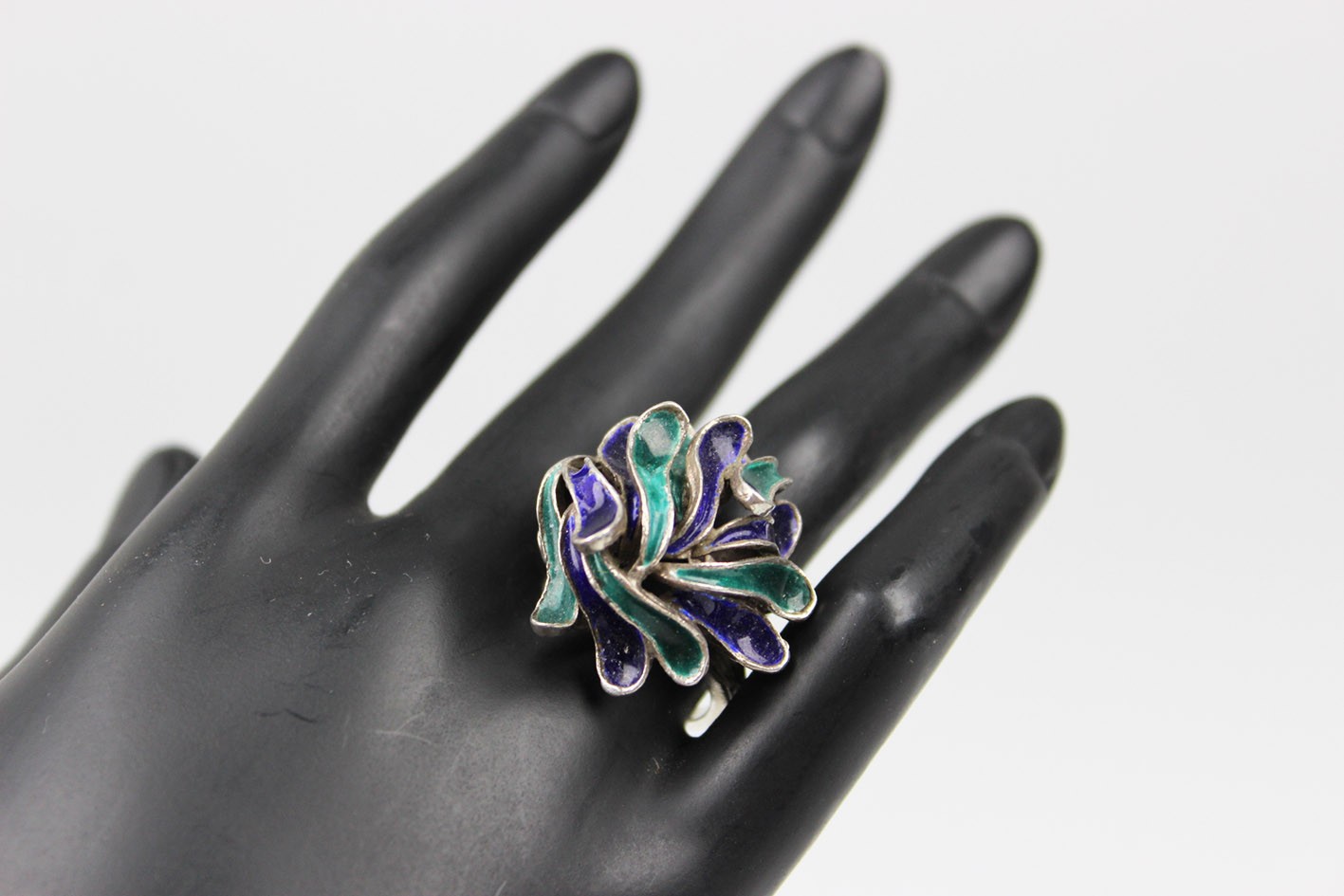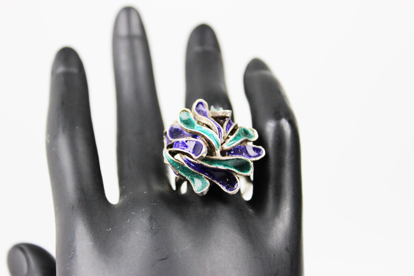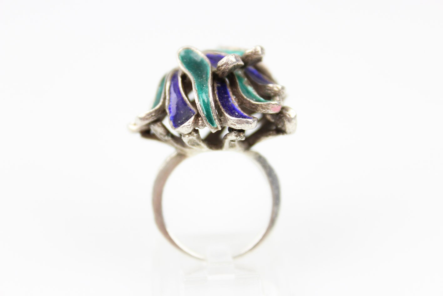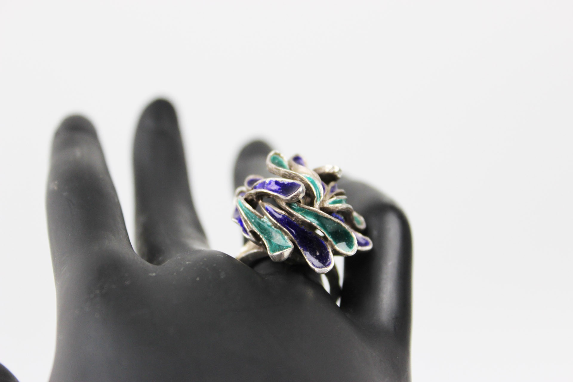 Efektowny pierścionek o wyraźnie modernistycznej formie, wykonany ze srebra próby 835 i zdobiony barwną emalią w odcieniach głębokiego kobaltu, granatu i szmaragdowej zieleni. Kompozycja opiera się na nieregularnych, płynnych liniach tworzących dynamiczną, przestrzenną strukturę przypominającą organiczne formy natury lub abstrakcyjne płatki. Wyrób w formie typowej dla skandynawskiego wzornictwa lat 60 tych XX wieku łączącego surowość materiału z kolorem i ekspresją kształtu. Całość zachowana w bardzo dobrym stanie z drobnymi śladami użytkowania. Wymiary: