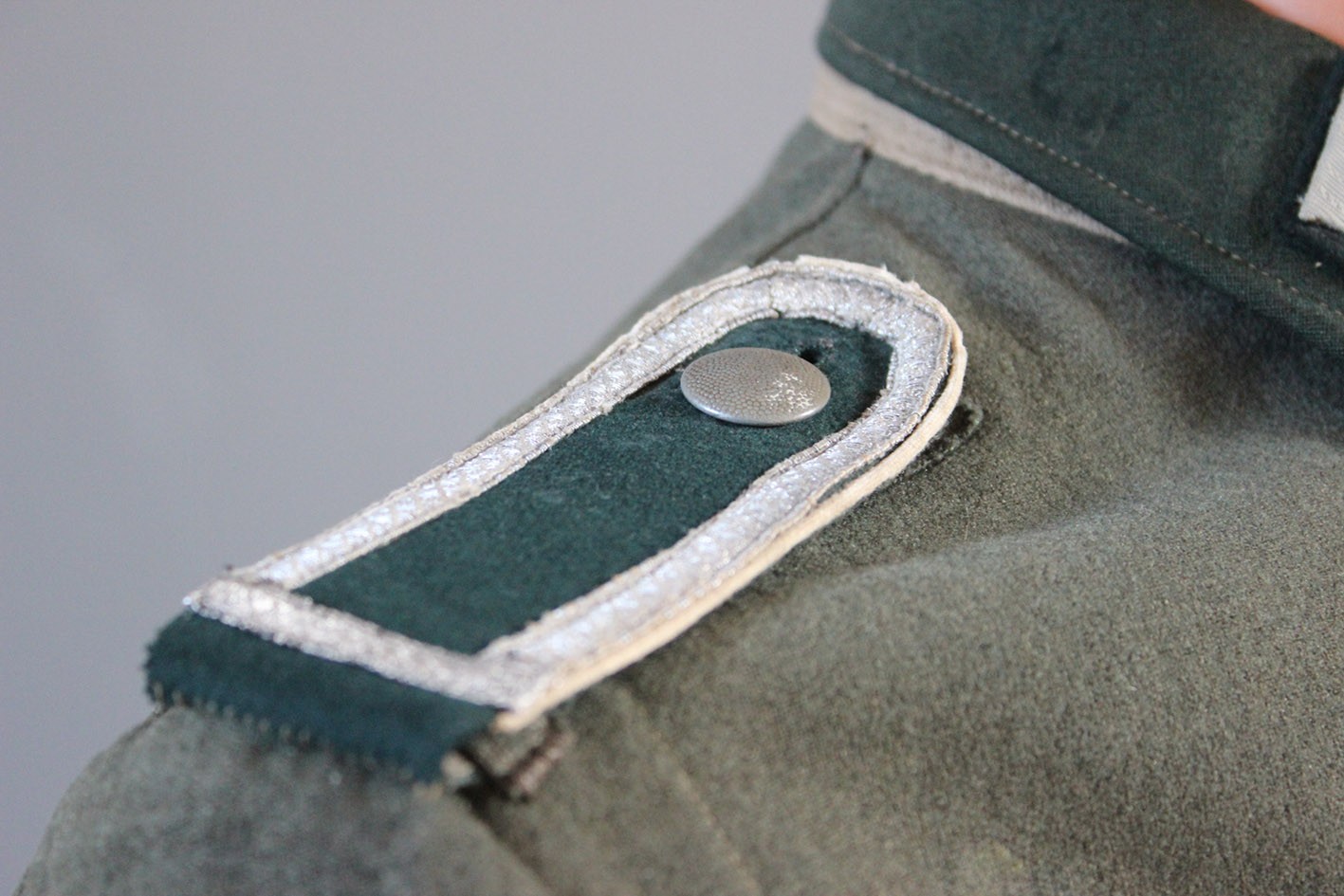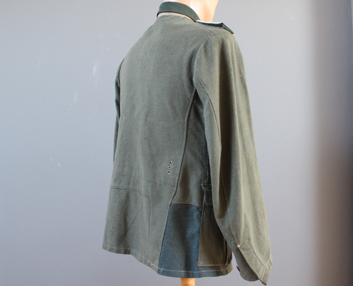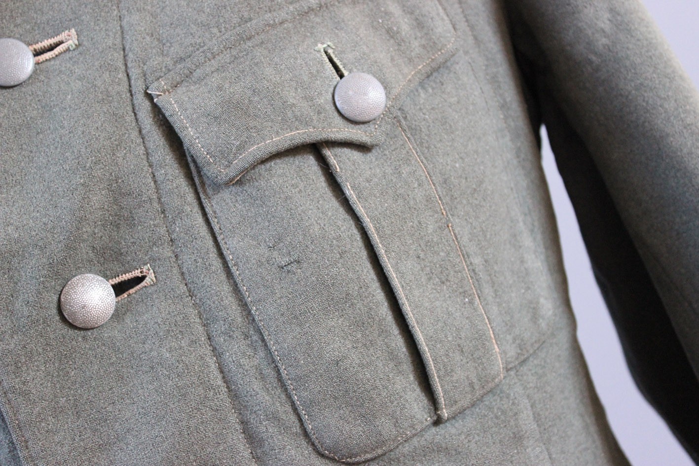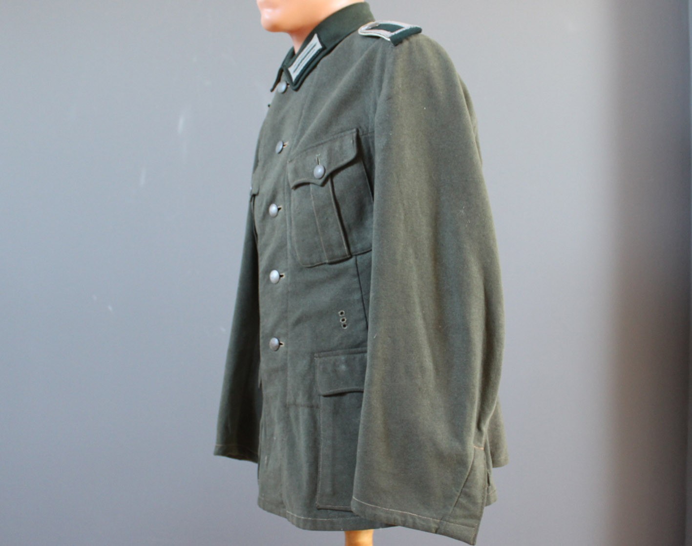 Stan zachowania dokładnie taki, jak widoczny na zdjęciach. Materiał jest mocno sprany, co spowodowało całkowite zatarcie tuszowych pieczątek i bić producenta. Widoczne są liczne ślady długotrwałego użytkowania, miejscowe przetarcia, drobne ubytki sukna oraz naturalne osłabienia tkaniny. W dolnej, tylnej części bluzy zachowane oryginalne, wojenne wstawki naprawcze, wykonane w okresie użytkowania. Nie są to późniejsze ingerencje, lecz autentyczne naprawy frontowe, podnoszące historyczną wiarygodność egzemplarza. Tego typu żołnierskie, liniowe bluzy spotykane są dziś znacznie rzadziej niż egzemplarze oficerskie, które w dużej części przetrwały w stanie magazynowym. Jest to uczciwy, frontowy przykład umundurowania podoficera piechoty.