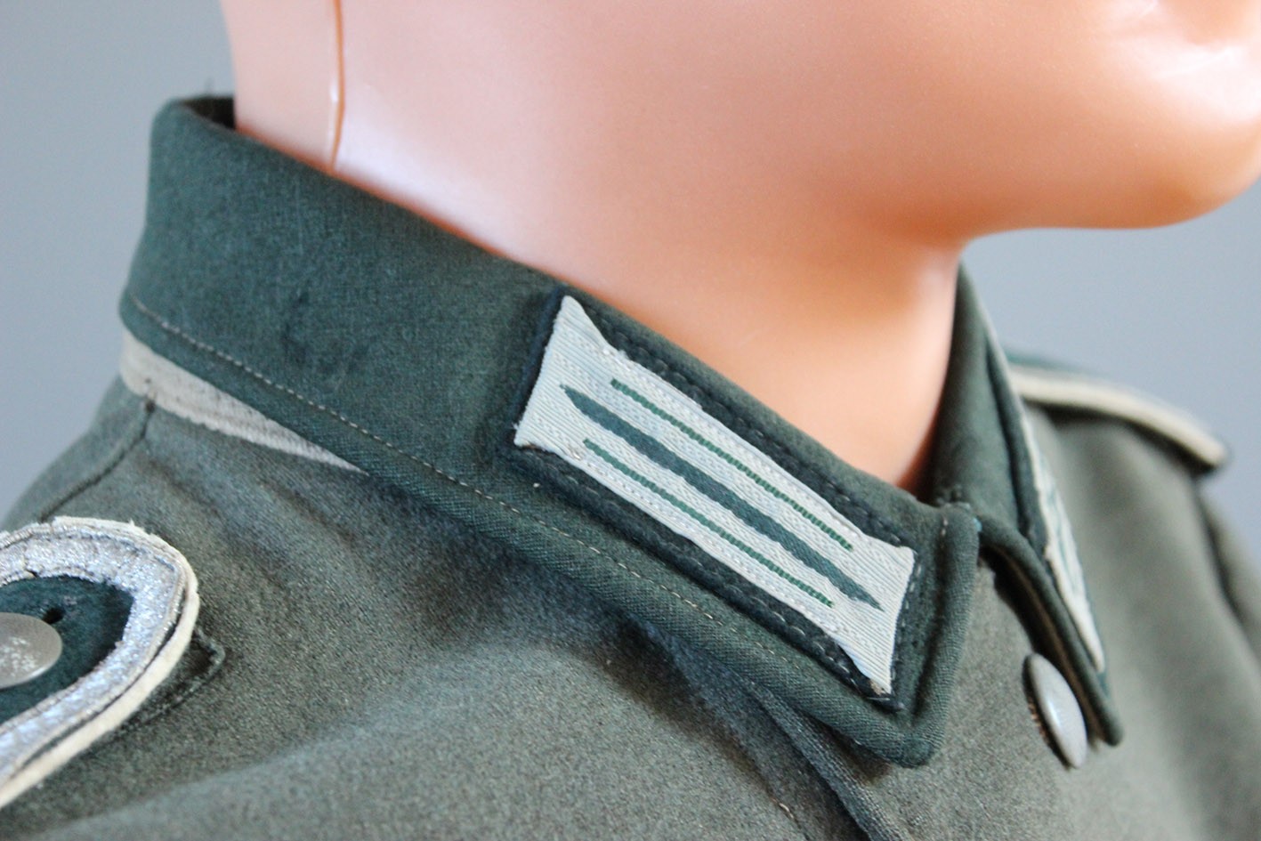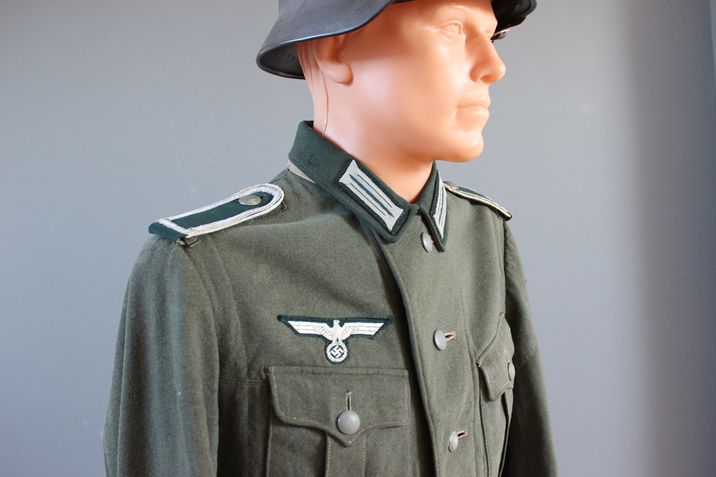 Oryginalna żołnierska bluza polowa M36 Wehrmacht zachowana w wyraźnie użytkowanym, autentycznym stanie frontowym. Egzemplarz wykonany z sukna feldgrau z charakterystycznym ciemnozielonym kołnierzem właściwym dla wczesnego okresu wojny. Bluza zachowana z kompletem oryginalnych dystynkcji. Pagony obszyte srebrnym galonem podoficerskim oraz z białym otokiem piechoty (Infanterie). Układ dystynkcji odpowiada stopniowi Unterfeldwebel.