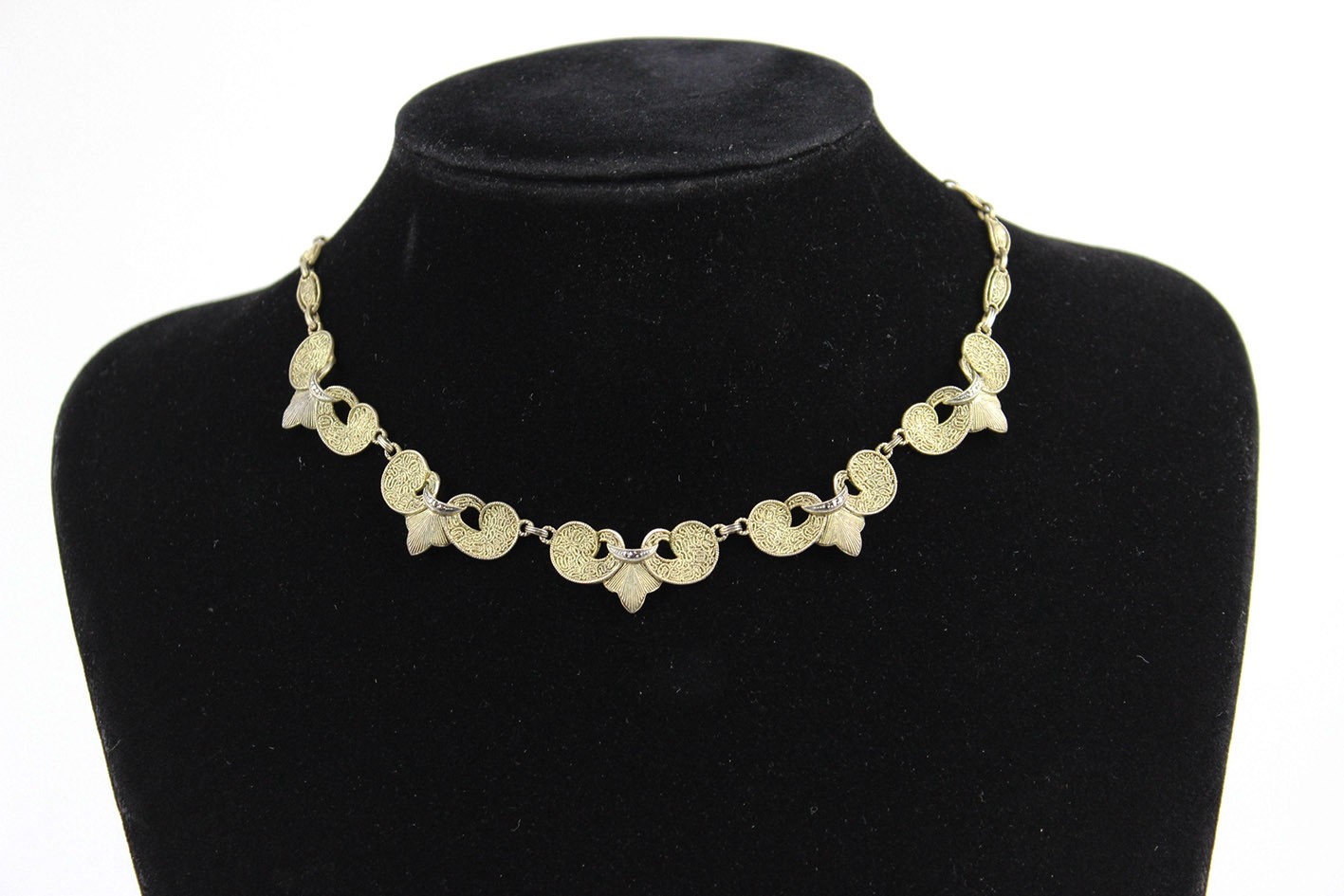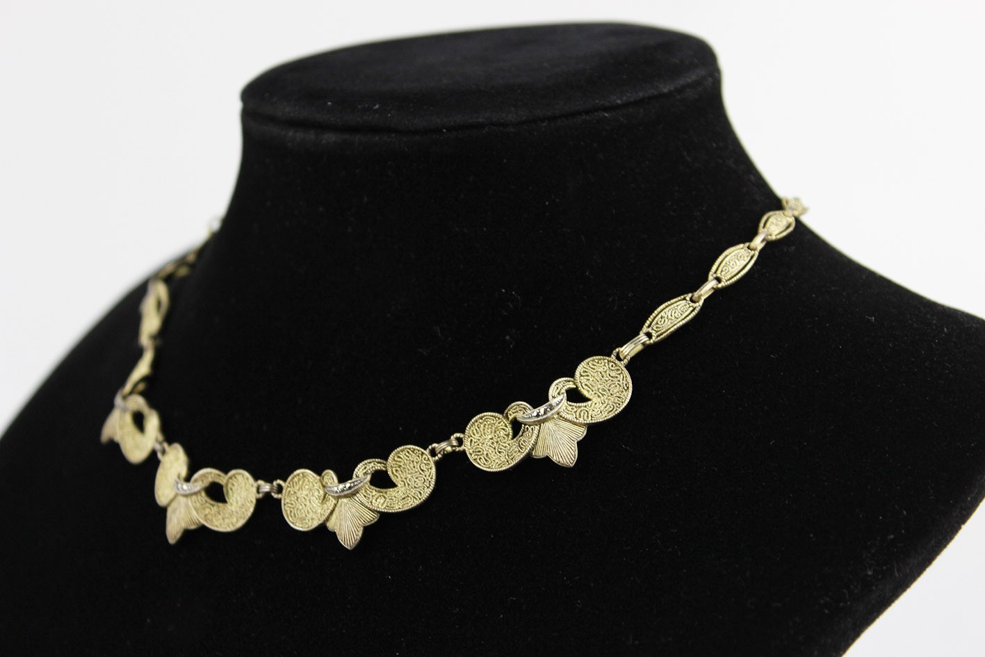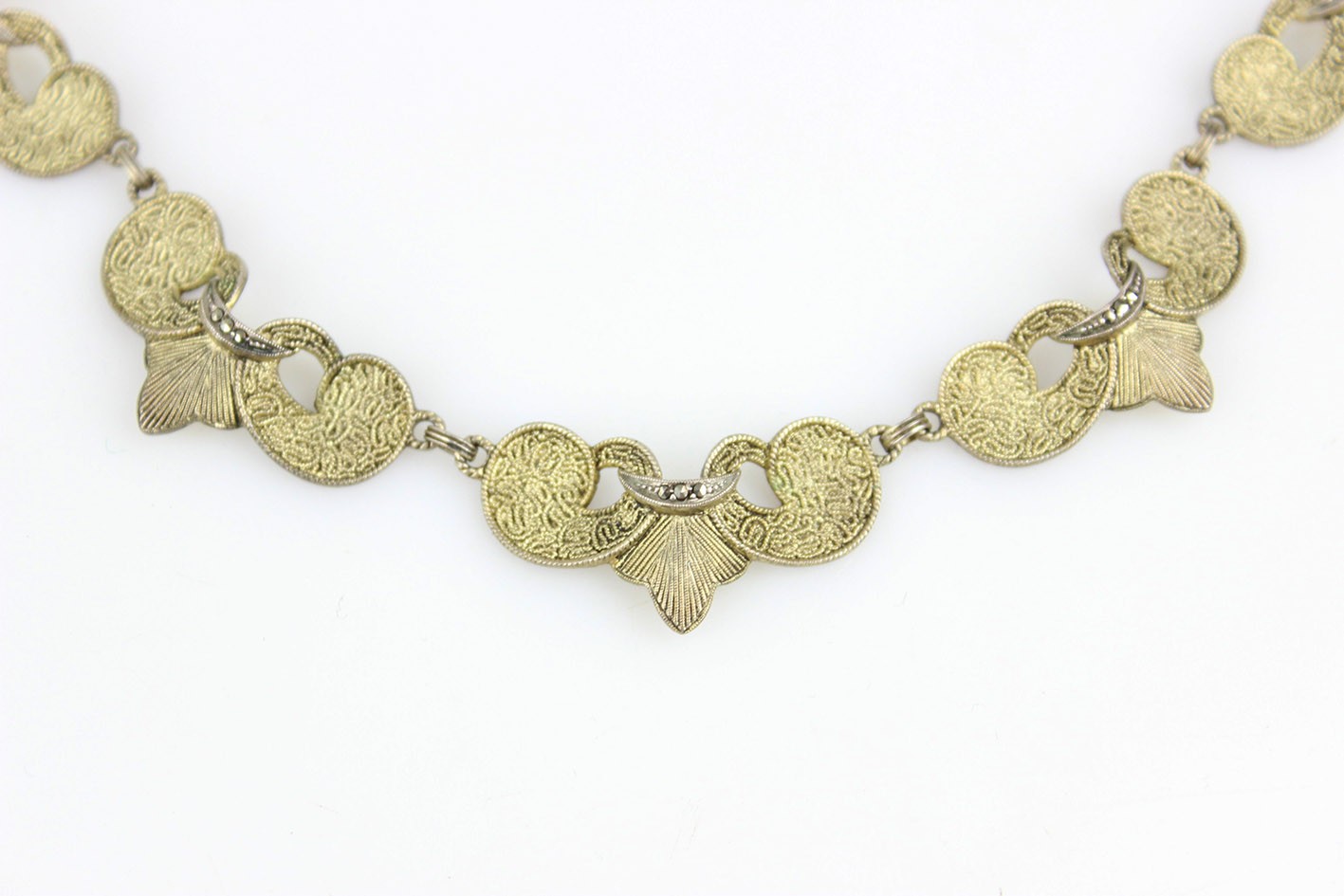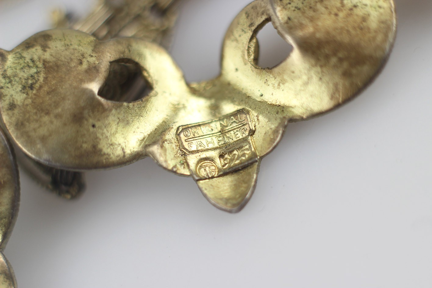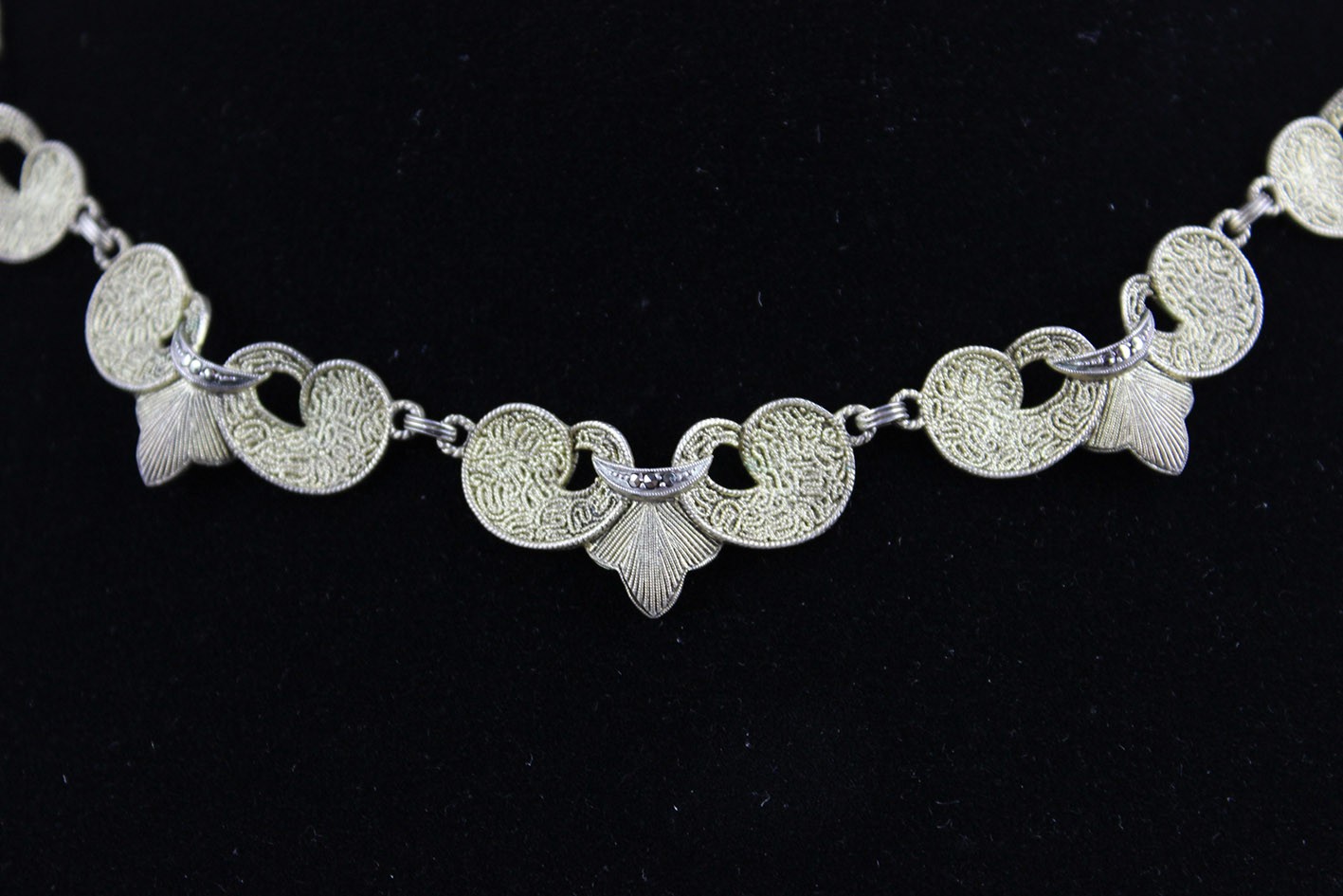 Przedwojenny naszyjnik pochodzący ze znakomitej wytwórni jubilerskiej Theodora Fahrnera. Przedmiot wykonany w złoconym srebrze próby 925 zdobiony charakterystycznym motywem "ślimaczków" i kameryzowany markazytami. Naszyjnik sygnowany puncą ORIGINAL FAHRNER oraz 925 TF w kółku. Stan zachowania bardzo dobry. Wymiary: