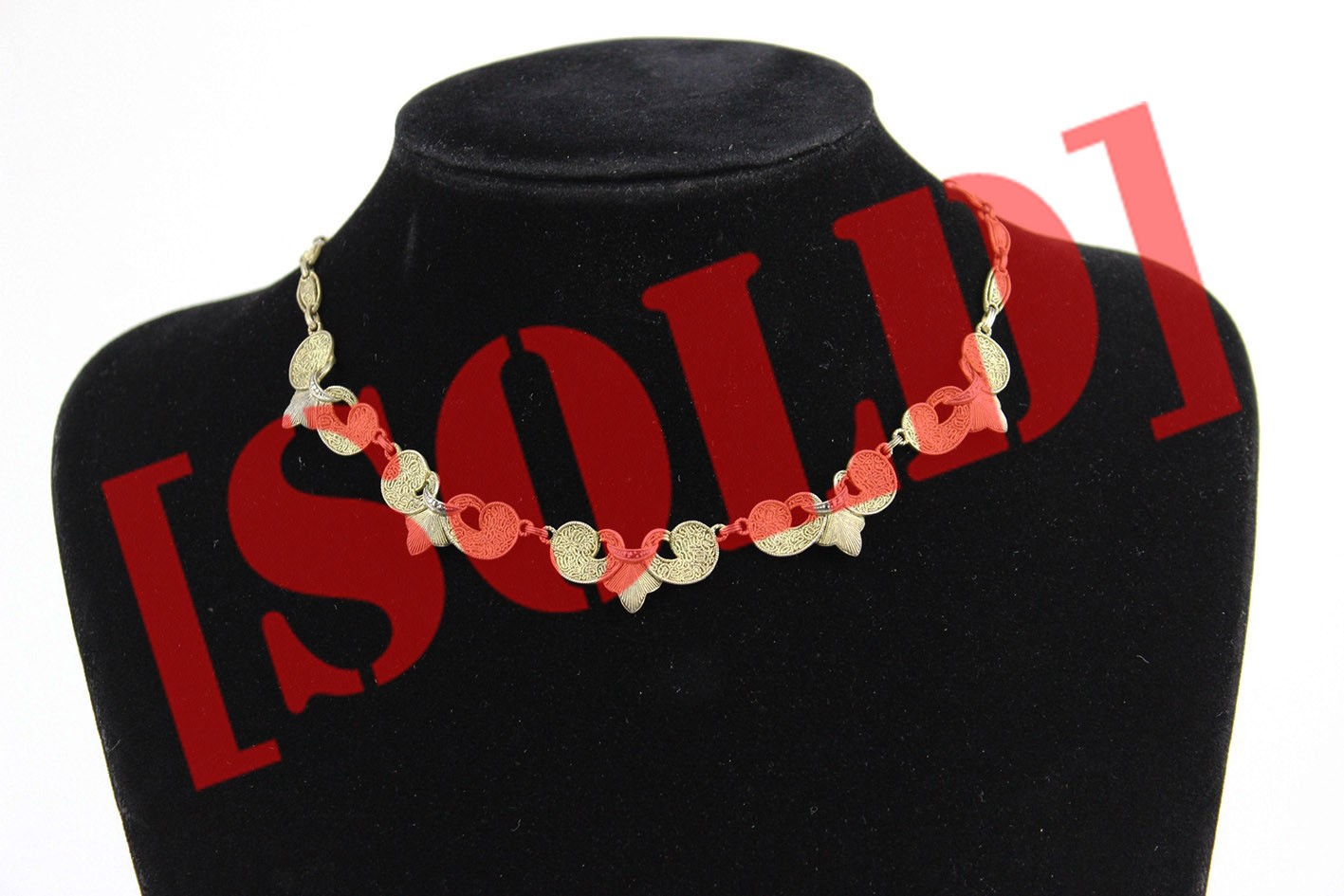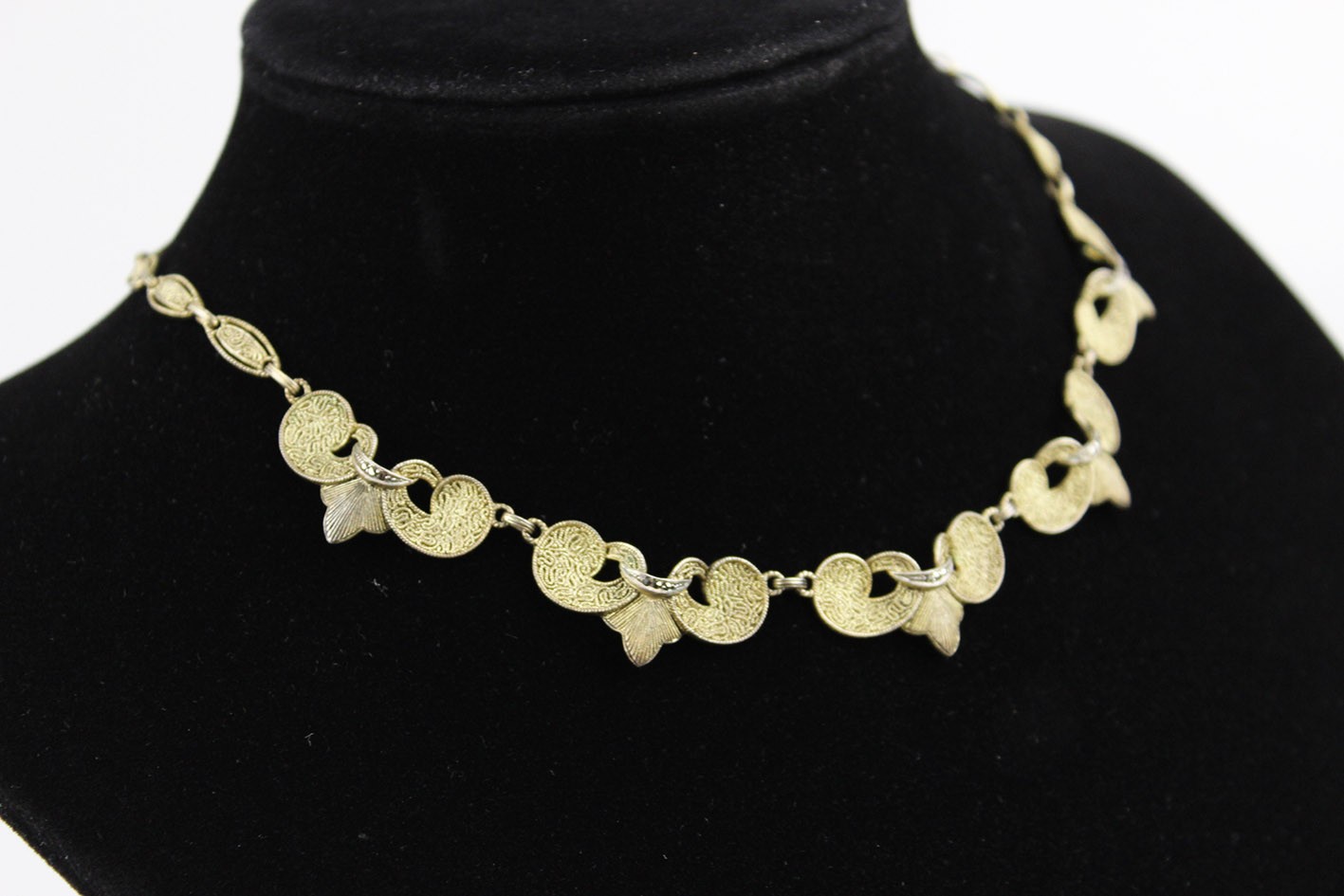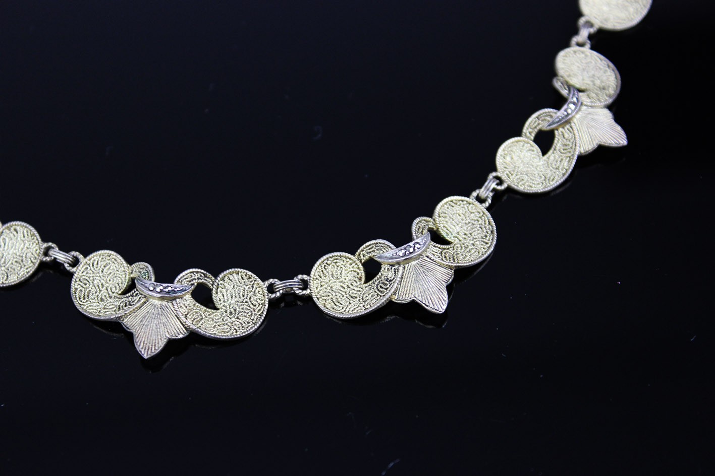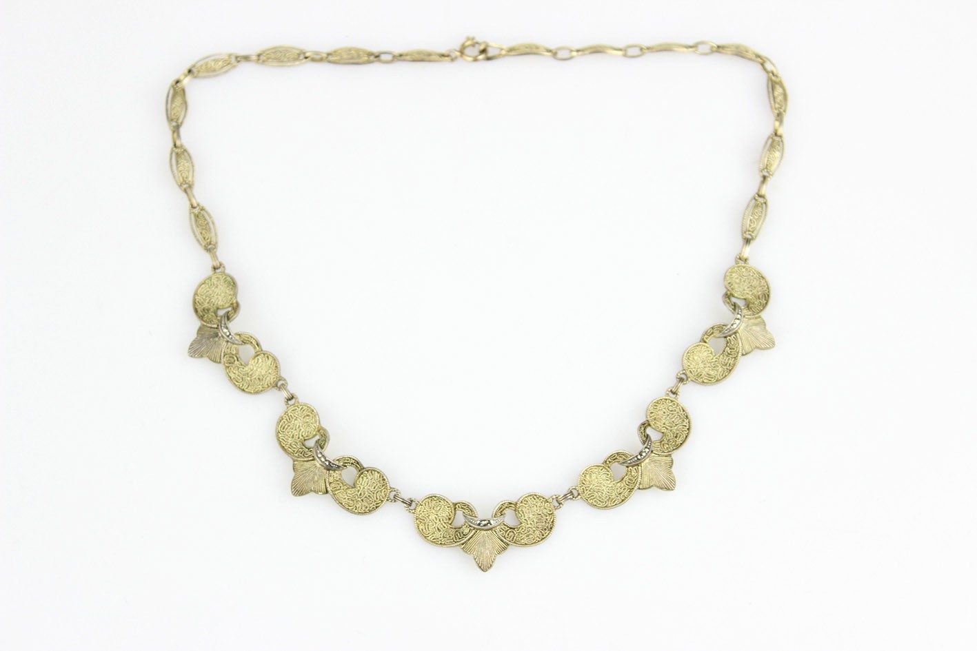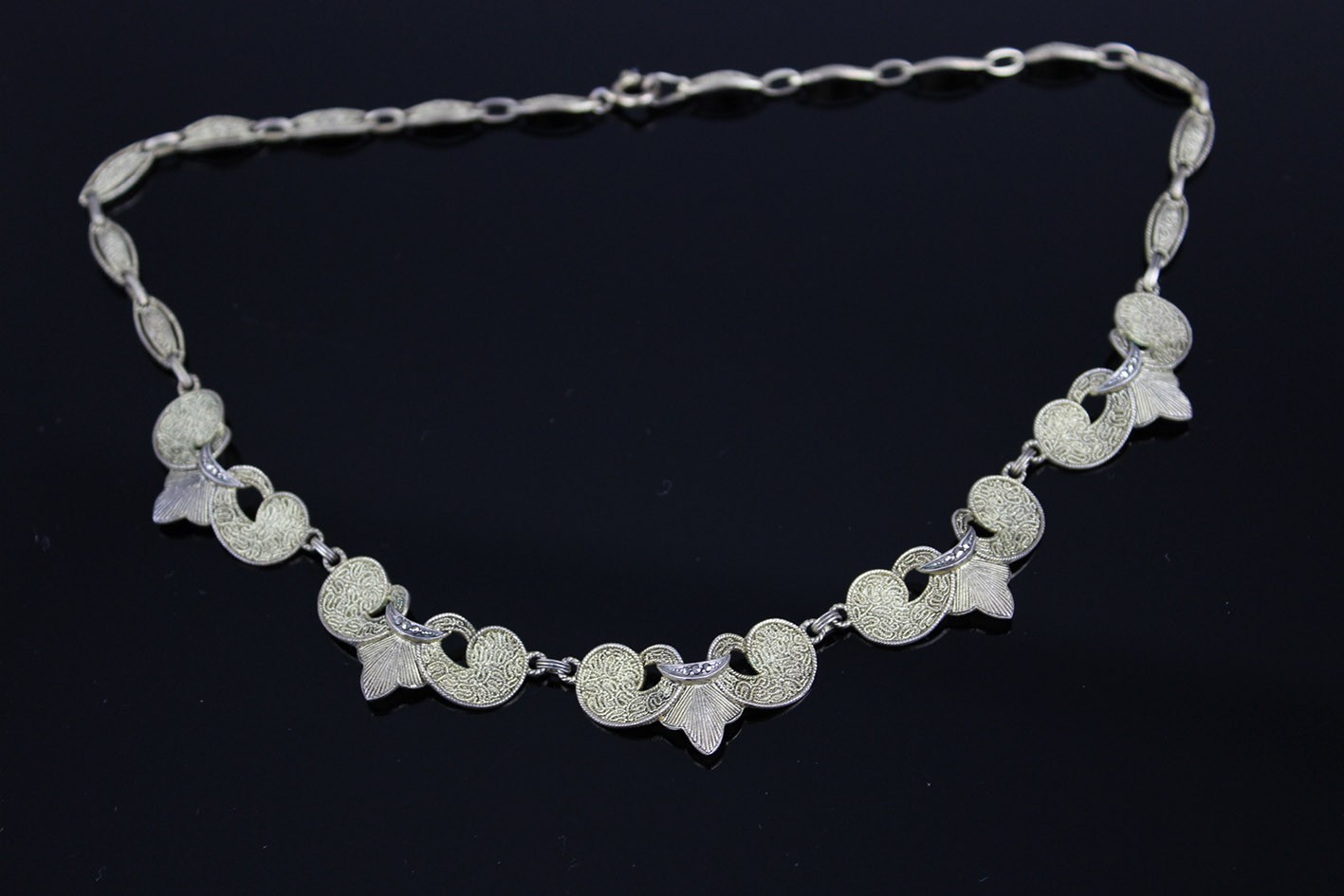 Przedwojenny naszyjnik pochodzący ze znakomitej wytwórni jubilerskiej Theodora Fahrnera. Przedmiot wykonany w złoconym srebrze próby 925 zdobiony charakterystycznym motywem "ślimaczków" i kameryzowany markazytami. Naszyjnik sygnowany puncą ORIGINAL FAHRNER oraz 925 TF w kółku. Stan zachowania bardzo dobry. Wymiary: