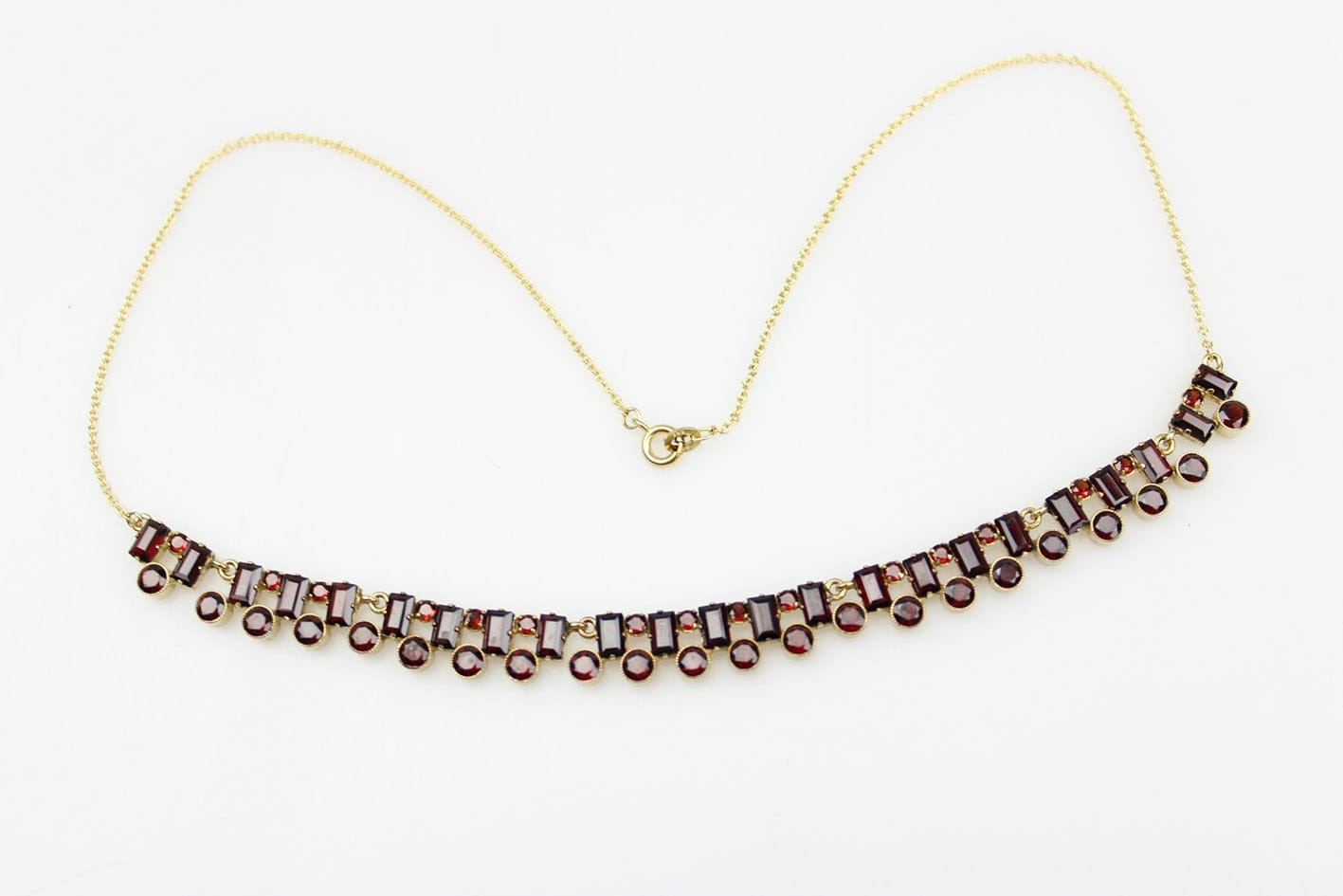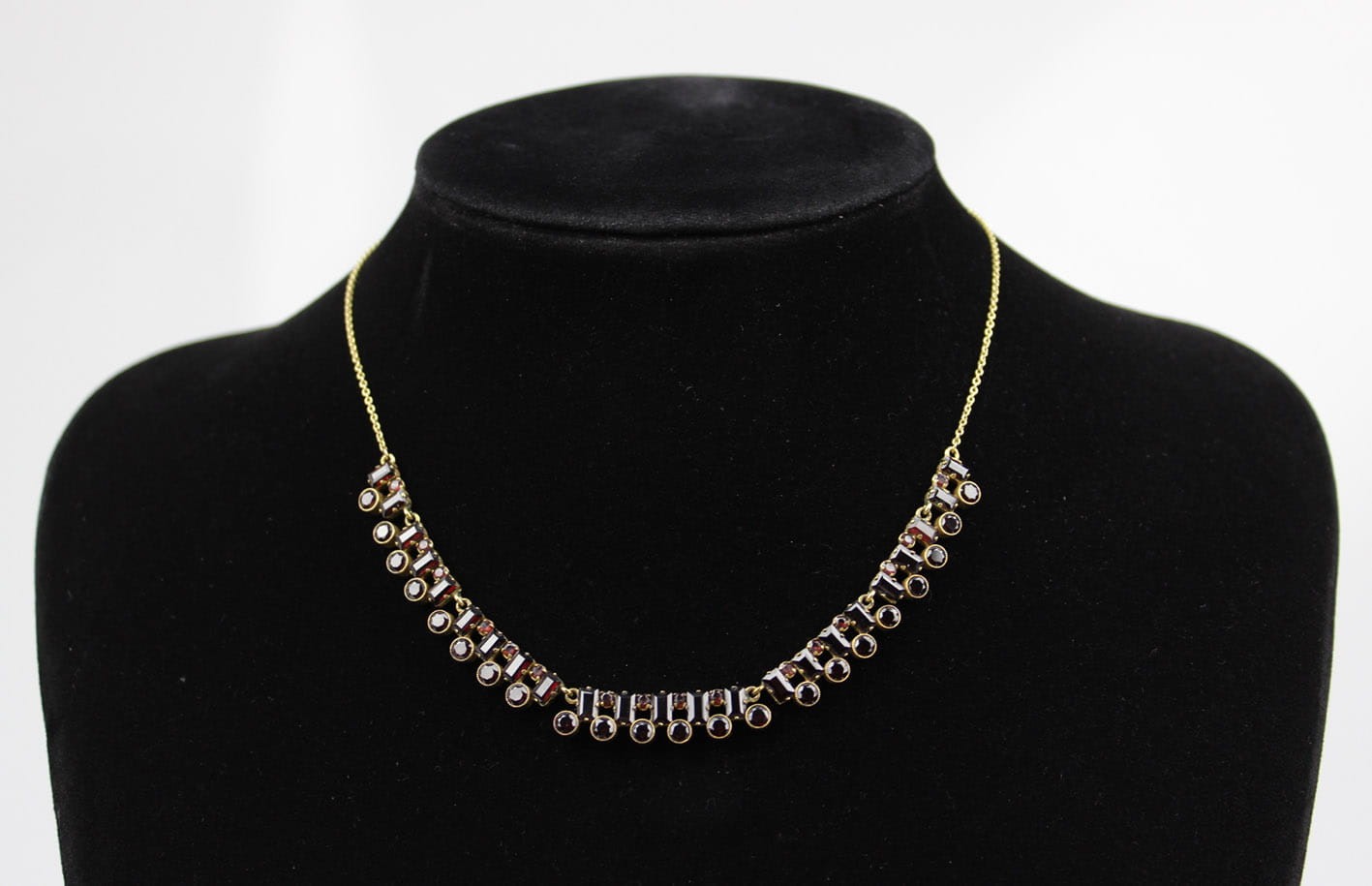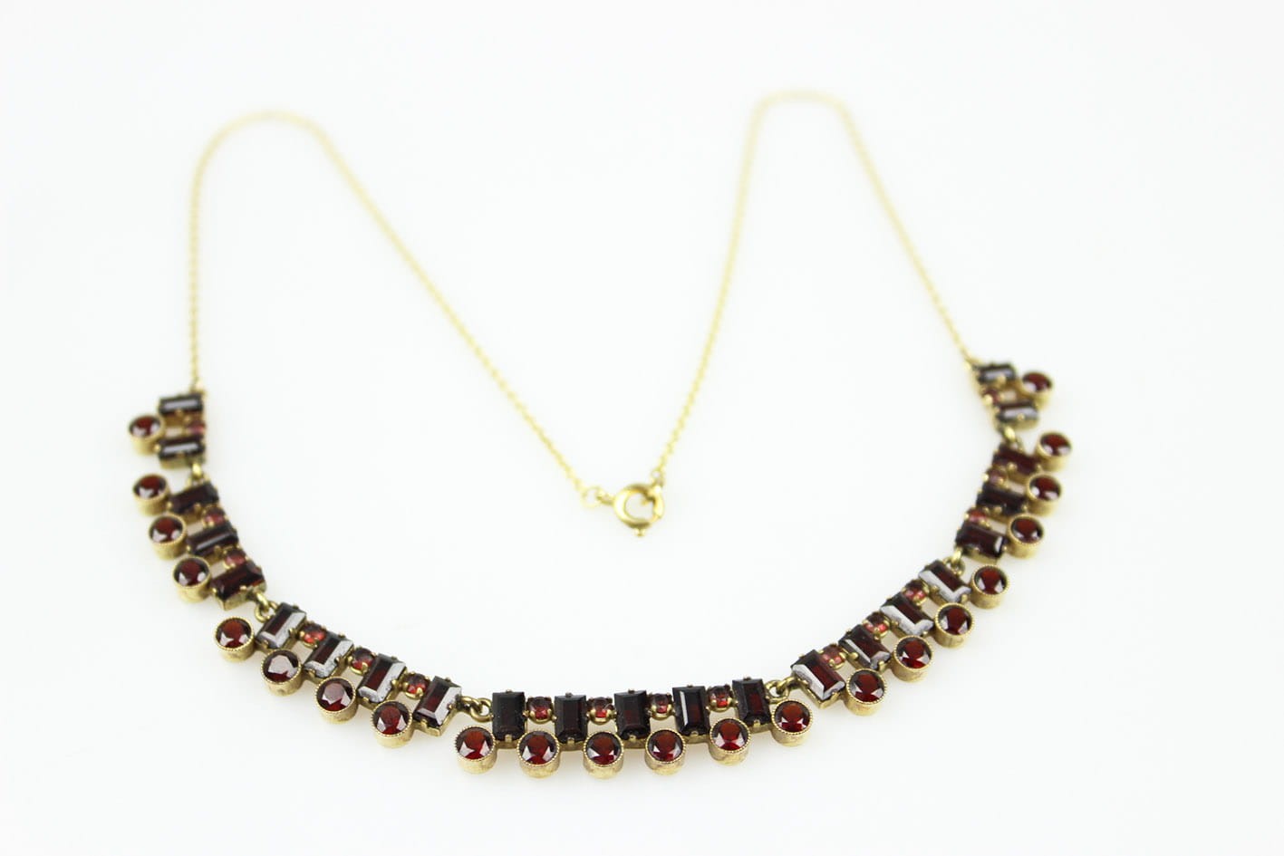 Elegancki złoty naszyjnik z lat 30-tych XX wieku. Konstrukcja w złocie próby 333 składająca się z siedmiu ruchomych elementów kameryzowanych kilkudziesięcioma naturalnymi granatami. Wyrób w bardzo dobrym stanie zachowania. Kamienie w komplecie. Wymiary :