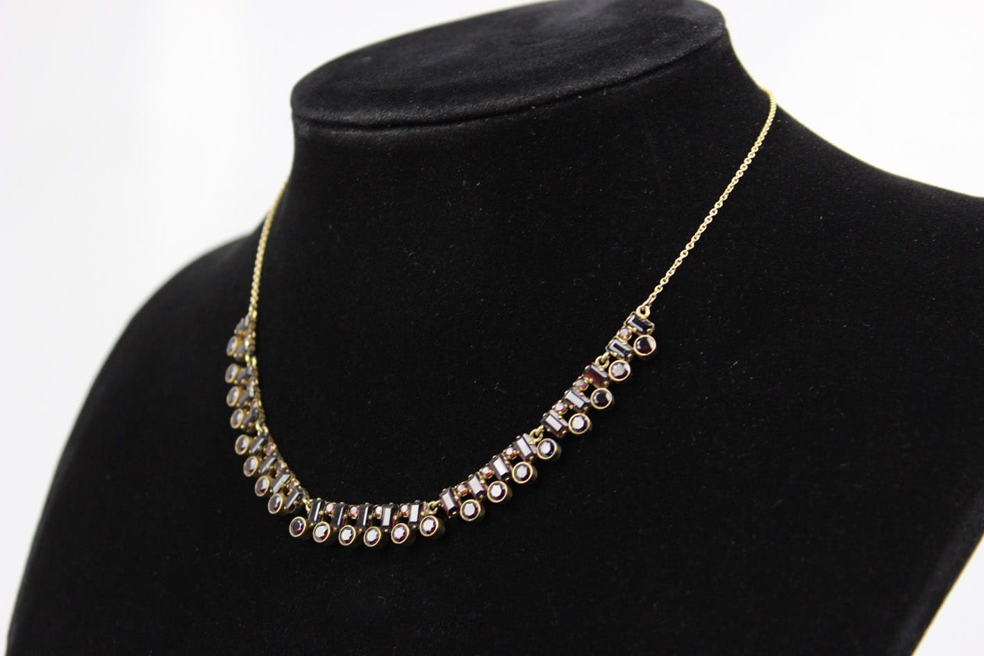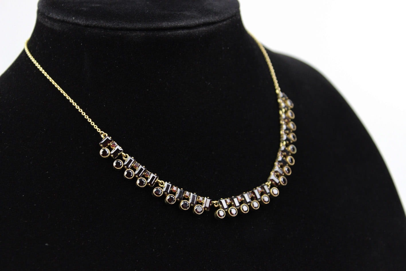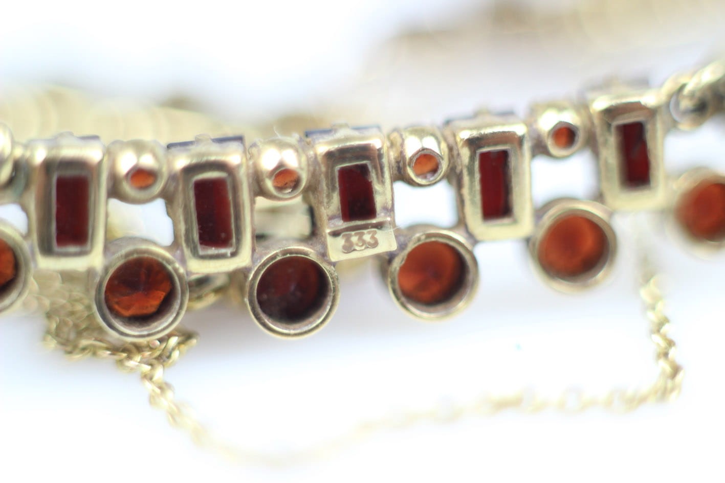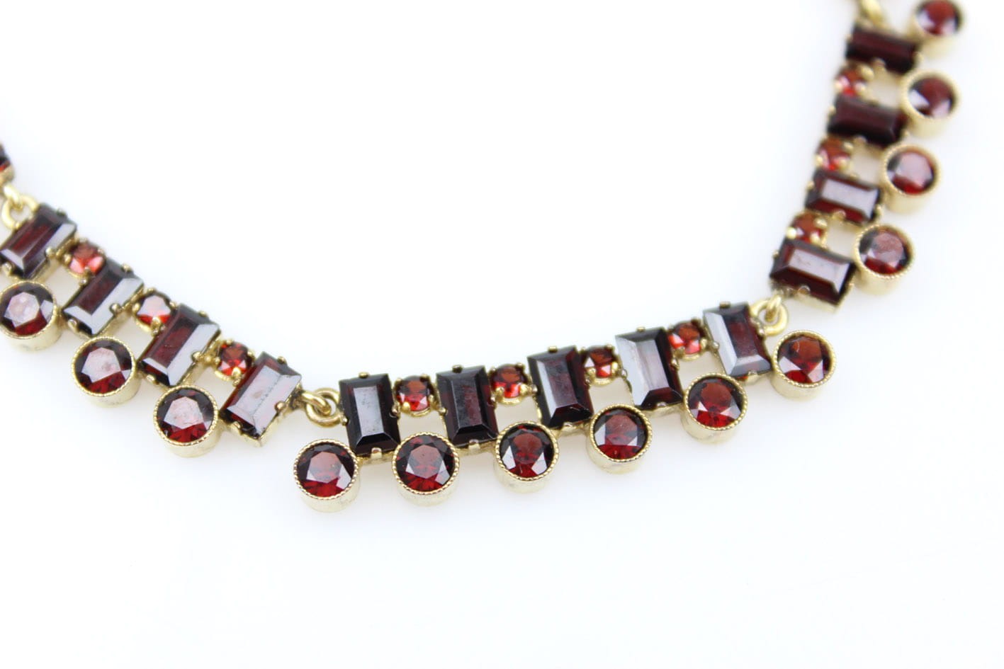 Elegancki złoty naszyjnik z lat 30-tych XX wieku. Konstrukcja w złocie próby 333 składająca się z siedmiu ruchomych elementów kameryzowanych kilkudziesięcioma naturalnymi granatami. Wyrób w bardzo dobrym stanie zachowania. Kamienie w komplecie. Wymiary :