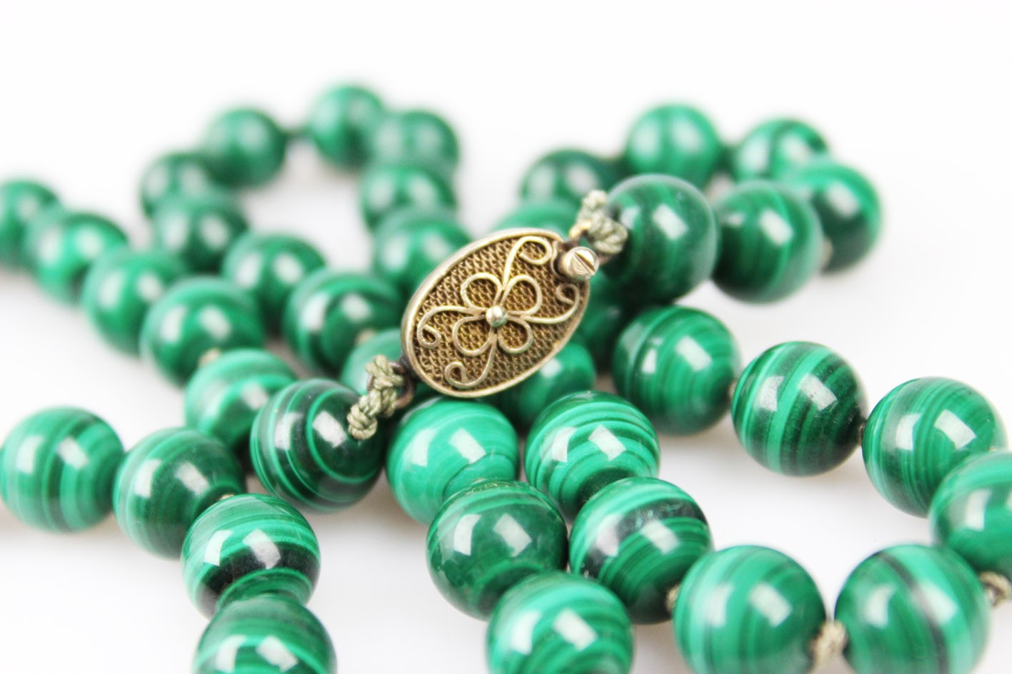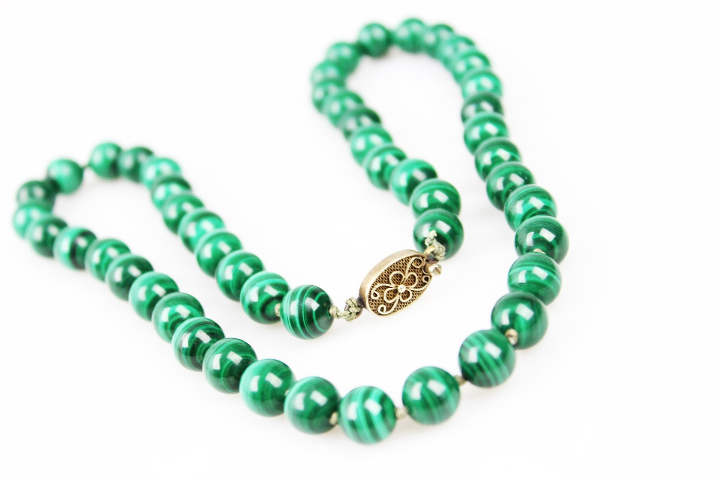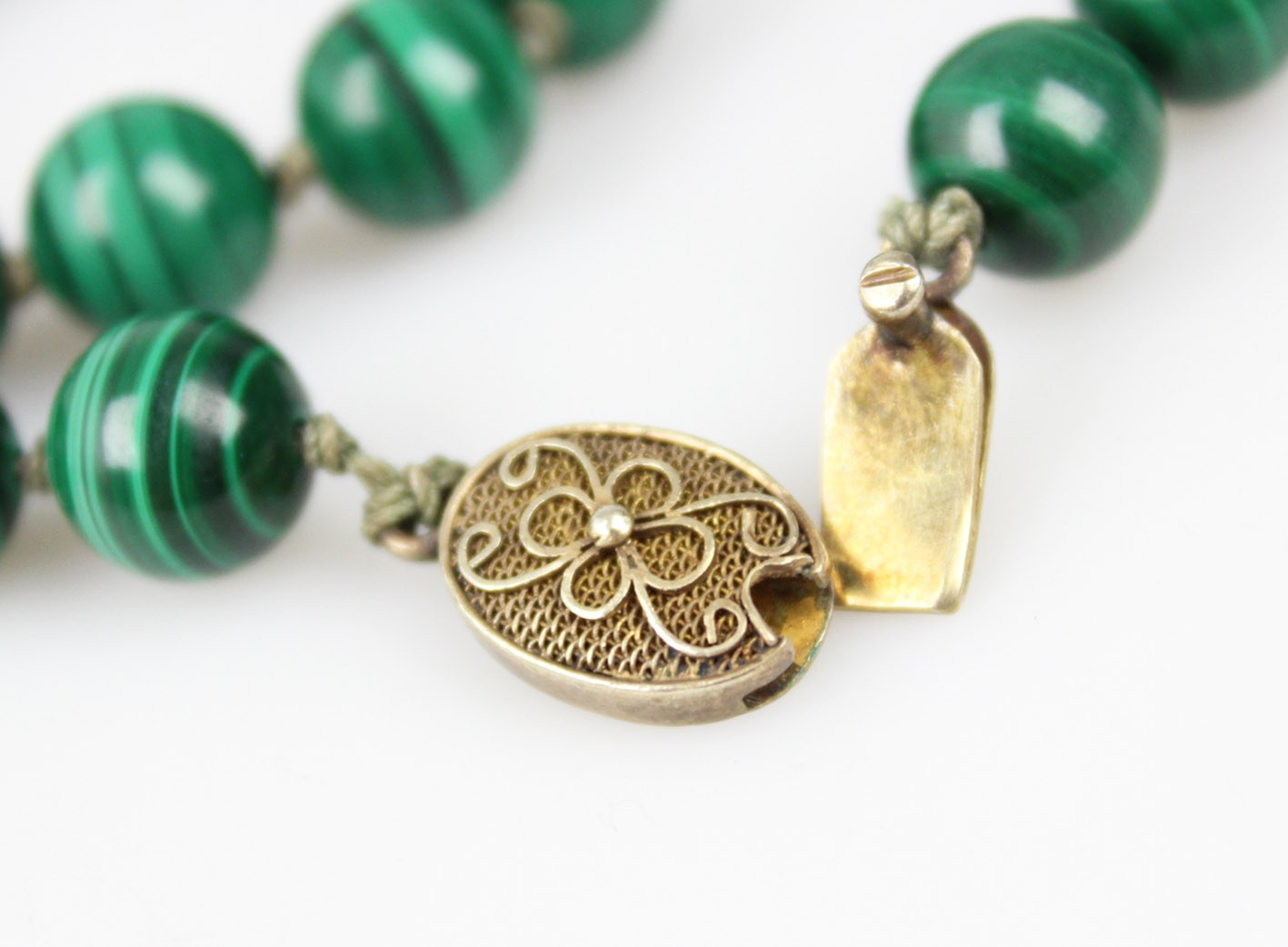 Naszyjnik typu chinka, wykonany z kulistych paciorków naturalnego malachitu o wyraźnym, pasmowym rysunku i intensywnej zielonej barwie. Kamienie nawleczone tradycyjnie z drobnymi węzłami pomiędzy paciorkami, co podkreśla ręczny charakter wyrobu i zabezpiecza naszyjnik w użytkowaniu. Zapięcie szufladkowe, wykonane w srebrze złoconym, bogato zdobione filigranem o motywie roślinnym, charakterystycznym dla wyrobów orientalnych. Całość utrzymana w klasycznej, eleganckiej formie, typowej dla biżuterii chińskiej. Stan zachowania bardzo dobry, malachit bez pęknięć i wyszczerbień, zapięcie sprawne, z naturalną patyną wynikającą z wieku. Wymiary: