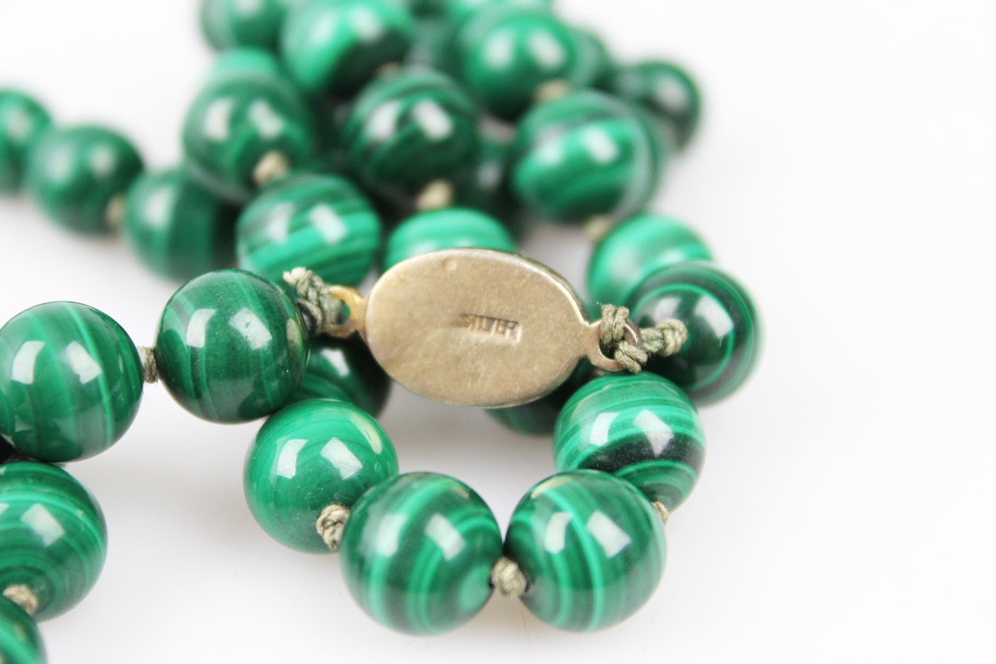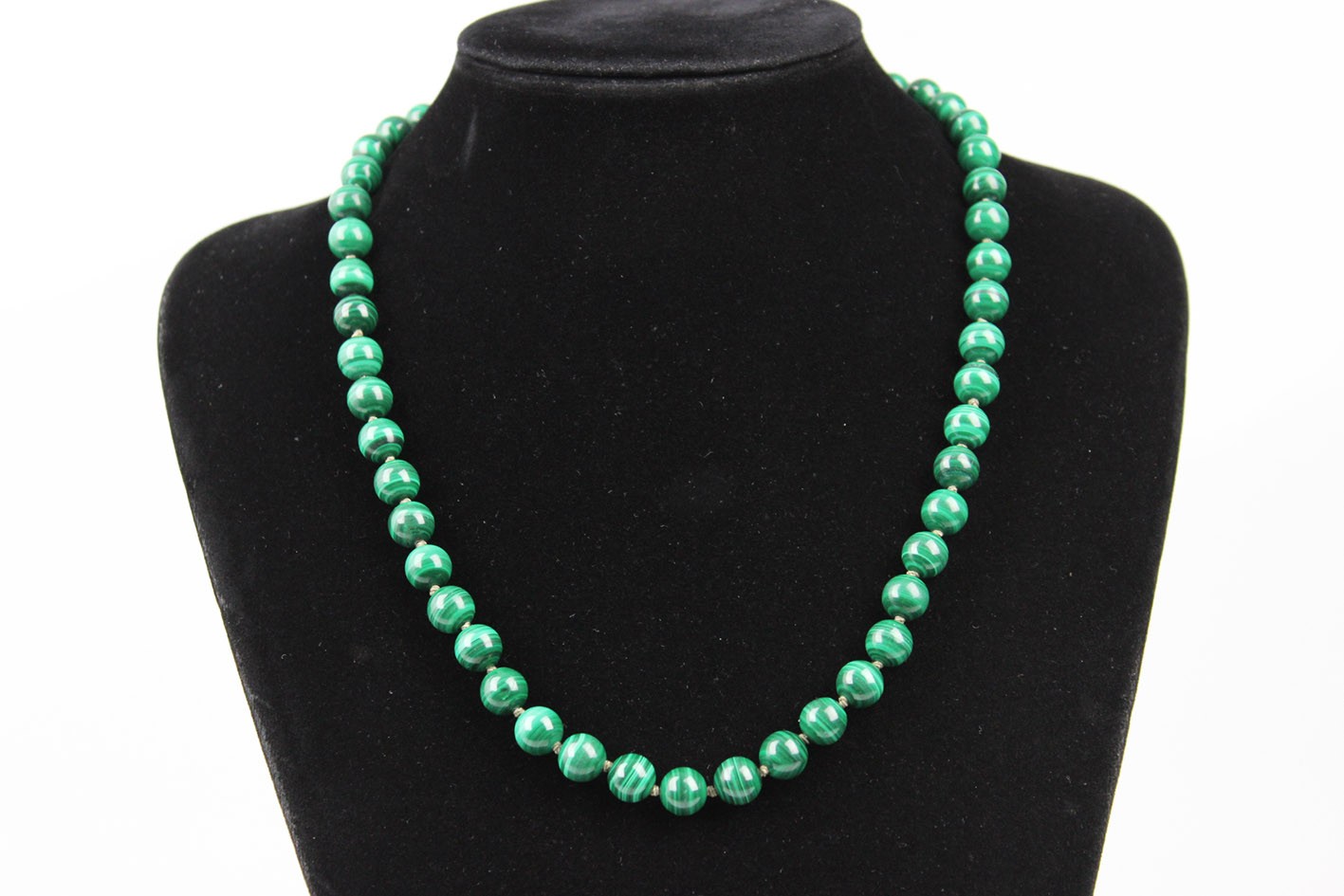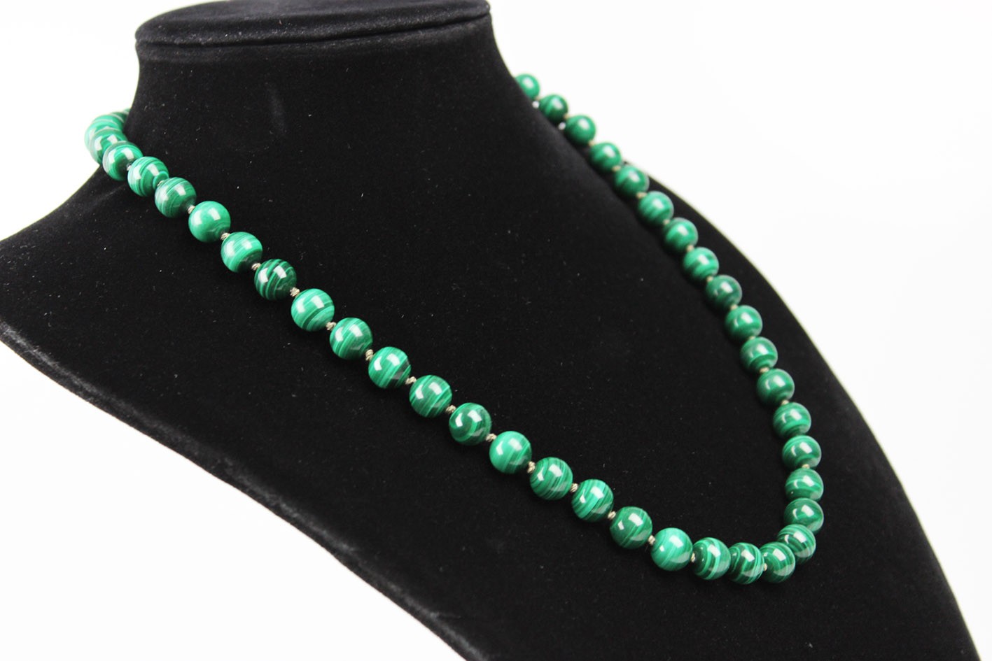 Naszyjnik typu chinka, wykonany z kulistych paciorków naturalnego malachitu o wyraźnym, pasmowym rysunku i intensywnej zielonej barwie. Kamienie nawleczone tradycyjnie z drobnymi węzłami pomiędzy paciorkami, co podkreśla ręczny charakter wyrobu i zabezpiecza naszyjnik w użytkowaniu. Zapięcie szufladkowe, wykonane w srebrze złoconym, bogato zdobione filigranem o motywie roślinnym, charakterystycznym dla wyrobów orientalnych. Całość utrzymana w klasycznej, eleganckiej formie, typowej dla biżuterii chińskiej. Stan zachowania bardzo dobry, malachit bez pęknięć i wyszczerbień, zapięcie sprawne, z naturalną patyną wynikającą z wieku. Wymiary: