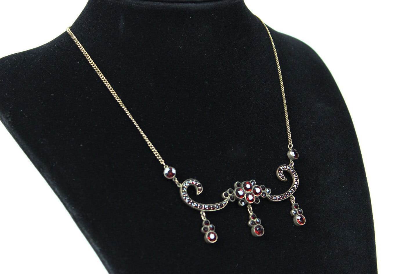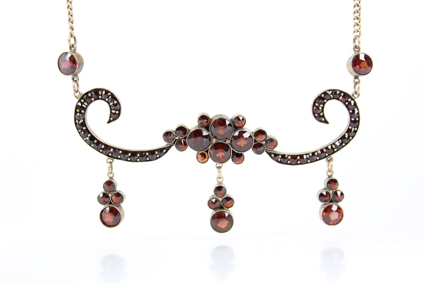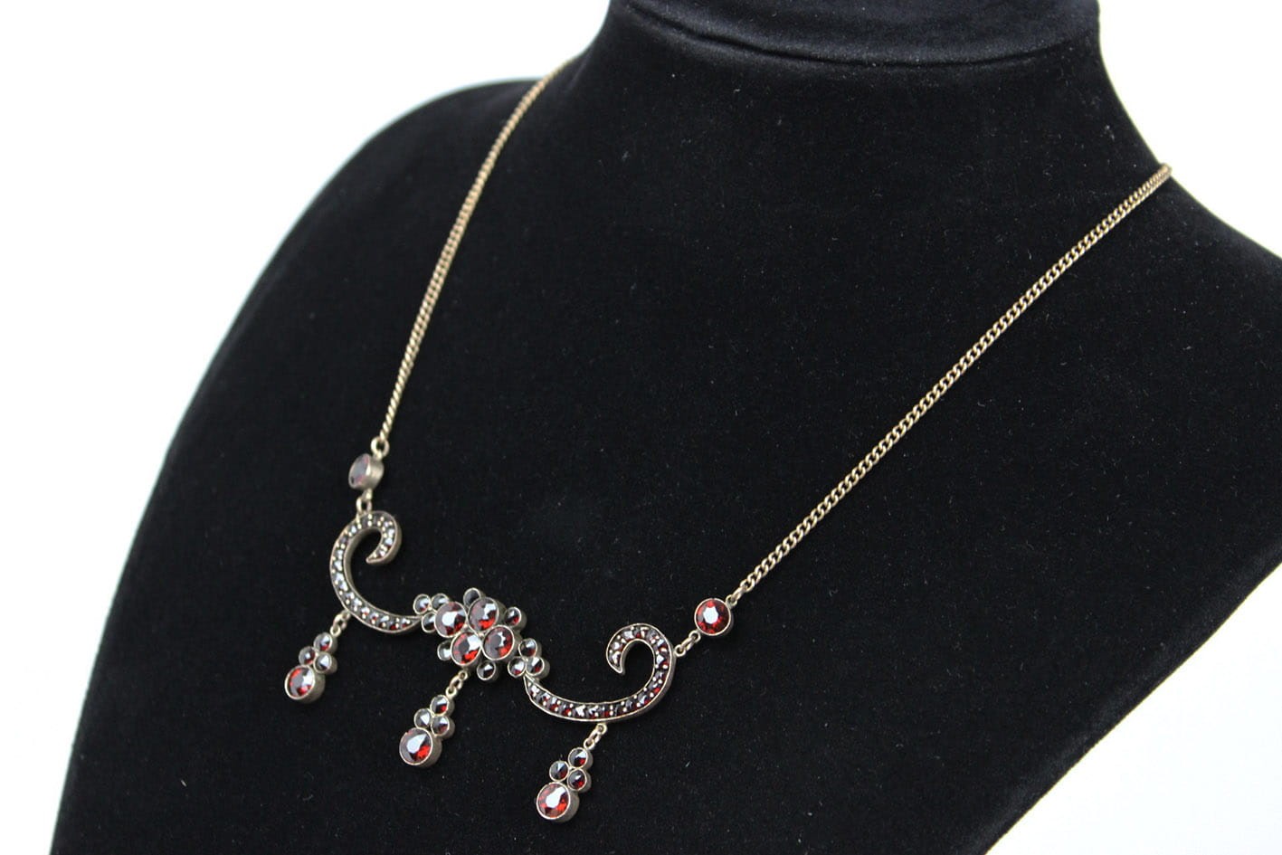 Oryginalny XIX wieczny naszyjnik kameryzowany granatami. Wyrób miękko opierający się na dekolcie i przyciągający na niego wzrok. Przedmiot wykonany na terenie Niemiec lub Austrii. Podstawa w złoconym tombaku, kamienie naturalne. Całość w bardzo dobrym stanie zachowania. Wymiary: