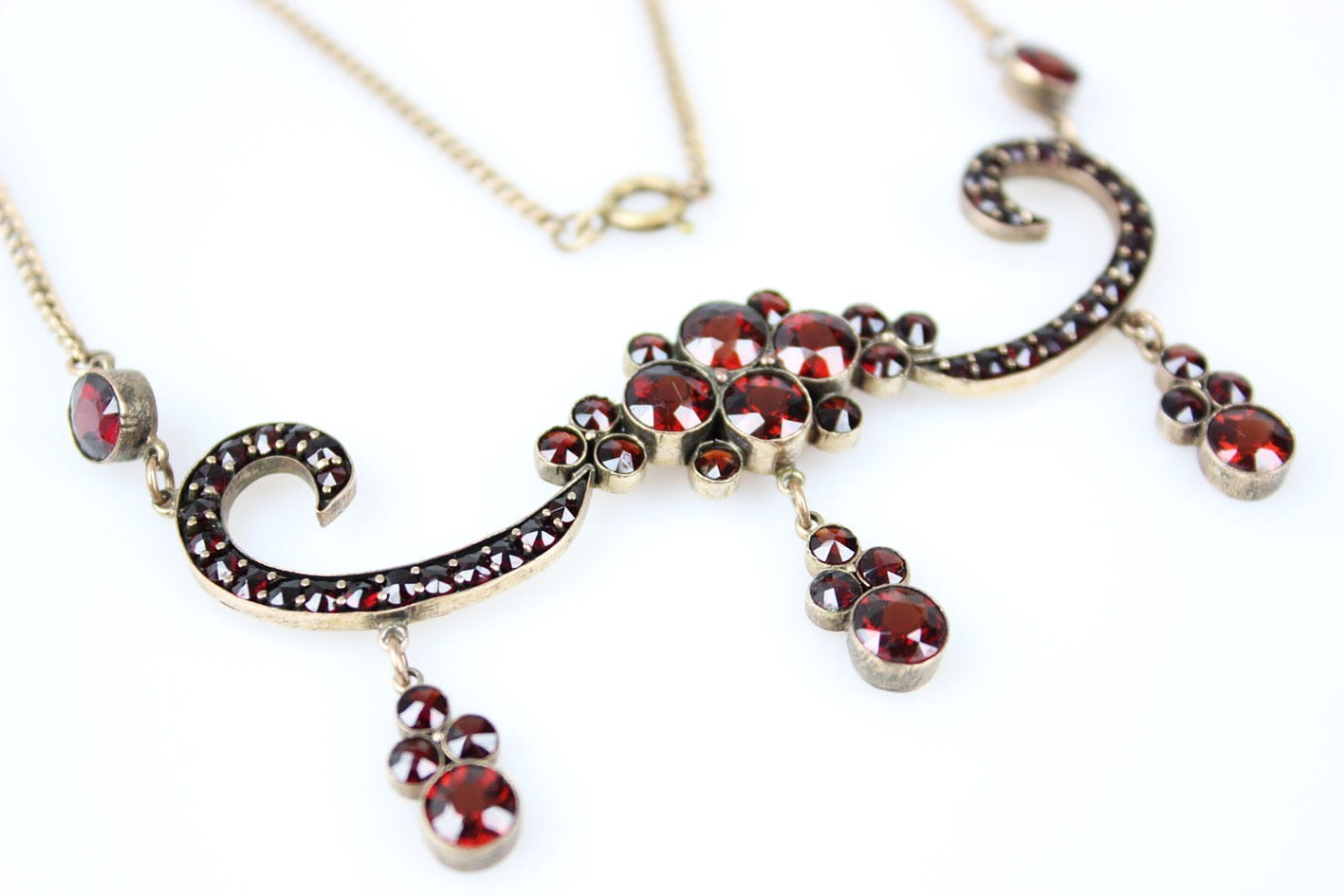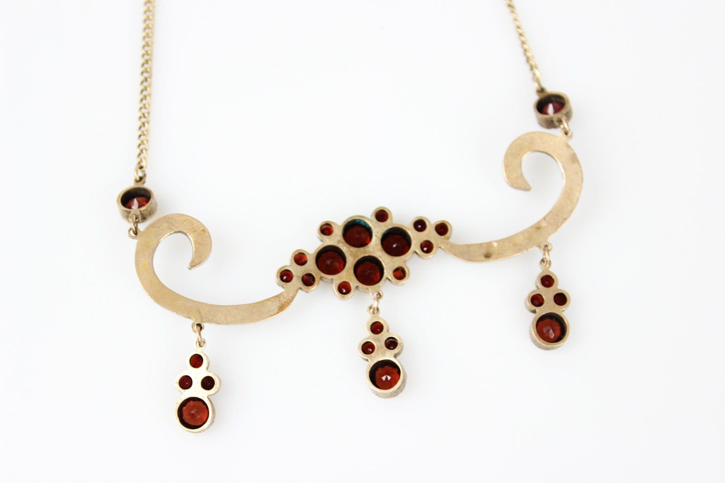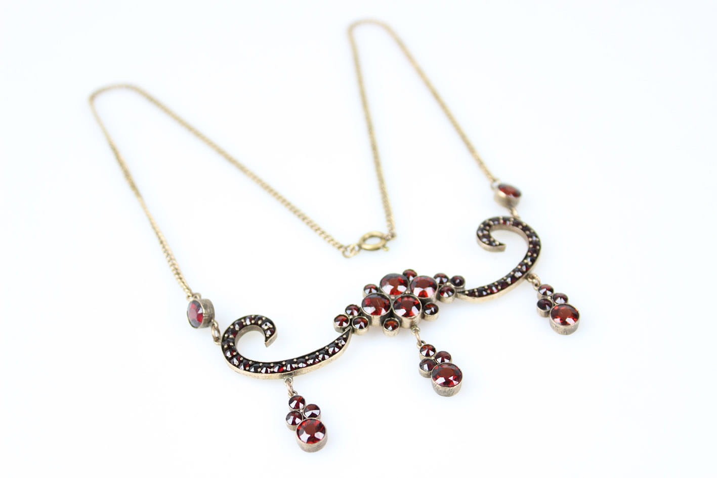 Oryginalny XIX wieczny naszyjnik kameryzowany granatami. Wyrób miękko opierający się na dekolcie i przyciągający na niego wzrok. Przedmiot wykonany na terenie Niemiec lub Austrii. Podstawa w złoconym tombaku, kamienie naturalne. Całość w bardzo dobrym stanie zachowania. Wymiary: