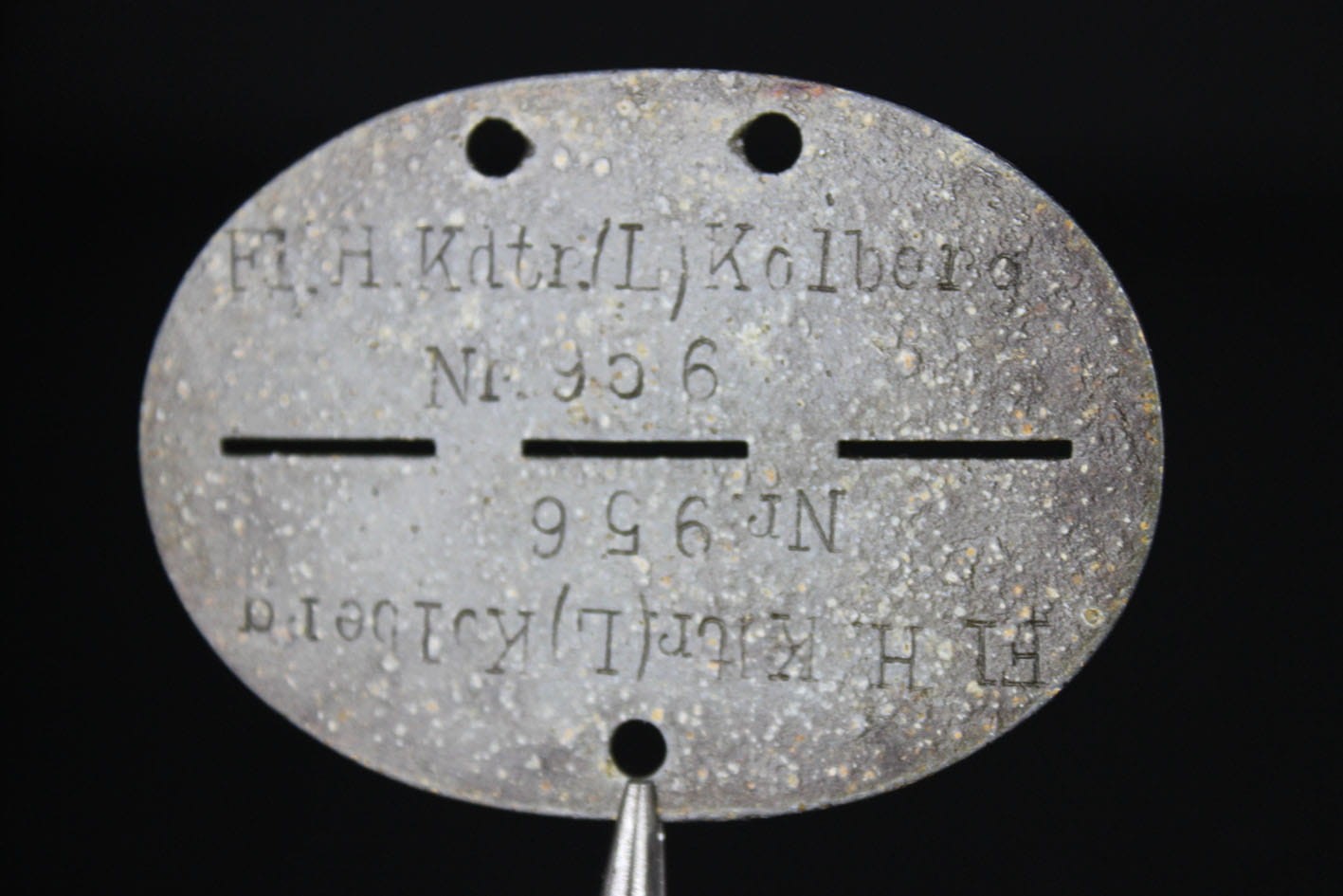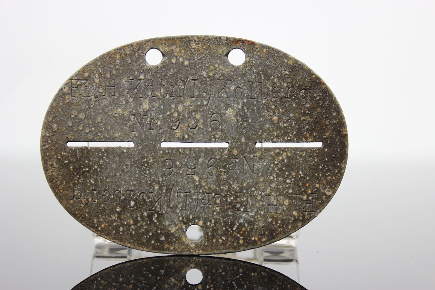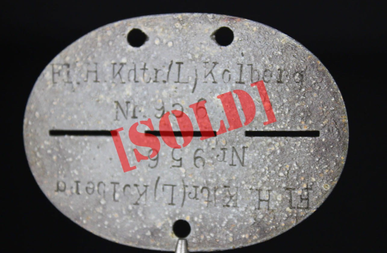 Oryginalny identyfikator żołnierza z administracji lotniska w Kołobrzegu a dokładnie ze wsi Bodenhagen/Bagicz- (miejscowość ta została niemal w całości zlikwidowana w 1935 roku pod budowę lotniska). Nieśmiertelnik wybijany w dwóch rzędach: Fl.H.Kdtr.(L).Kolberg Fliegerhorst Kommandantur Leit Kolberg . Numer żołnierza 956. Żeton cynkowy.