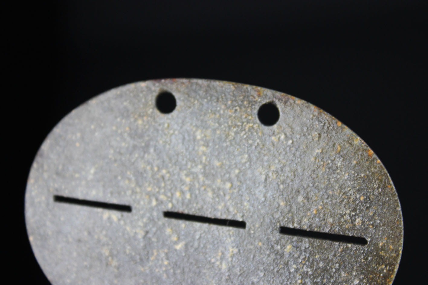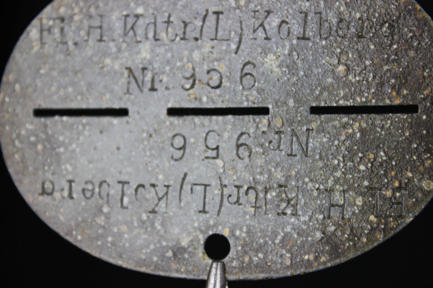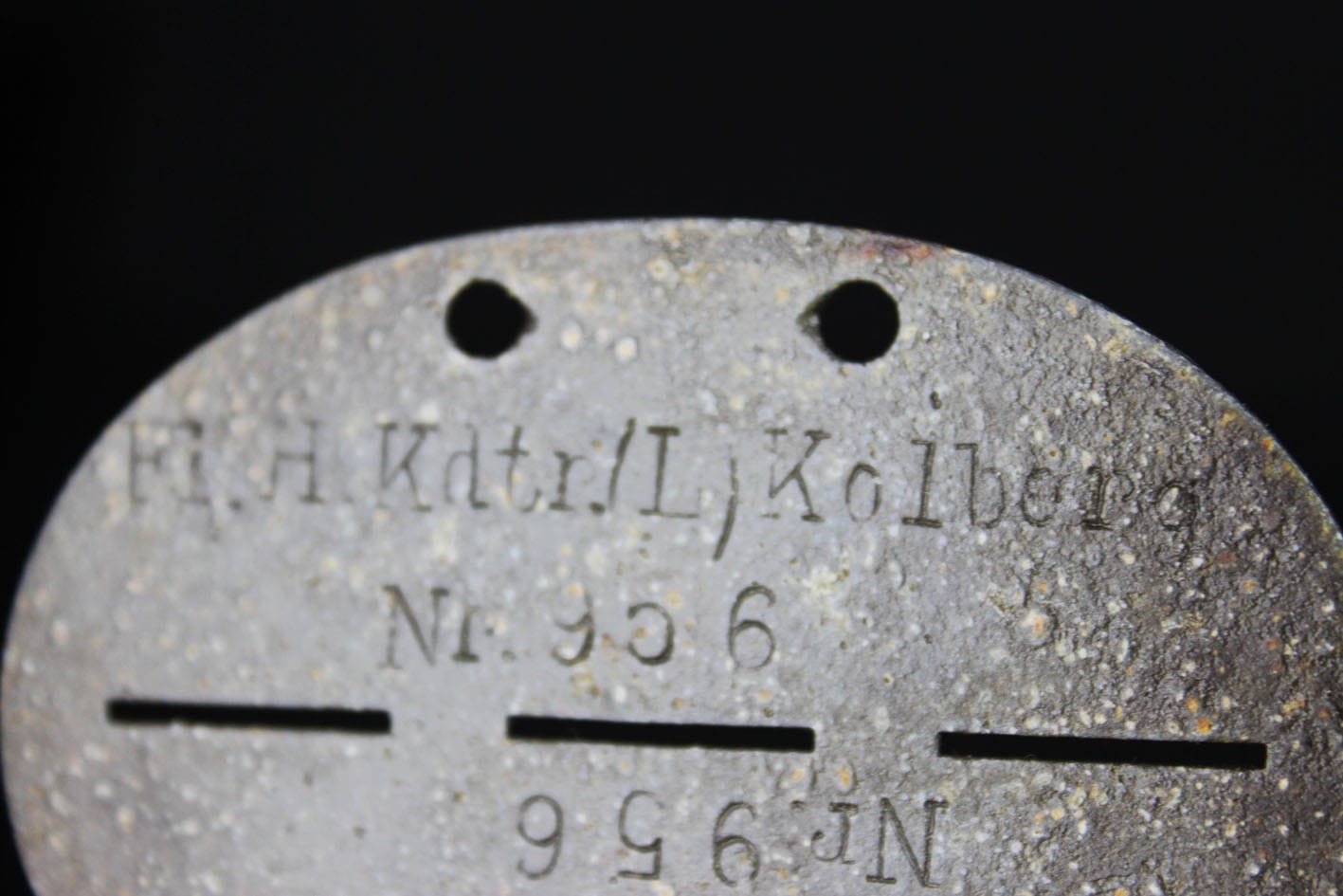 Oryginalny identyfikator żołnierza z administracji lotniska w Kołobrzegu a dokładnie ze wsi Bodenhagen/Bagicz- (miejscowość ta została niemal w całości zlikwidowana w 1935 roku pod budowę lotniska). Nieśmiertelnik wybijany w dwóch rzędach: Fl.H.Kdtr.(L).Kolberg Fliegerhorst Kommandantur Leit Kolberg . Numer żołnierza 956. Żeton cynkowy.