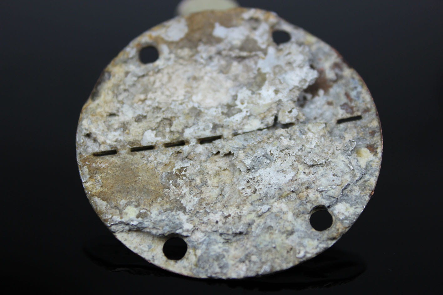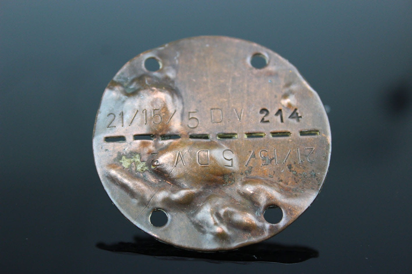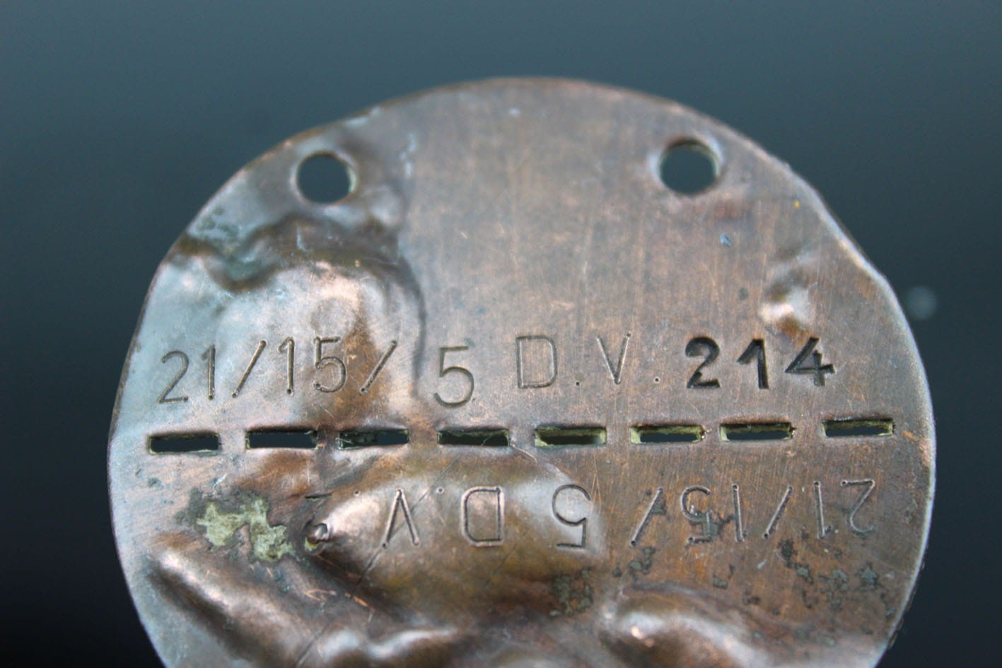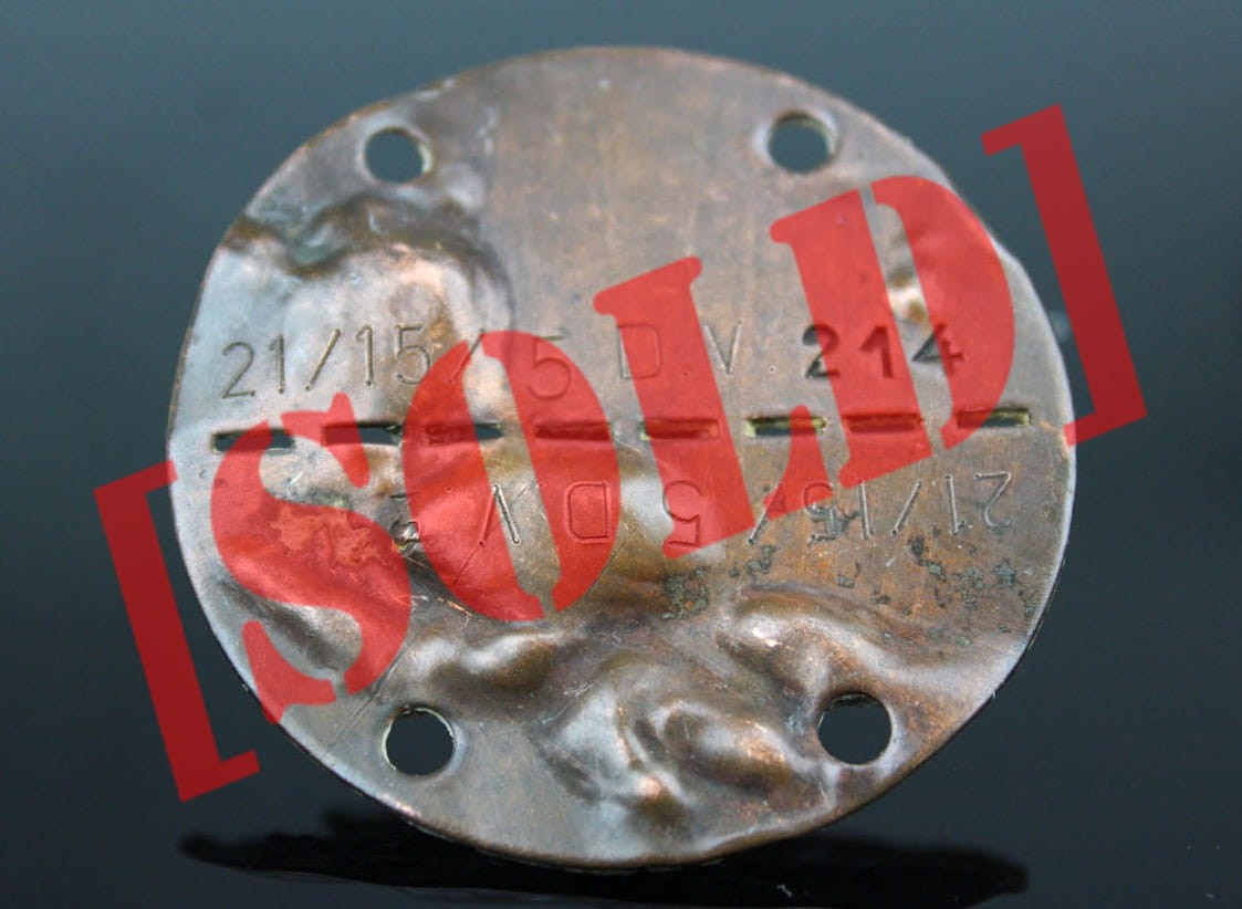 Autentyczny, niezwykle rzadko występujący na rynku kolekcjonerskim nieśmiertelnik żołnierza z Deutscher Volkssturm formacji o charakterze pospolitego ruszenia powołanego dekretem podpisanym przez Adolfa Hitlera 25 września 1944 r. Znak z 5 kompanii 15. Dolnośląskiego Batalionu Volkssturmu stacjonującego w Kłodzku. Identyfikator wykonany z cupalu (kupal), czyli walcowanej miedzi i aluminium. Awers miejscami spuchnięty z powodu utleniającego się na rewersie aluminium. Dokładnie to co na fotografiach. Żeton nietypowy z czterema otworami na sznurek perforowany na środku w celu łatwiejszego przełamania po śmierci żołnierza. Średnica żetonu: 52mm