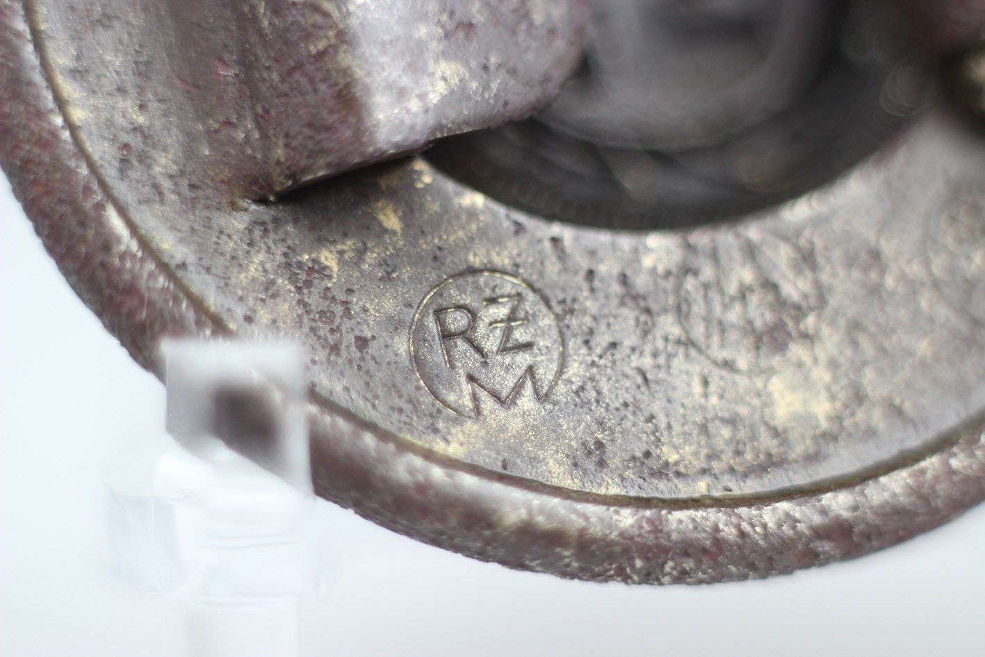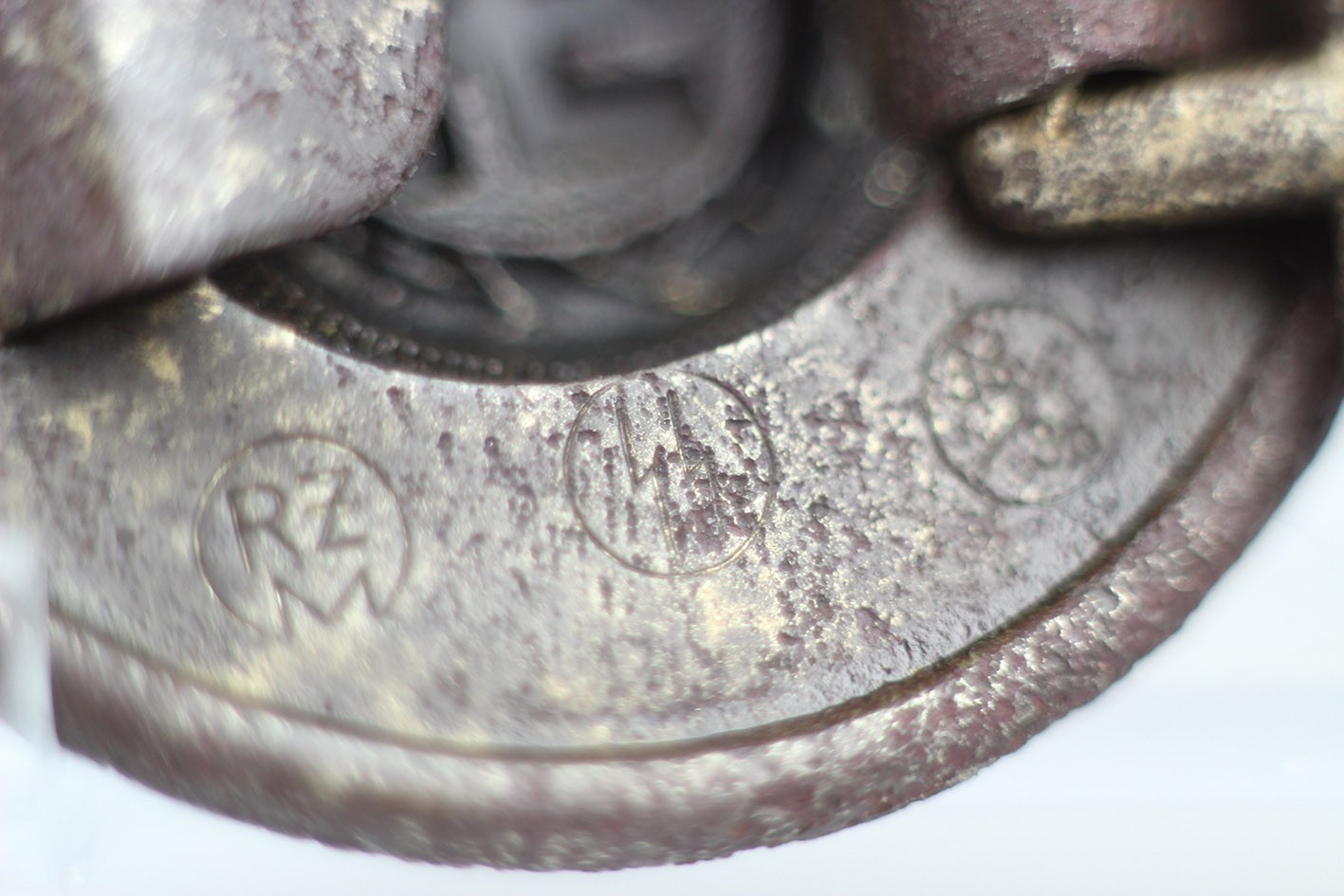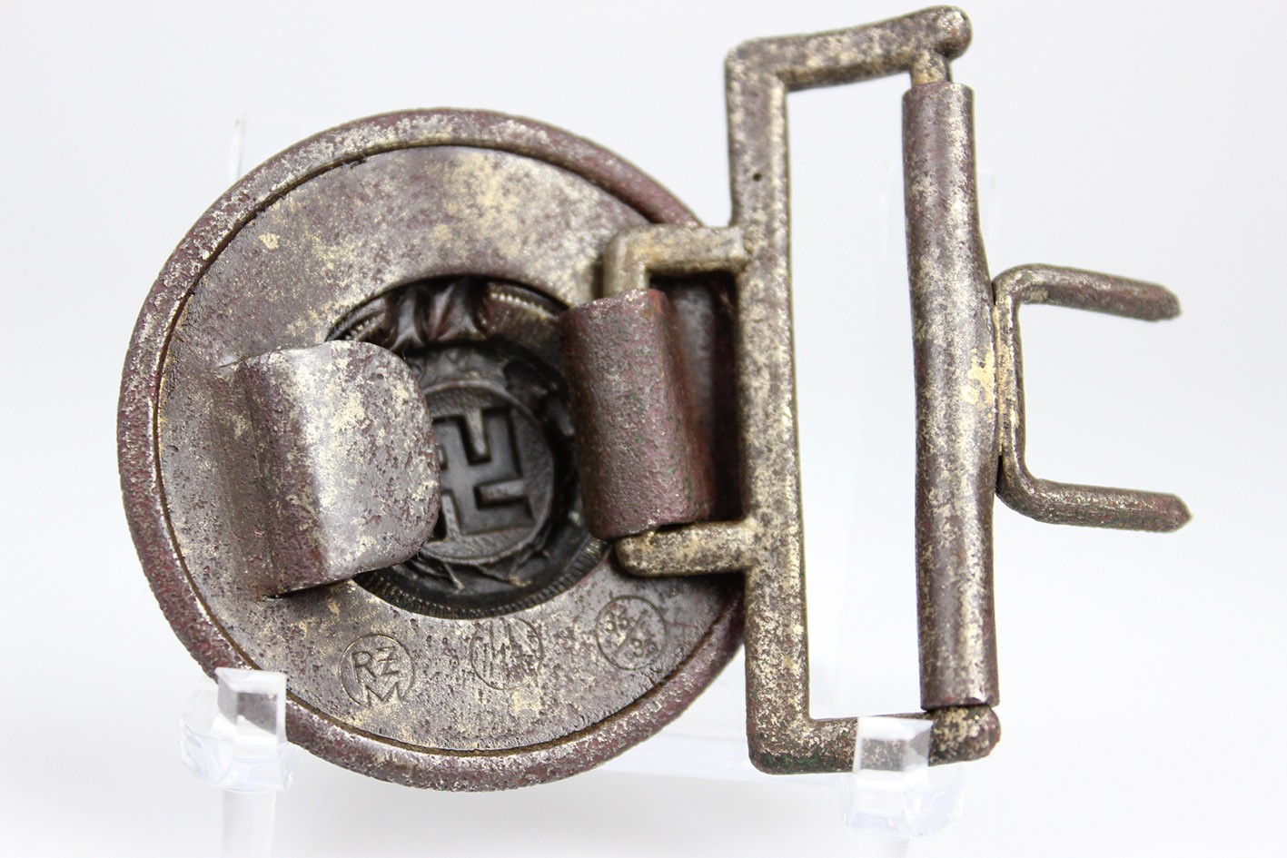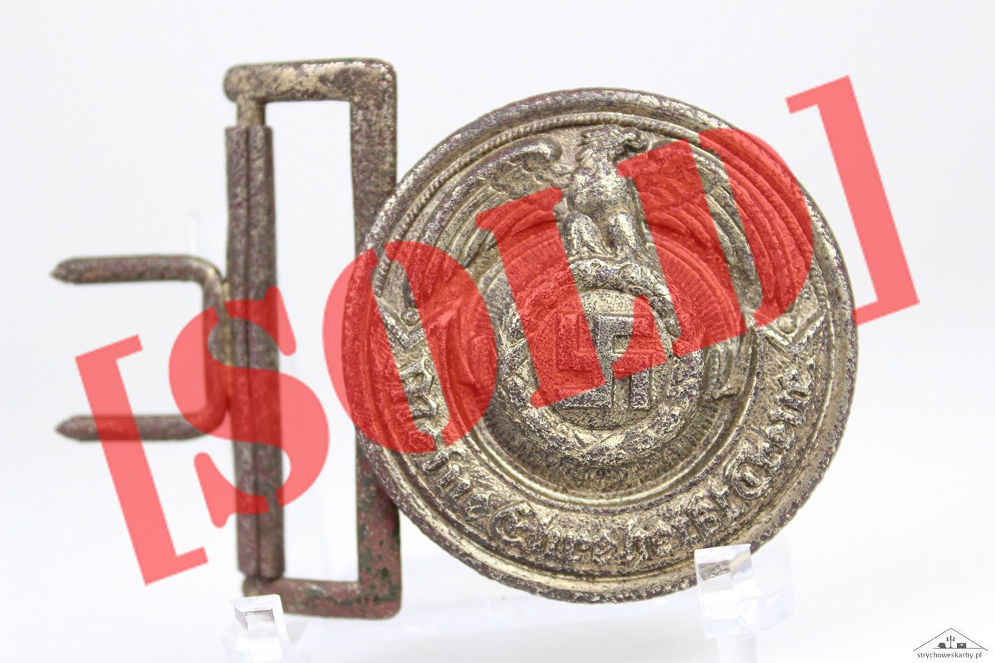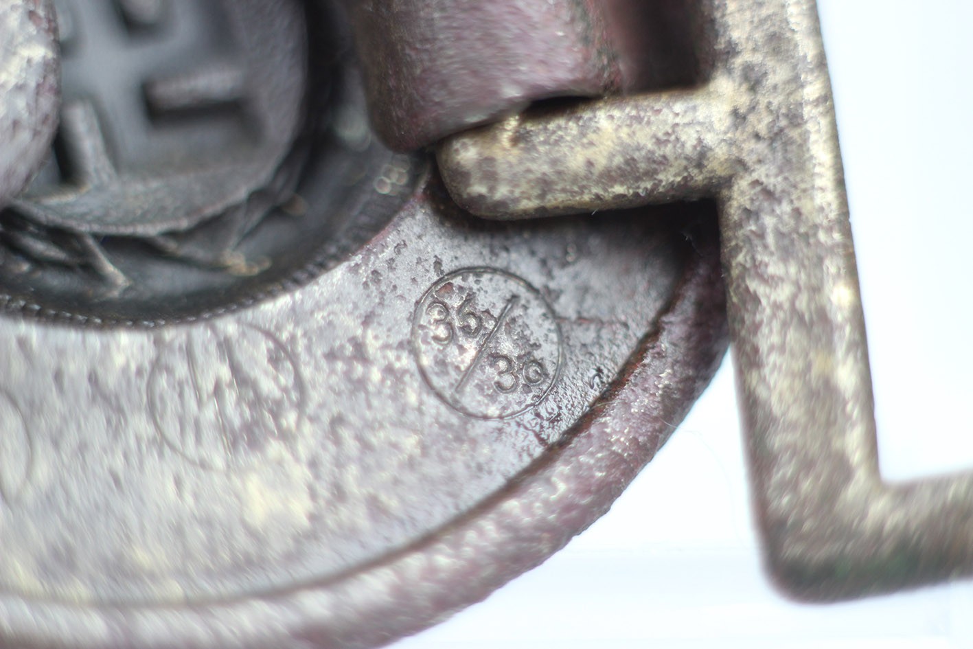 Oryginalna, wczesna klamra oficerska SS wykonana z alpaki, znanej również jako „neusilber”. Klamra, oznaczona kodem RZM SS 36/36, została wyprodukowana przez firmę Overhoff & Cie. z siedzibą w Lüdenscheid w Niemczech. Firma ta była jednym z głównych dostawców insygniów dla SS i innych formacji paramilitarnych III Rzeszy. Wyrób niezwykle rzadko spotykany na rynku kolekcjonerskim. Stan zachowania dobry, na awersie częściowo pozostało srebrzenie. Dokładnie to co na fotografiach.