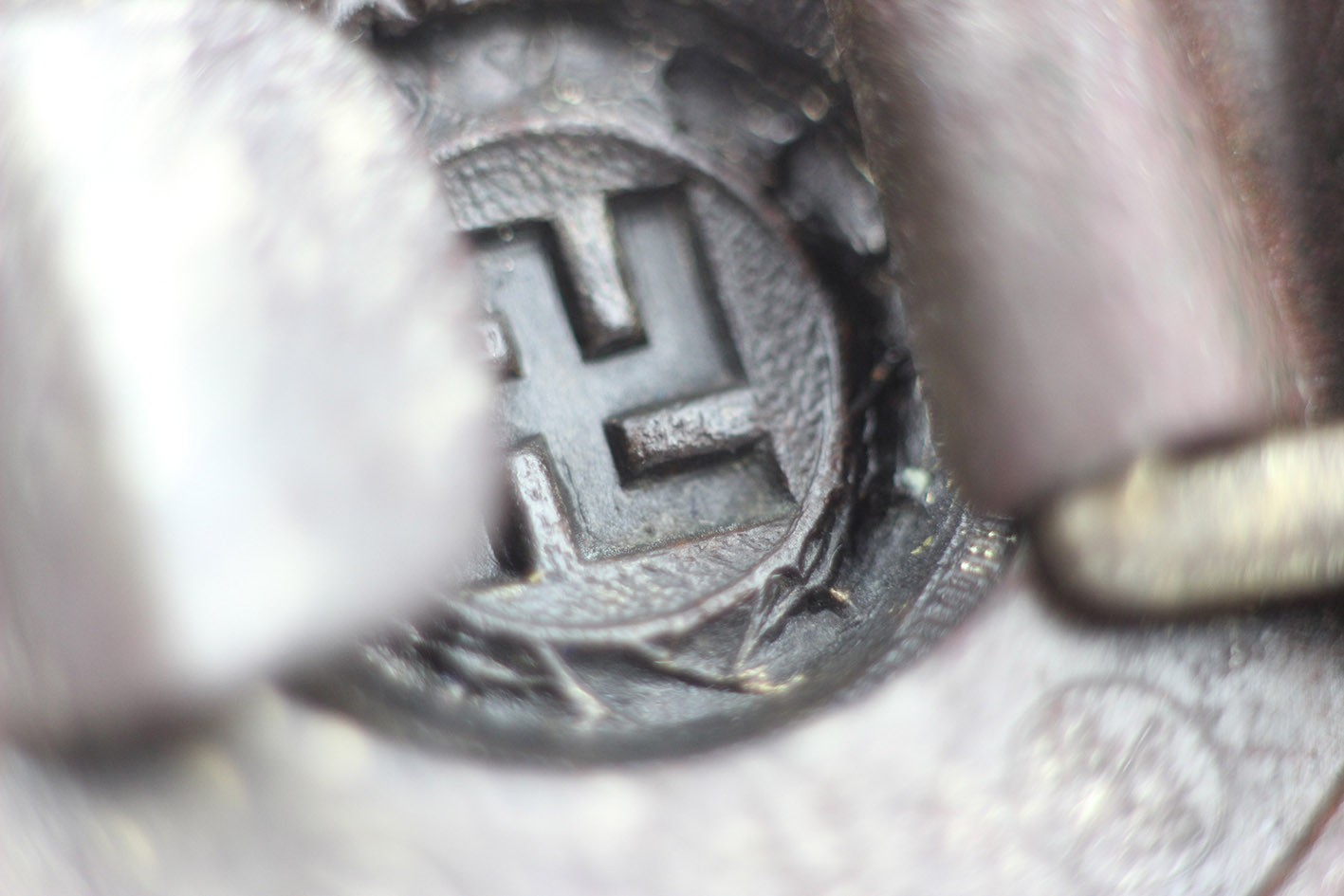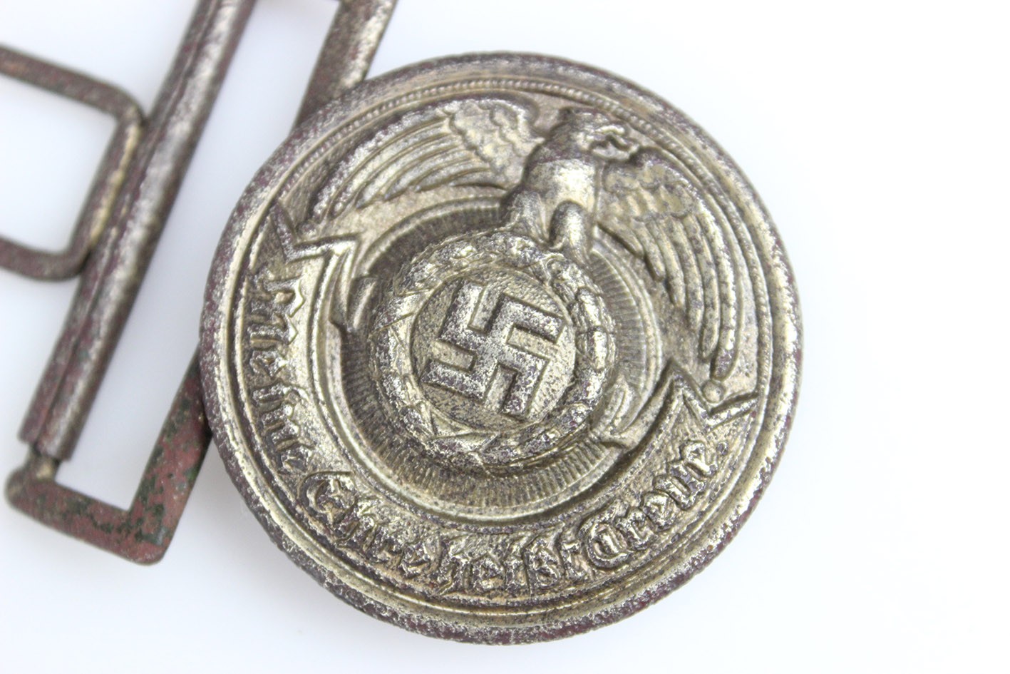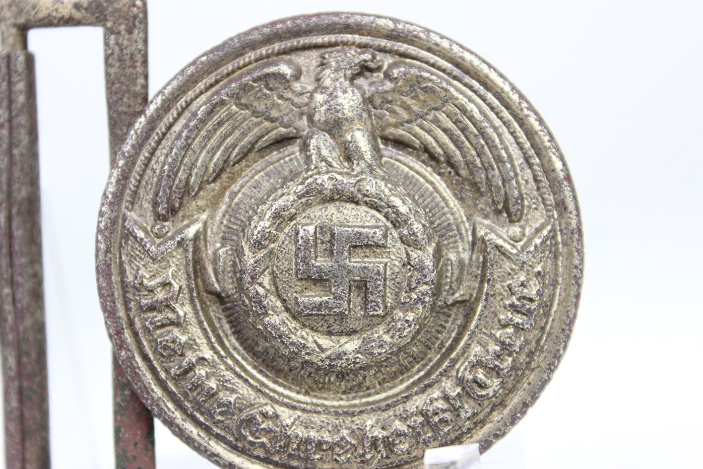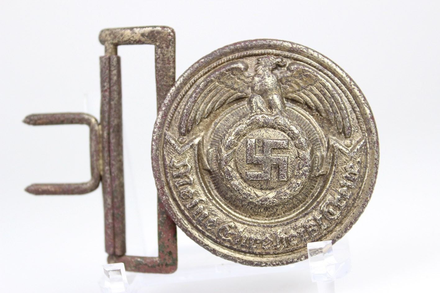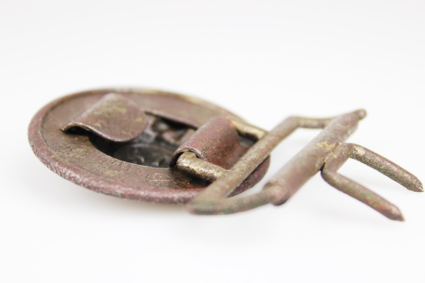 Oryginalna, wczesna klamra oficerska SS wykonana z alpaki, znanej również jako „neusilber”. Klamra, oznaczona kodem RZM SS 36/36, została wyprodukowana przez firmę Overhoff & Cie. z siedzibą w Lüdenscheid w Niemczech. Firma ta była jednym z głównych dostawców insygniów dla SS i innych formacji paramilitarnych III Rzeszy. Wyrób niezwykle rzadko spotykany na rynku kolekcjonerskim. Stan zachowania dobry, na awersie częściowo pozostało srebrzenie. Dokładnie to co na fotografiach.