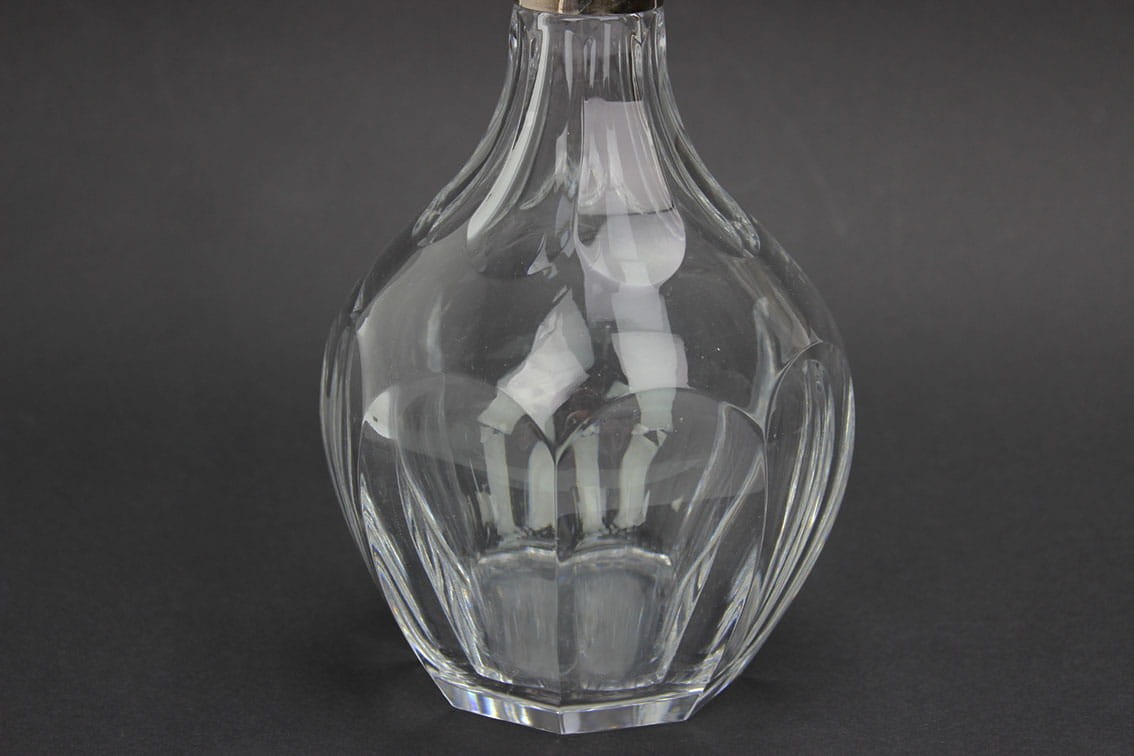 Efektowna, stara karafka do kolorowych trunków. Przedmiot powstał w Niemczech w latach 30-tych XX wieku. Górna część szyjki okuwana srebrem próby 925. Całość w bardzo dobrym stanie zachowania z delikatna patynką. Karafka bez jakichkolwiek pęknięć czy wyszczerbień. Wymiary: