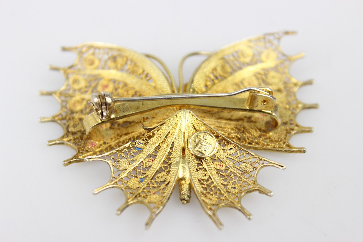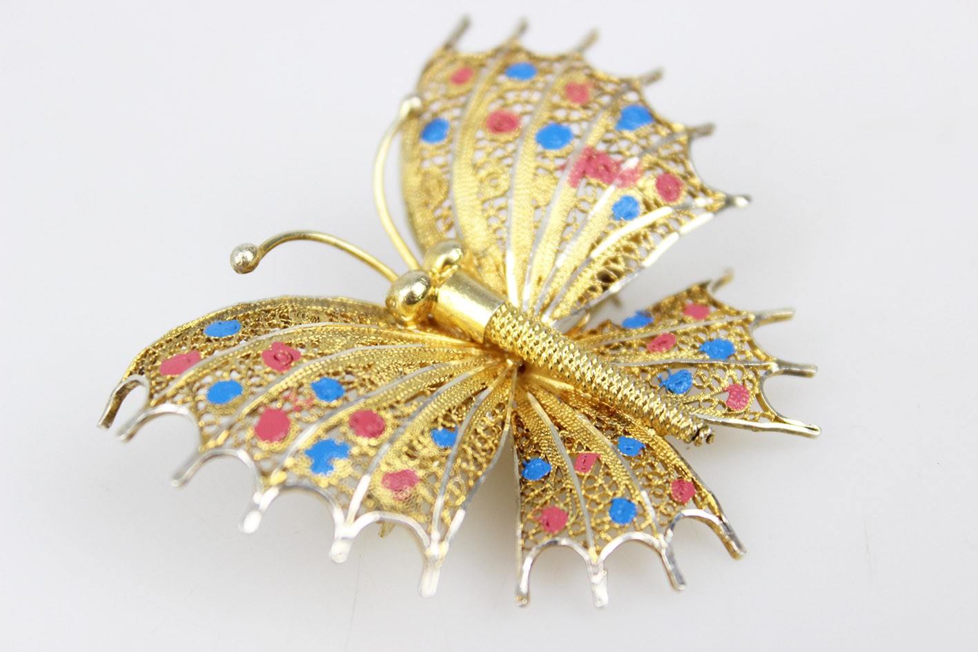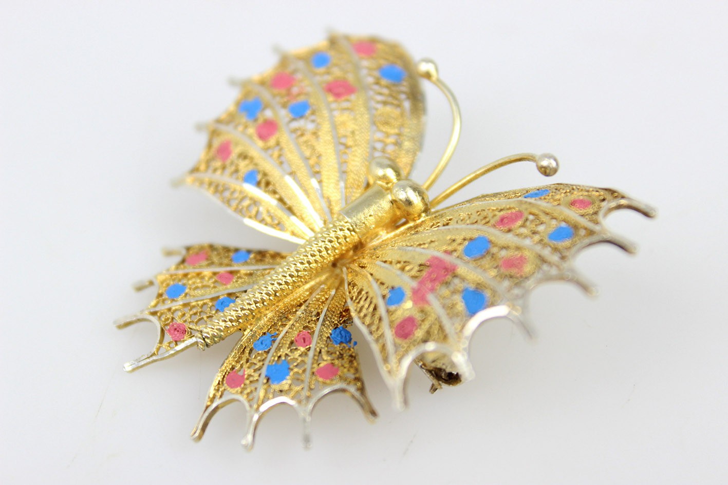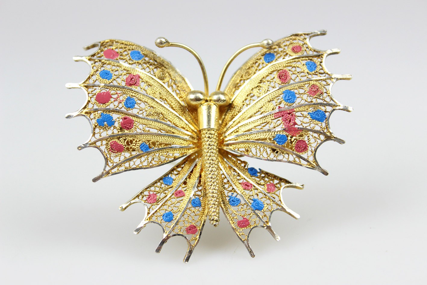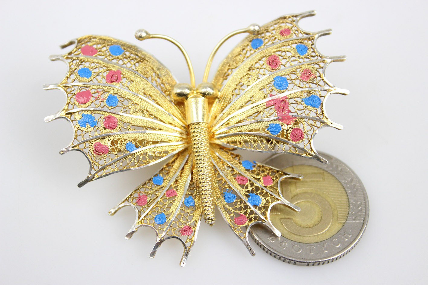 Przepiękny przykład jubilerstwa portugalskiego z pierwszej połowy XX wieku. Broszka w formie motyla wykonana w srebrze próby 800 pokrytym złoceniem prezentuje wysoki poziom rzemiosła charakterystyczny dla warsztatów działających w Portugalii w okresie międzywojennym. Całość została opracowana w technice delikatnego filigranu który nadaje formie lekkości i niemal koronkowego charakteru przy jednoczesnym zachowaniu bardzo dobrej stabilności konstrukcji. Skrzydła motyla wypełnione są drobnymi polami kolorowej emalii w odcieniach czerwieni i błękitu starannie nałożonej punktowo co tworzy żywy kontrast z ciepłym złoceniem srebra. Centralna część tułowia oraz żyłkowanie skrzydeł zostały dodatkowo podkreślone fakturowaną powierzchnią i subtelnymi detalami plastycznymi co wzmacnia dekoracyjny i realistyczny efekt całości. Całość w bardzo dobrym stanie zachowania. Wymiary: