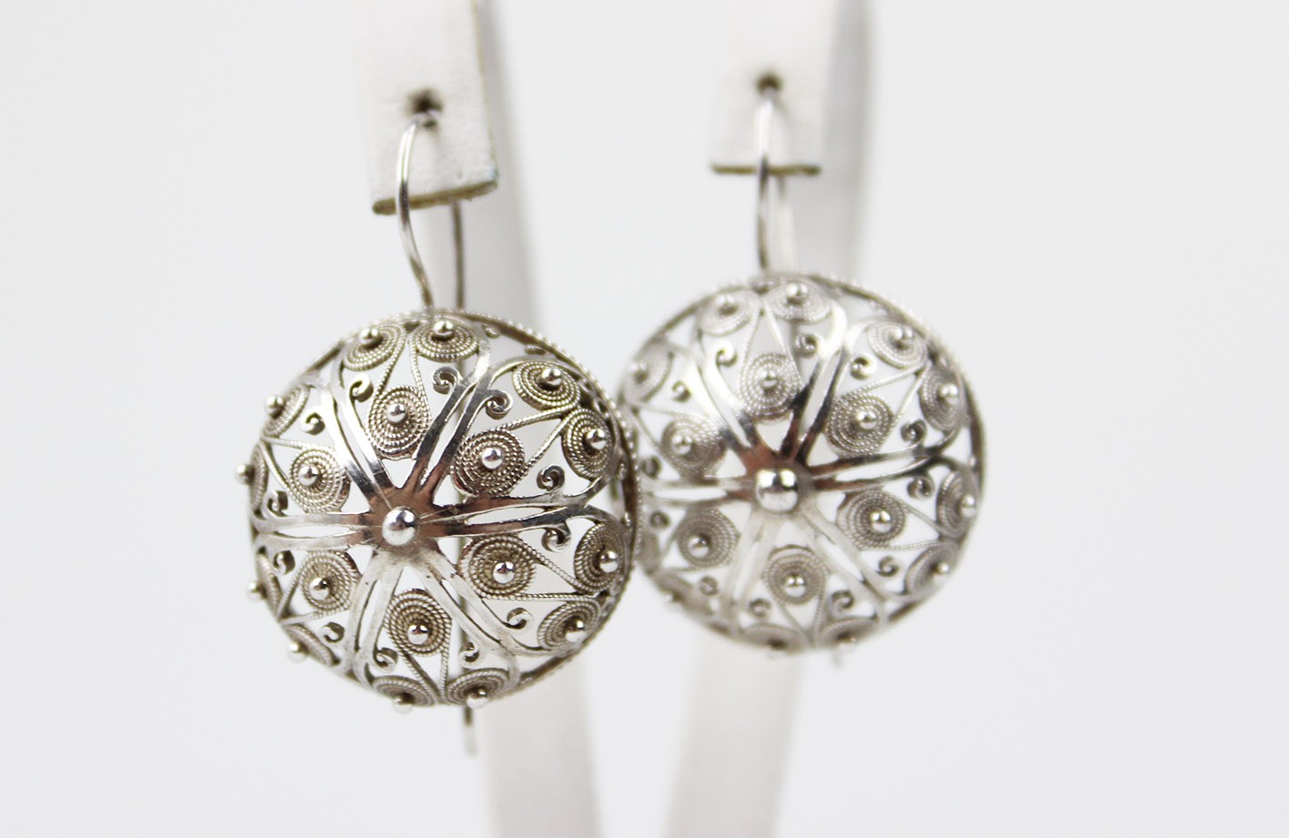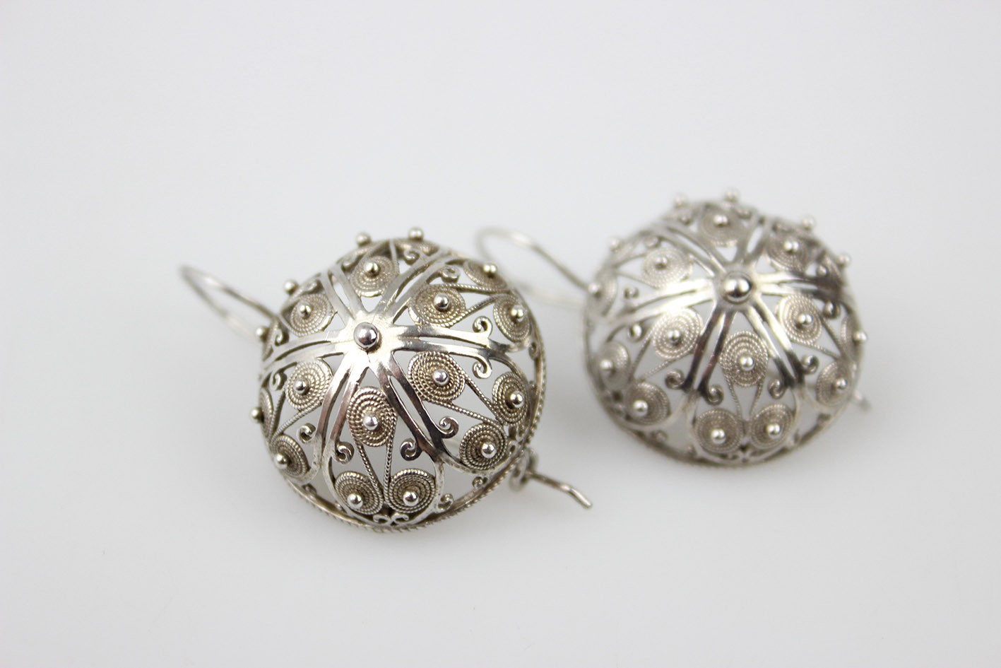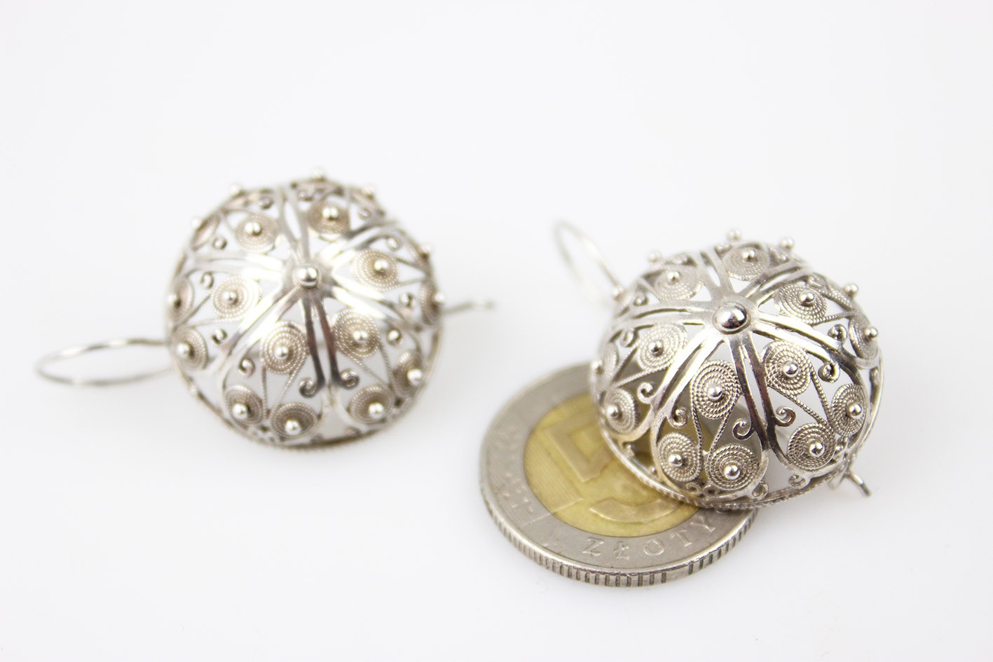 Niezwykle okazałe kolczyki w formie półkul, wykonane w srebrze w efektownej technice filigranu. Konstrukcja oparta na misternie skręcanych drucikach tworzących dekoracyjny, ażurowy ornament spiralny i roślinny, charakterystyczny dla tradycyjnego jubilerstwa filigranowego.