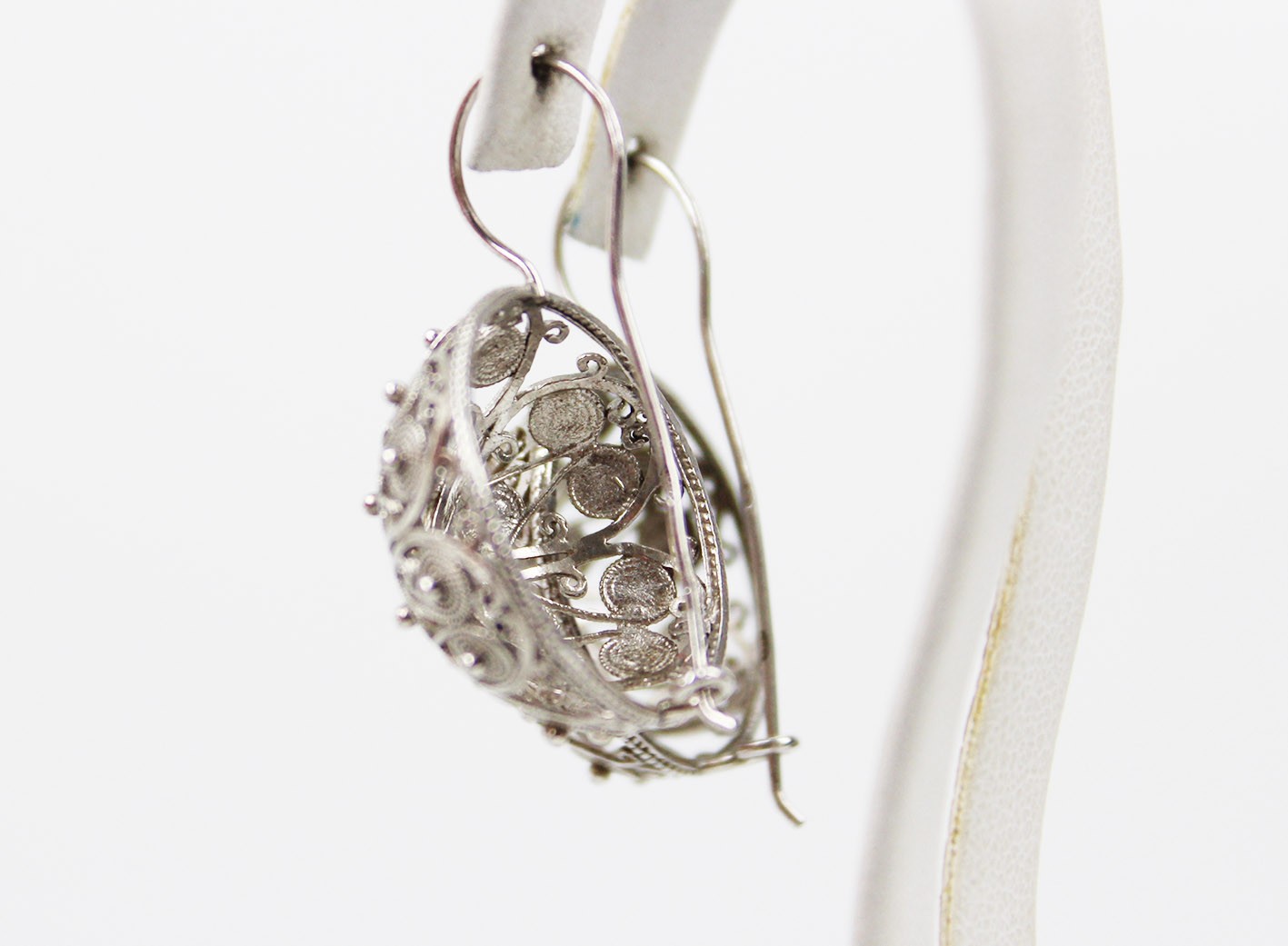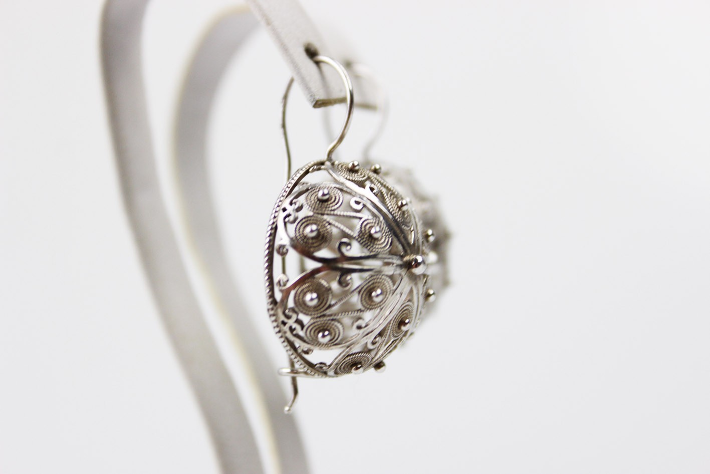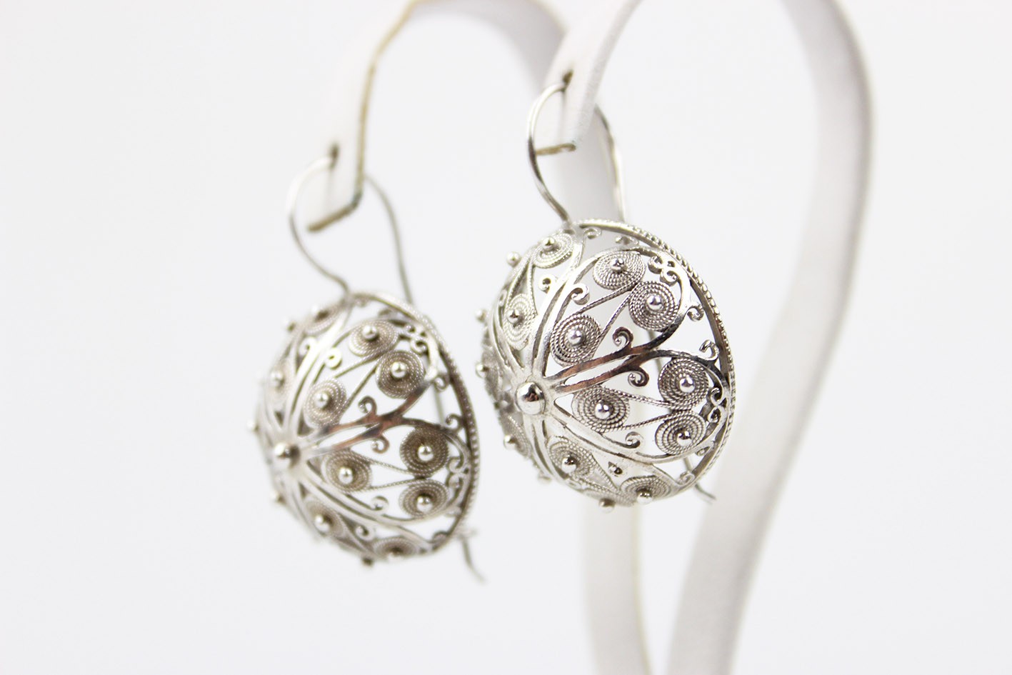 Niezwykle okazałe kolczyki w formie półkul, wykonane w srebrze w efektownej technice filigranu. Konstrukcja oparta na misternie skręcanych drucikach tworzących dekoracyjny, ażurowy ornament spiralny i roślinny, charakterystyczny dla tradycyjnego jubilerstwa filigranowego.