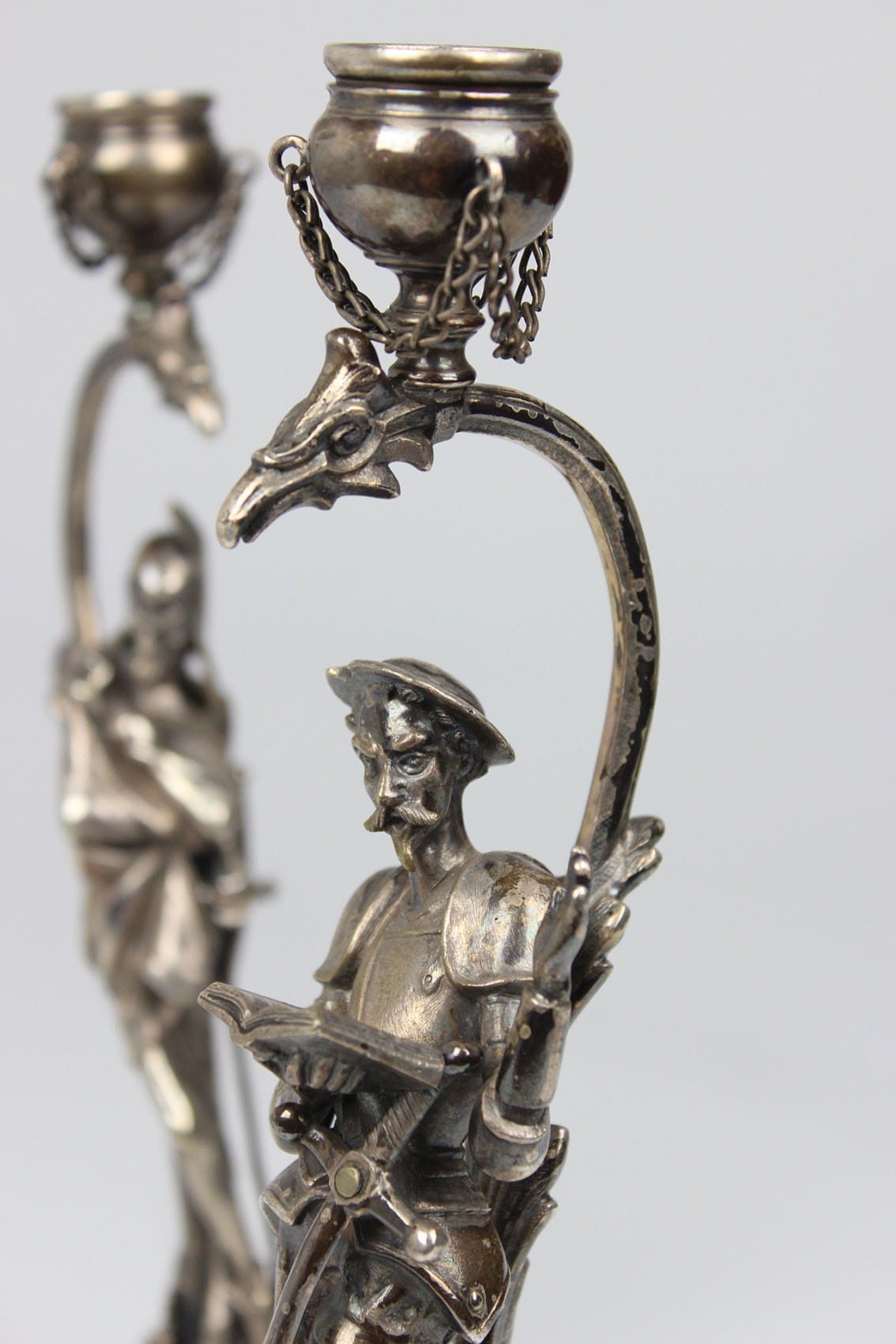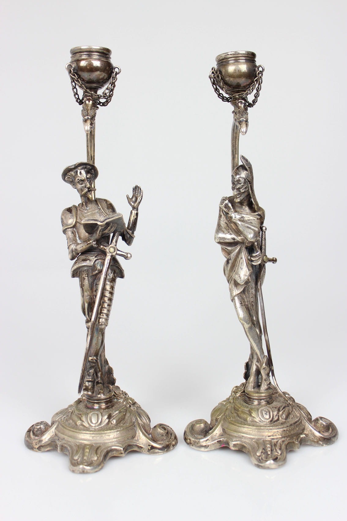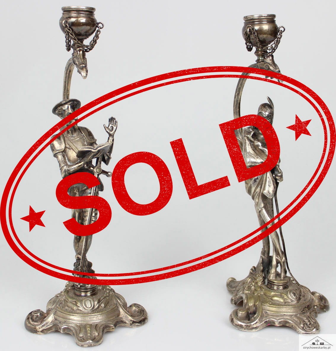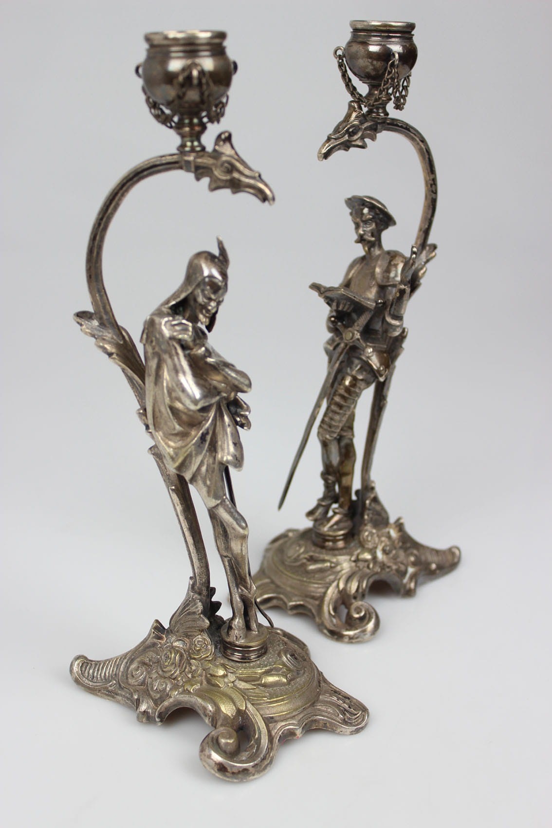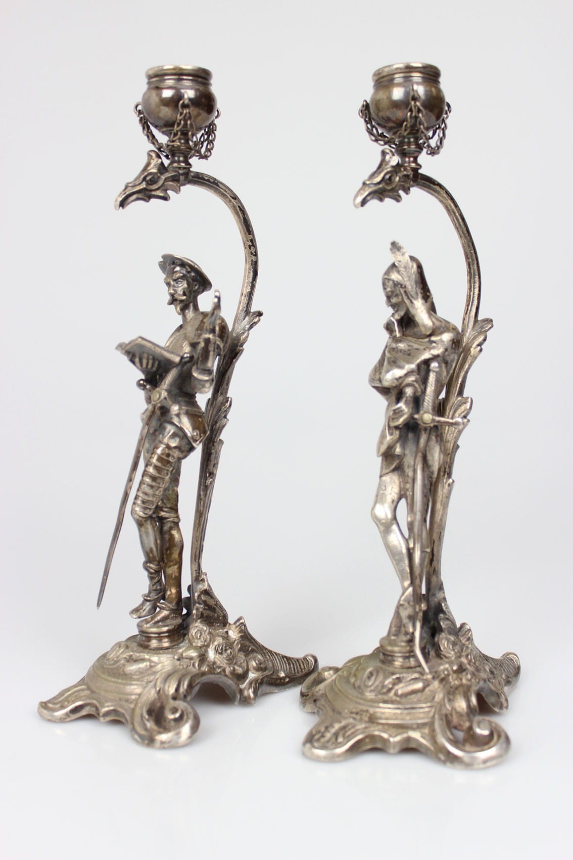 Para świeczników figuralnych z postaciami Mefistofelesa i Don Kichota. Przedmioty wykonane w Fabryce Wyrobów Srebrnych i Platerowanych- J. Fraget w Warszawie. Czas powstania 1897-1915. Mosiądz srebrzony cechowany od spodu puncami: FRAGET/ N/ PLAQUE w owalu oraz dwoma innymi znaki w tym carskim orłem. Wysokość około 26,5 cm każdy.