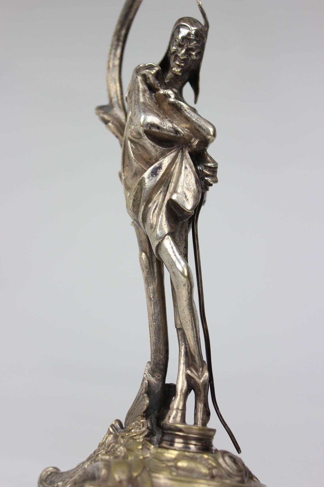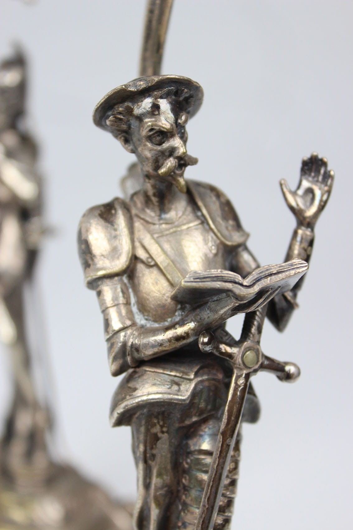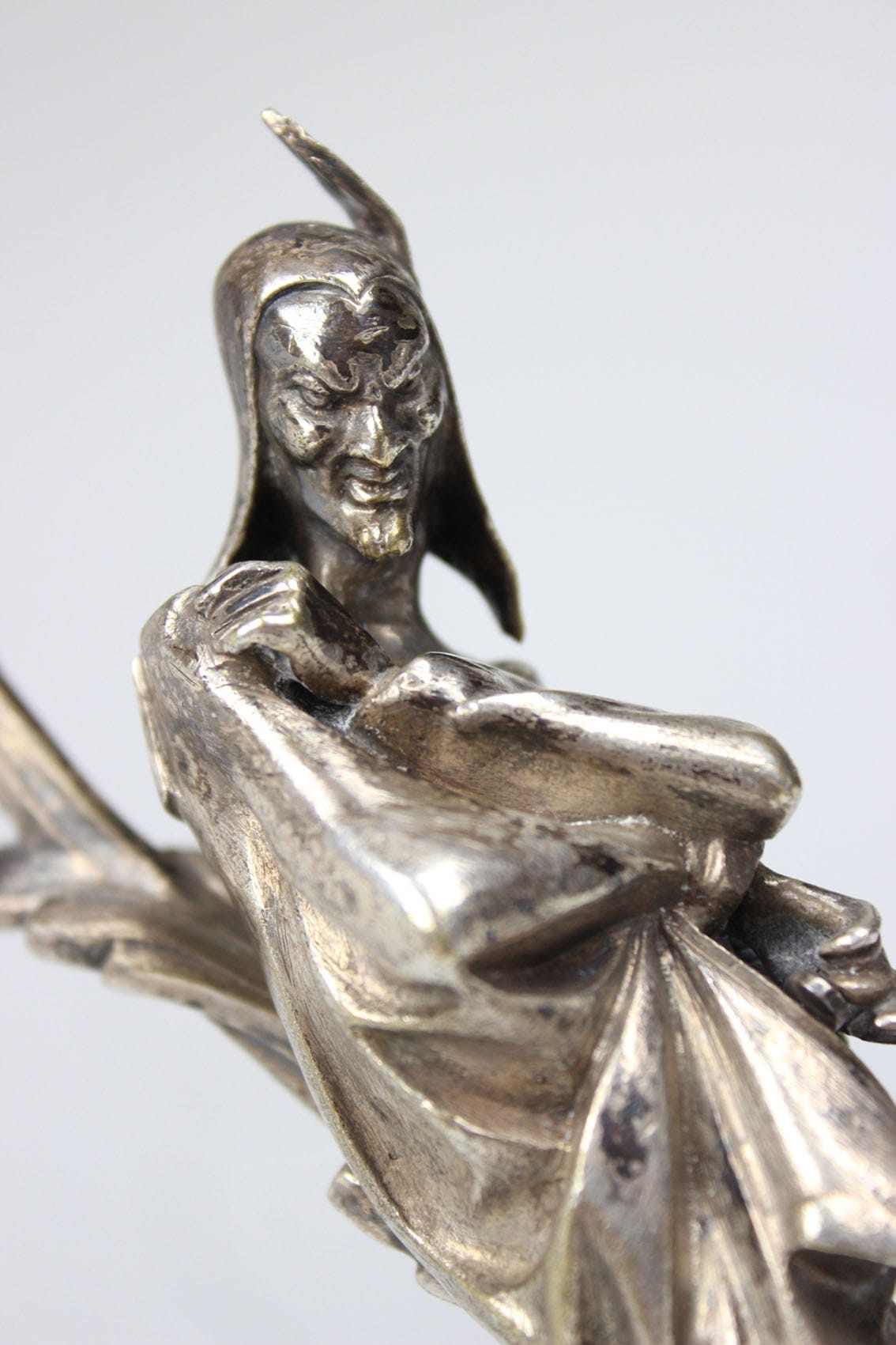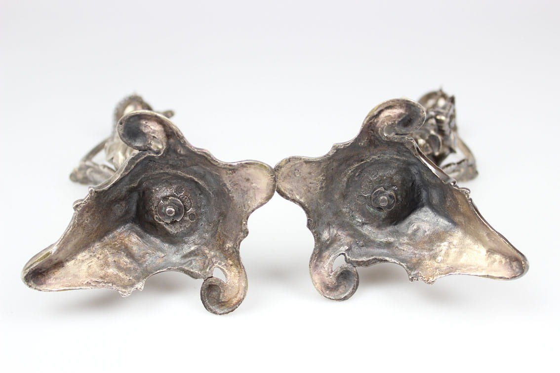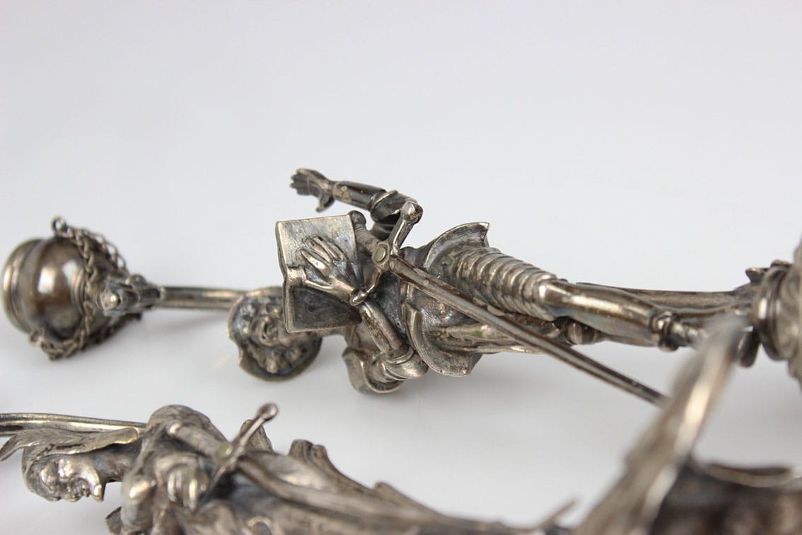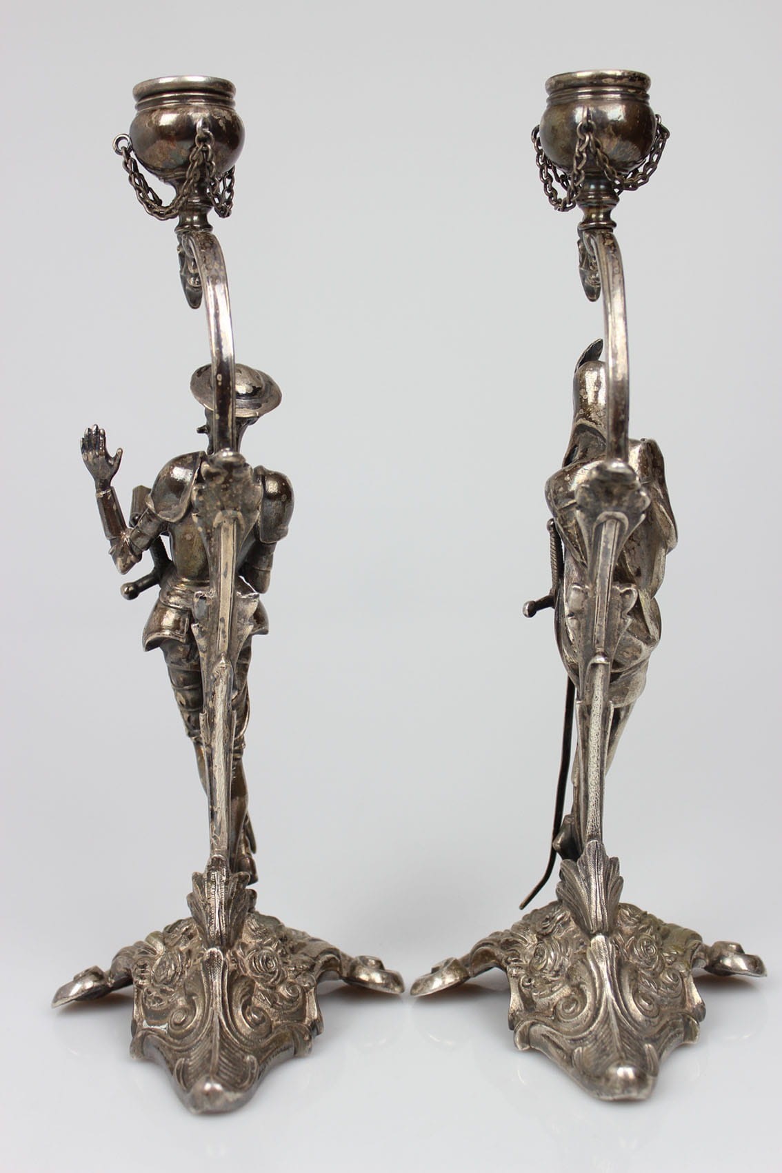 Para świeczników figuralnych z postaciami Mefistofelesa i Don Kichota. Przedmioty wykonane w Fabryce Wyrobów Srebrnych i Platerowanych- J. Fraget w Warszawie. Czas powstania 1897-1915. Mosiądz srebrzony cechowany od spodu puncami: FRAGET/ N/ PLAQUE w owalu oraz dwoma innymi znaki w tym carskim orłem. Wysokość około 26,5 cm każdy.