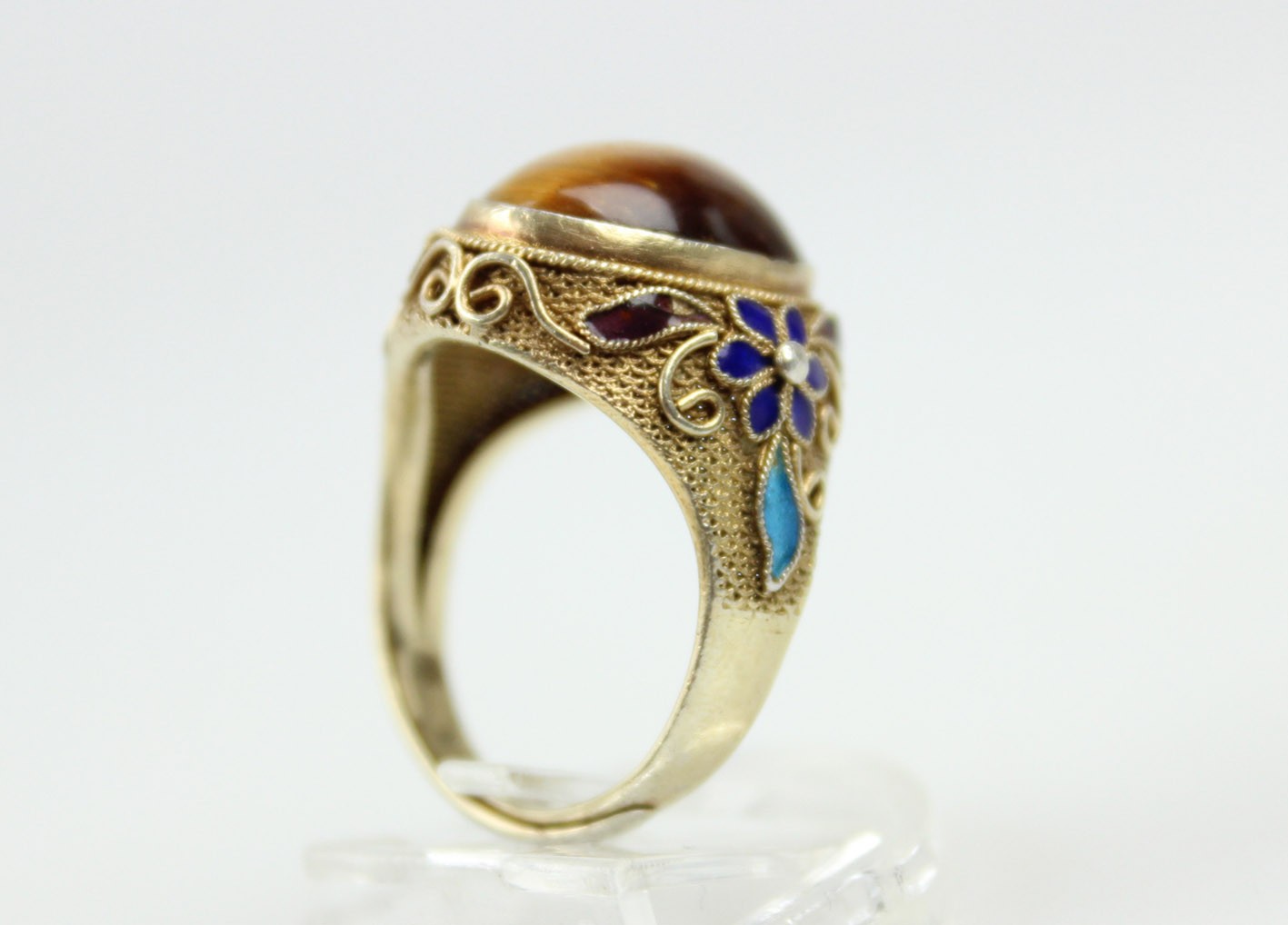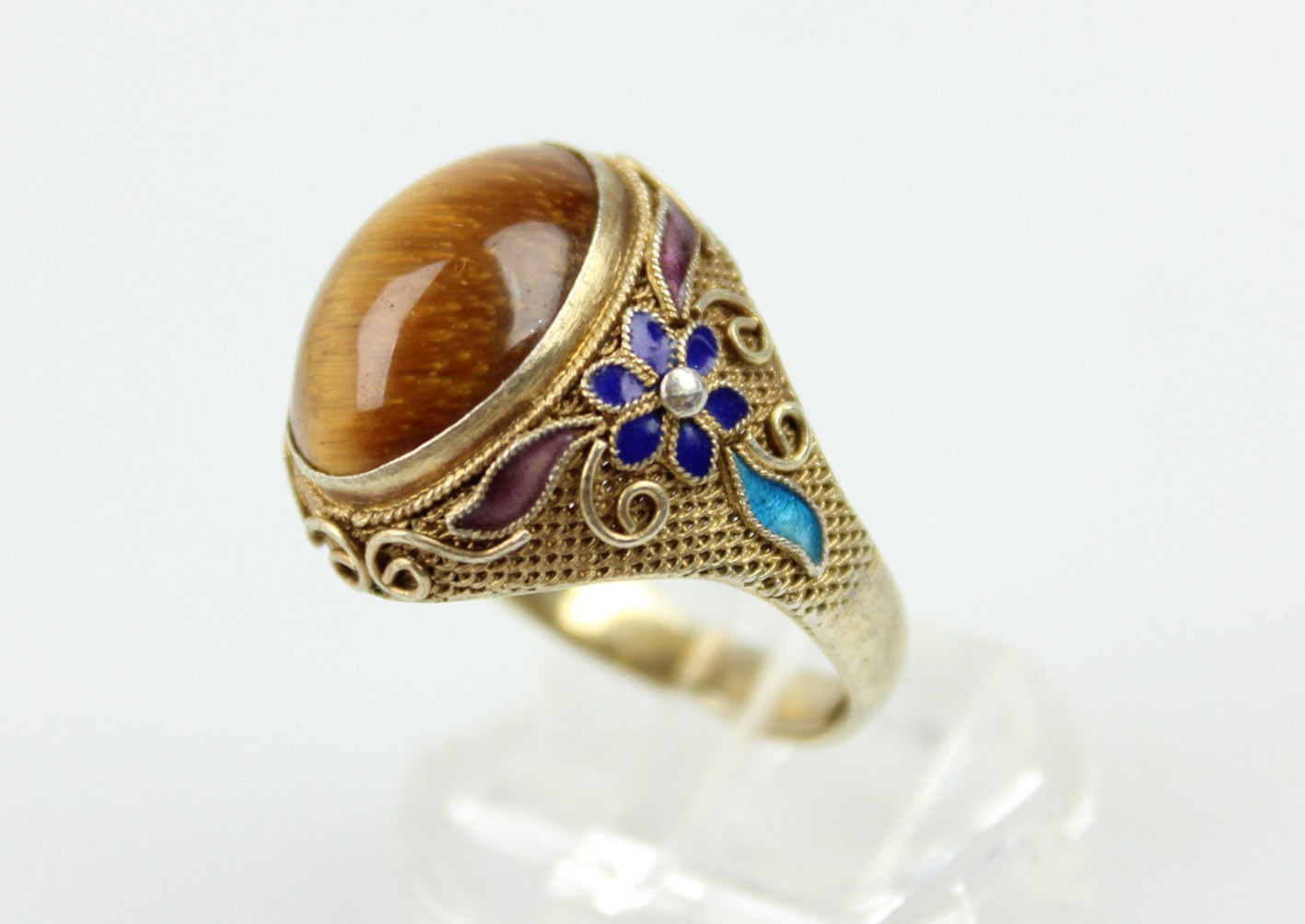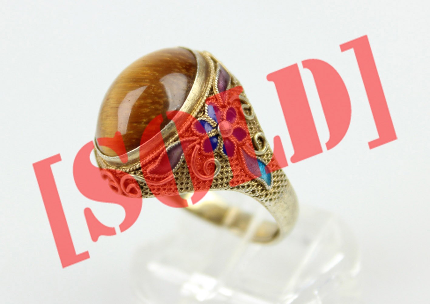 Wytworny pierścionek pochodzenia chińskiego, wykonany w latach 60 XX wieku ze złoconego srebra (wewnątrz obrączki wybita punca SILVER, charakterystyczna dla biżuterii eksportowej z tego okresu). Kompozycja zachwyca precyzją filigranu o drobnej, koronkowej strukturze, który wzbogacono o barwną emalię w odcieniach błękitu, fioletu i granatu, tworząc misterny, kwiatowy ornament o subtelnie orientalnym charakterze. W centrum osadzono wypukły kaboszon z naturalnego tygrysiego oka – kamienia o złocisto-brązowej, migotliwej powierzchni, pięknie współgrającej z ciepłym tonem złocenia. Całość emanuje finezją dawnych chińskich wyrobów rzemieślniczych tworzonych na eksport do Europy i Stanów Zjednoczonych. Obrączka ma konstrukcję otwartą z możliwością regulacji, dzięki czemu dopasowuje się do większości kobiecych palców. Pierścionek pochodzi z bogatej parure, obejmującej także bransoletkę, broszkę oraz klipsy w identycznej stylistyce. Stan zachowania bardzo dobry z delikatną patyną.