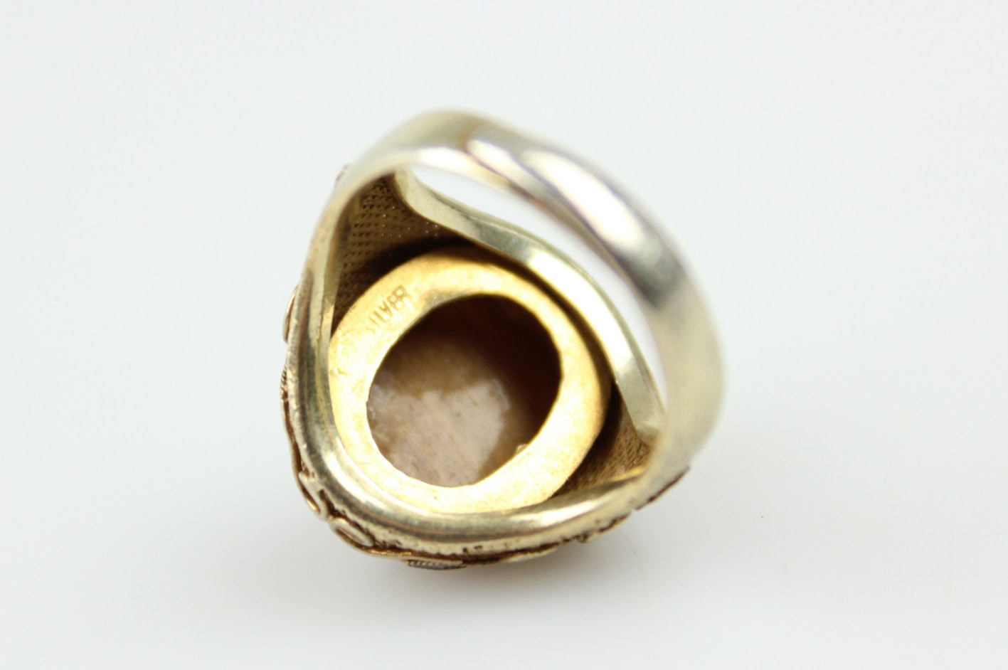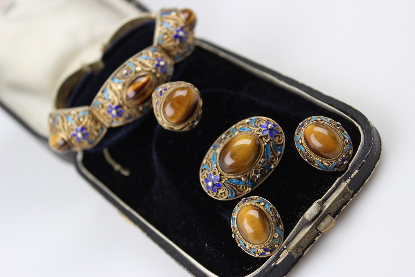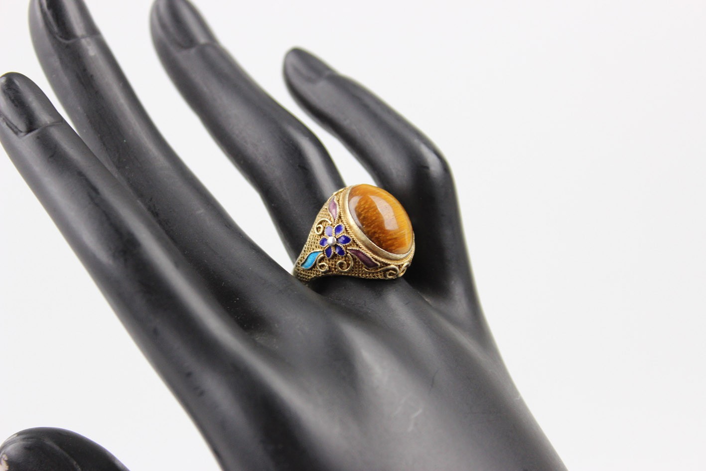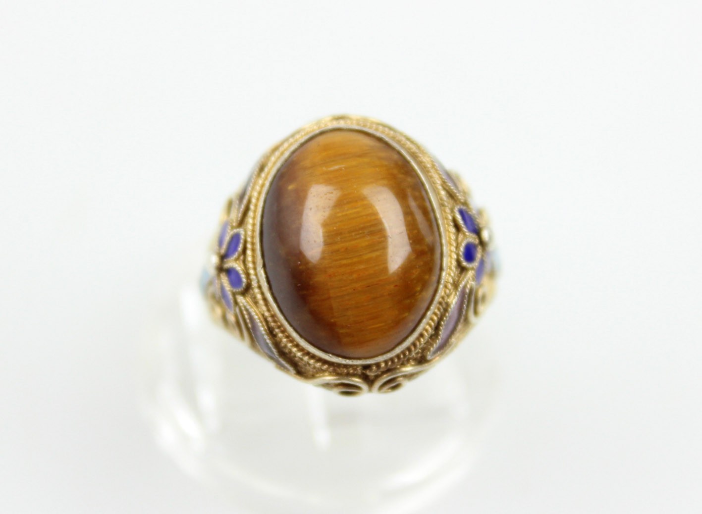 Wytworny pierścionek pochodzenia chińskiego, wykonany w latach 60 XX wieku ze złoconego srebra (wewnątrz obrączki wybita punca SILVER, charakterystyczna dla biżuterii eksportowej z tego okresu). Kompozycja zachwyca precyzją filigranu o drobnej, koronkowej strukturze, który wzbogacono o barwną emalię w odcieniach błękitu, fioletu i granatu, tworząc misterny, kwiatowy ornament o subtelnie orientalnym charakterze. W centrum osadzono wypukły kaboszon z naturalnego tygrysiego oka – kamienia o złocisto-brązowej, migotliwej powierzchni, pięknie współgrającej z ciepłym tonem złocenia. Całość emanuje finezją dawnych chińskich wyrobów rzemieślniczych tworzonych na eksport do Europy i Stanów Zjednoczonych. Obrączka ma konstrukcję otwartą z możliwością regulacji, dzięki czemu dopasowuje się do większości kobiecych palców. Pierścionek pochodzi z bogatej parure, obejmującej także bransoletkę, broszkę oraz klipsy w identycznej stylistyce. Stan zachowania bardzo dobry z delikatną patyną.
