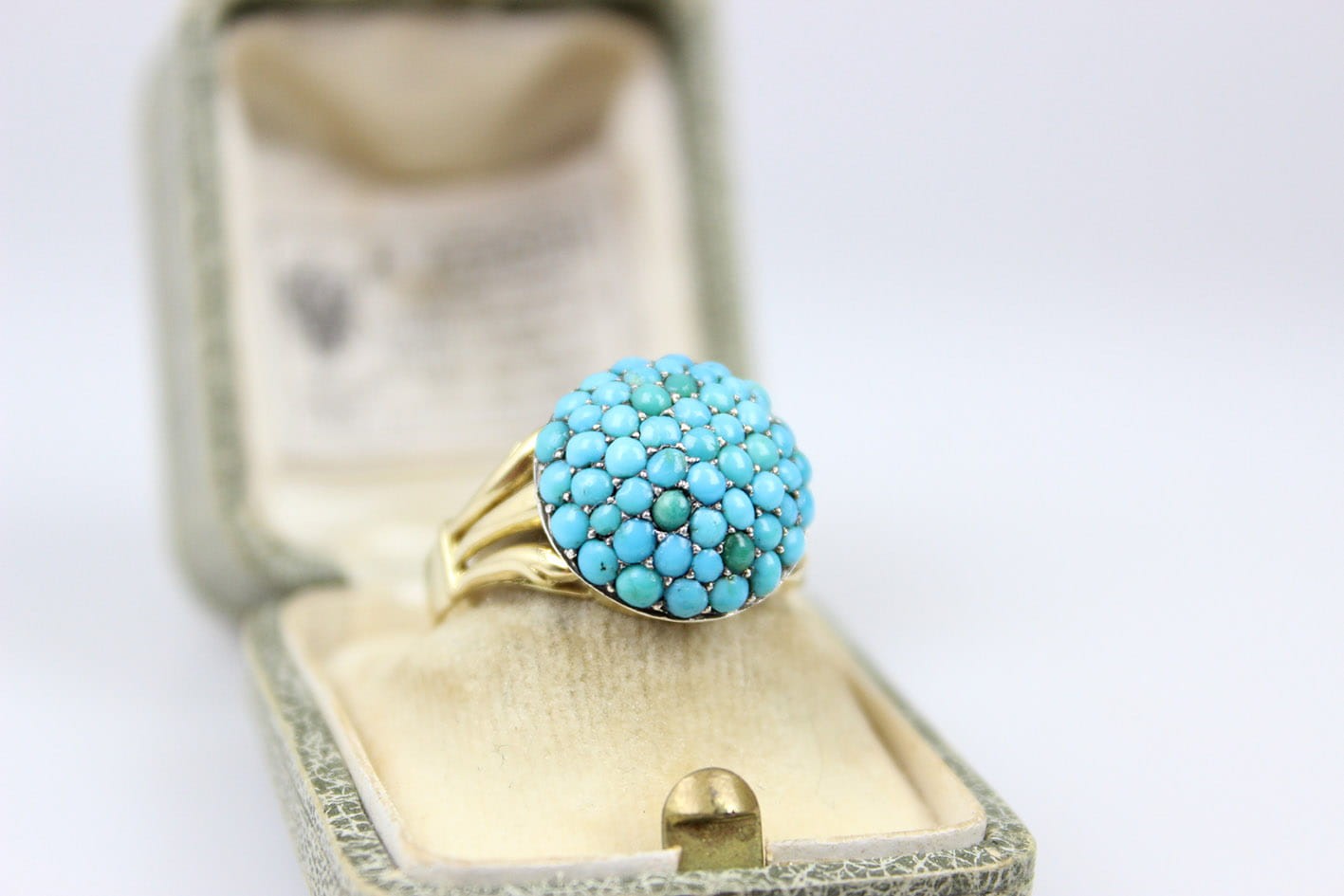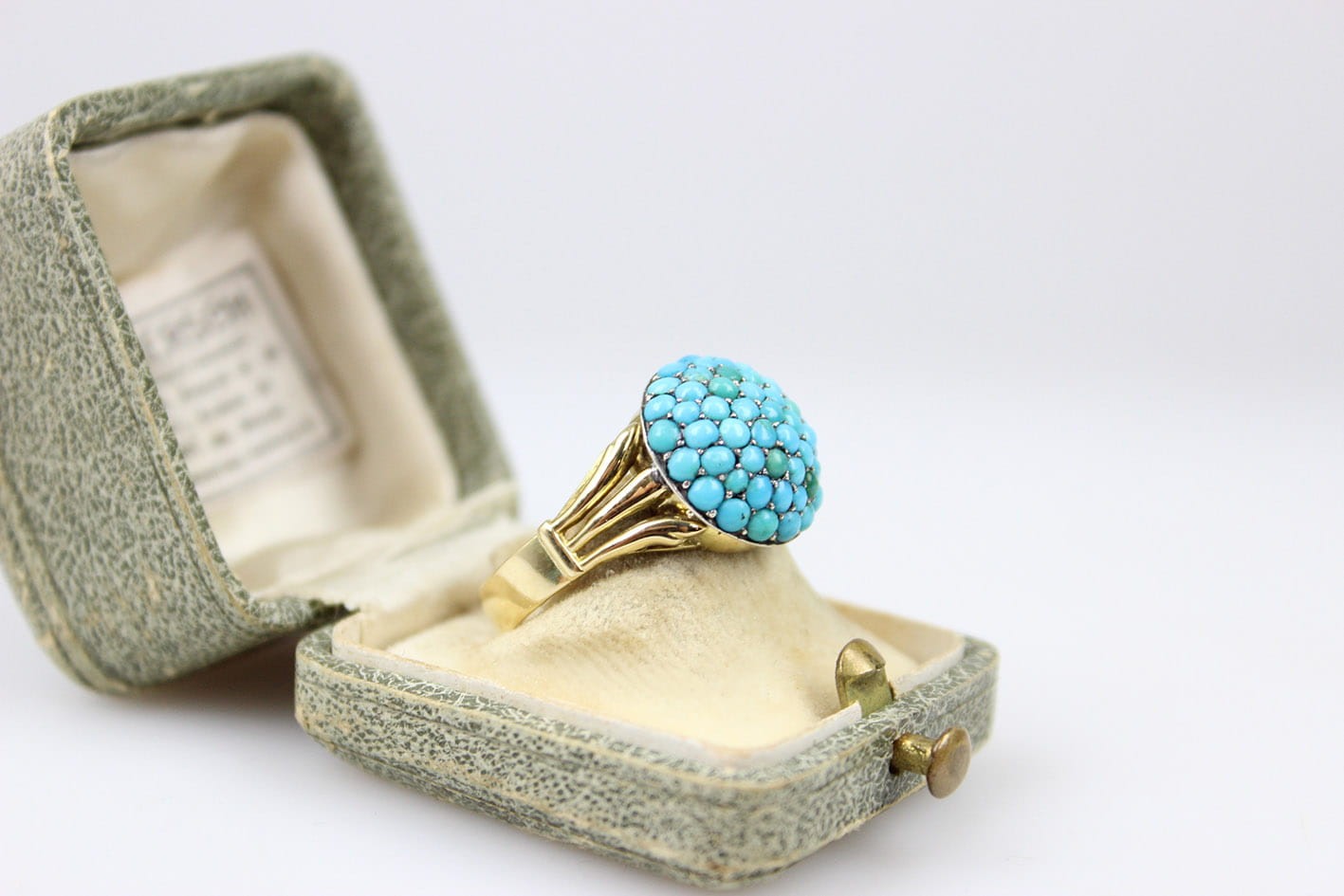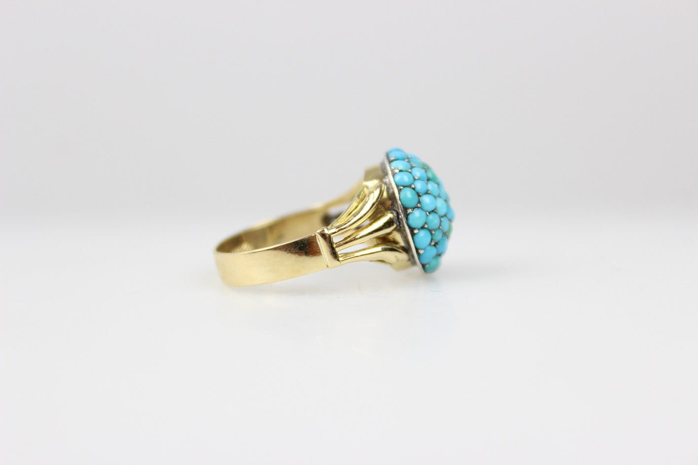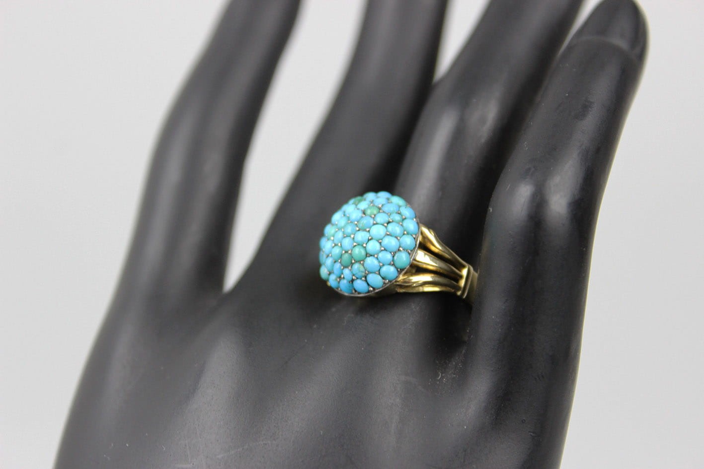 Przepiękny, unikatowy pierścionek z przełomu XIX i XX wieku o francuskim rodowodzie. Jego centralnym elementem jest charakterystyczna, turkusowa kopułka, subtelnie uniesiona ponad dłoń, nadająca całości niezwykłej elegancji i lekkości.