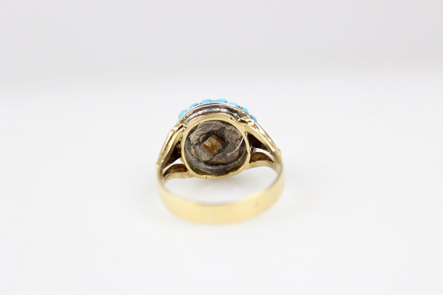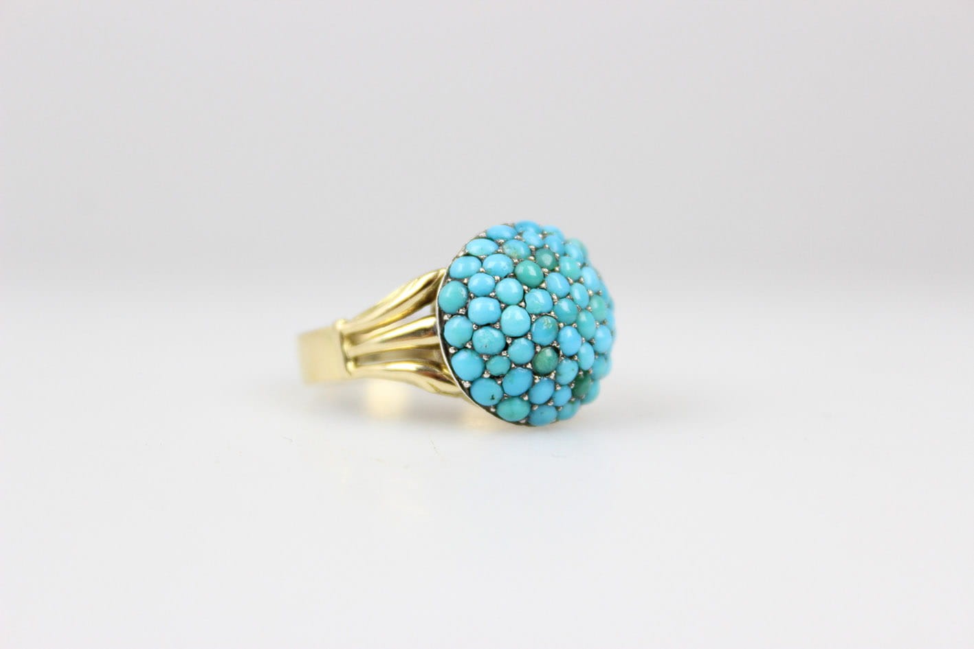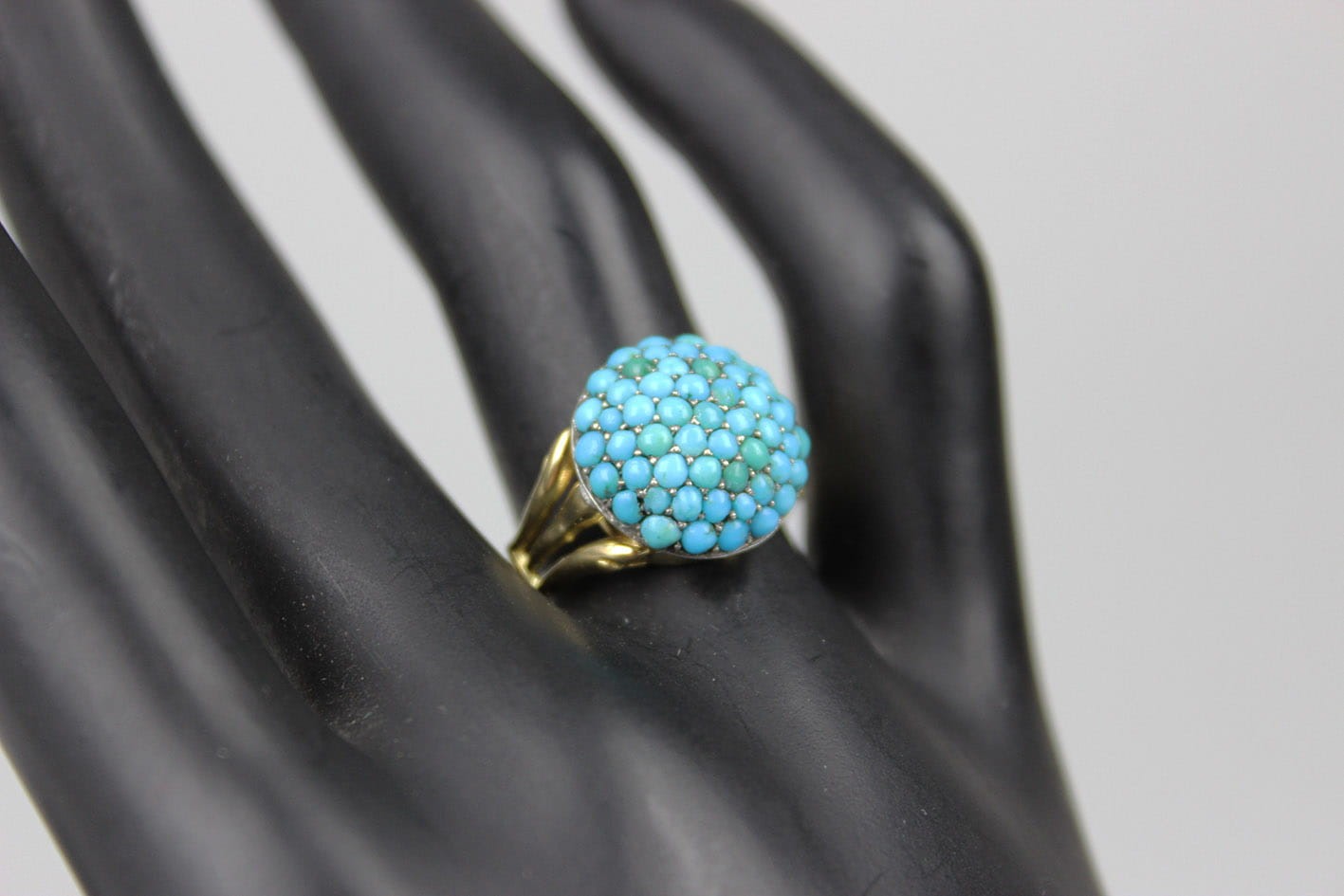 Przepiękny, unikatowy pierścionek z przełomu XIX i XX wieku o francuskim rodowodzie. Jego centralnym elementem jest charakterystyczna, turkusowa kopułka, subtelnie uniesiona ponad dłoń, nadająca całości niezwykłej elegancji i lekkości.