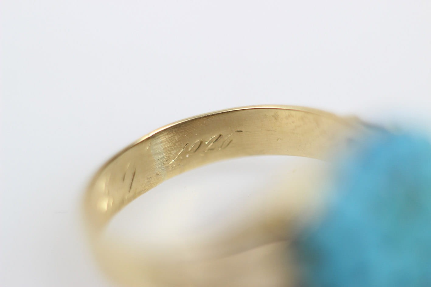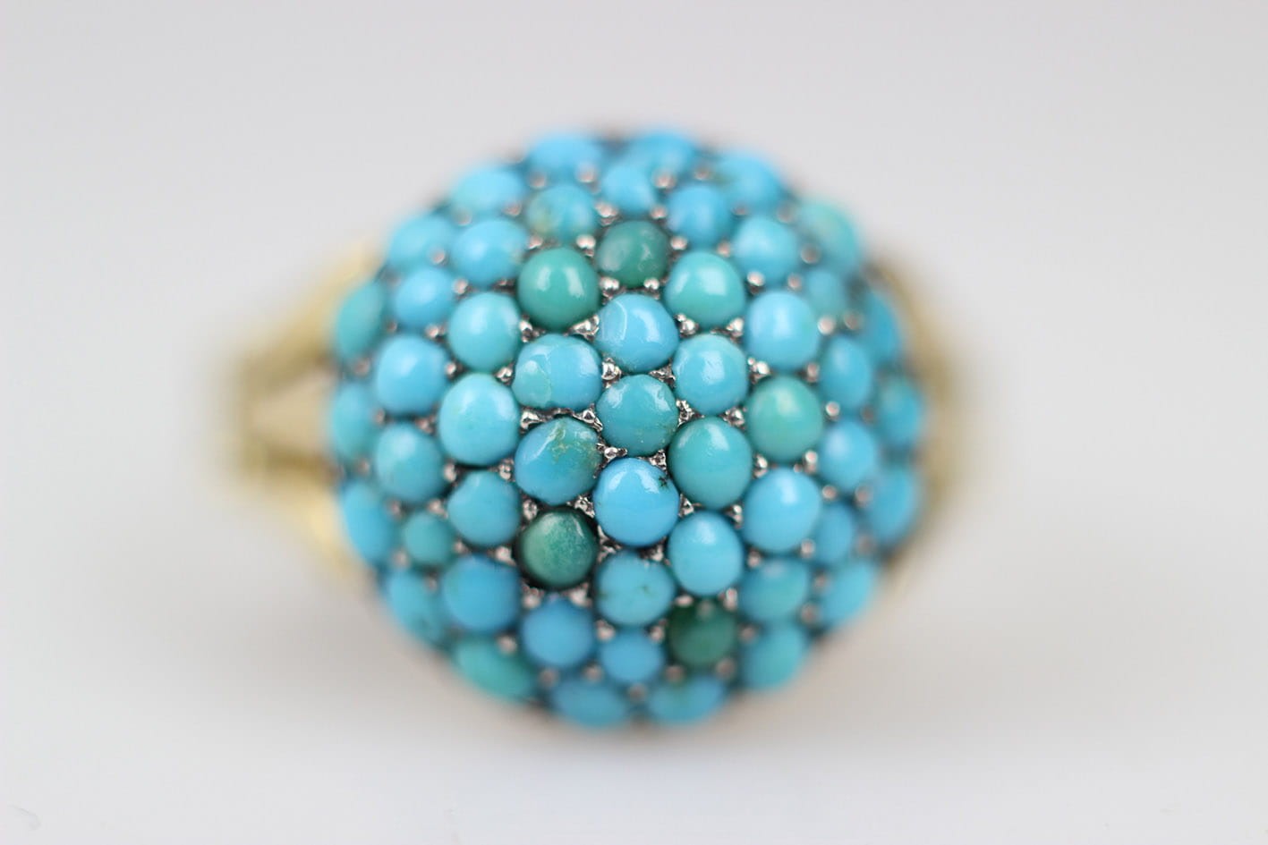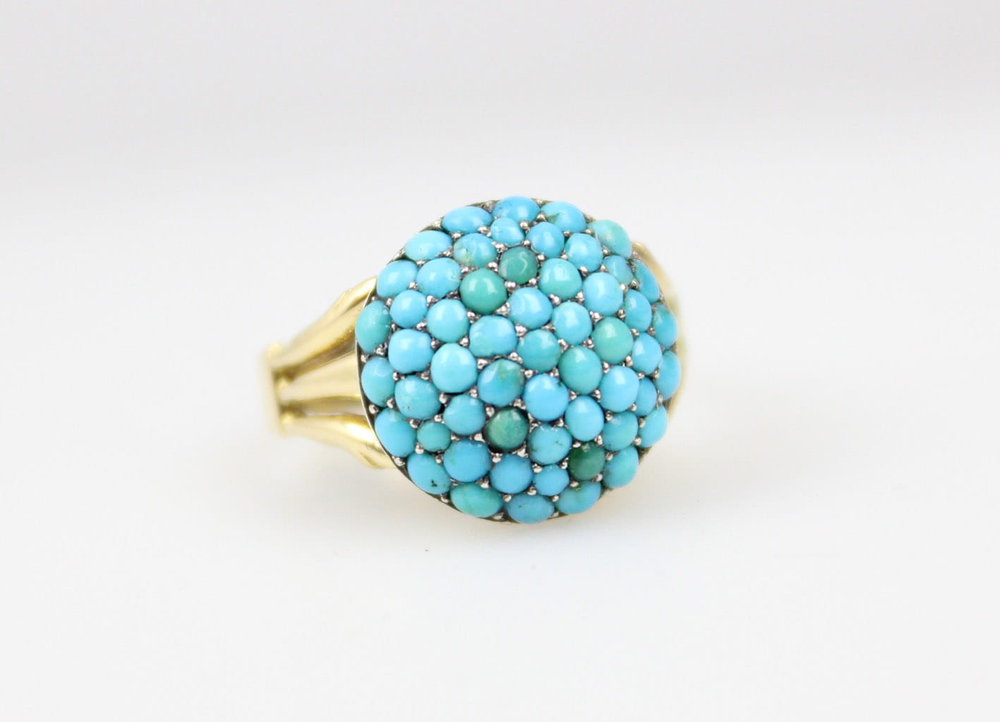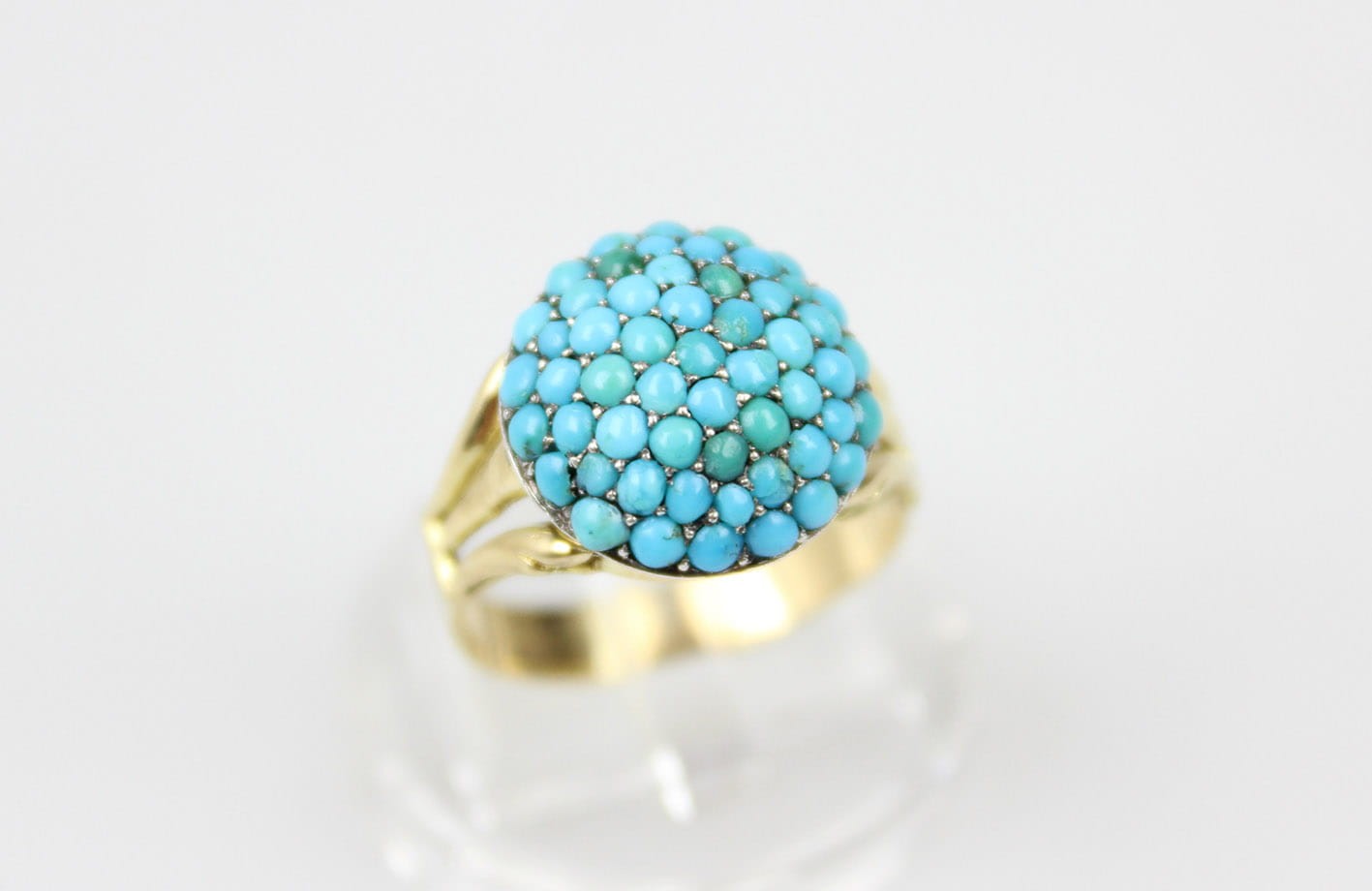 Przepiękny, unikatowy pierścionek z przełomu XIX i XX wieku o francuskim rodowodzie. Jego centralnym elementem jest charakterystyczna, turkusowa kopułka, subtelnie uniesiona ponad dłoń, nadająca całości niezwykłej elegancji i lekkości.