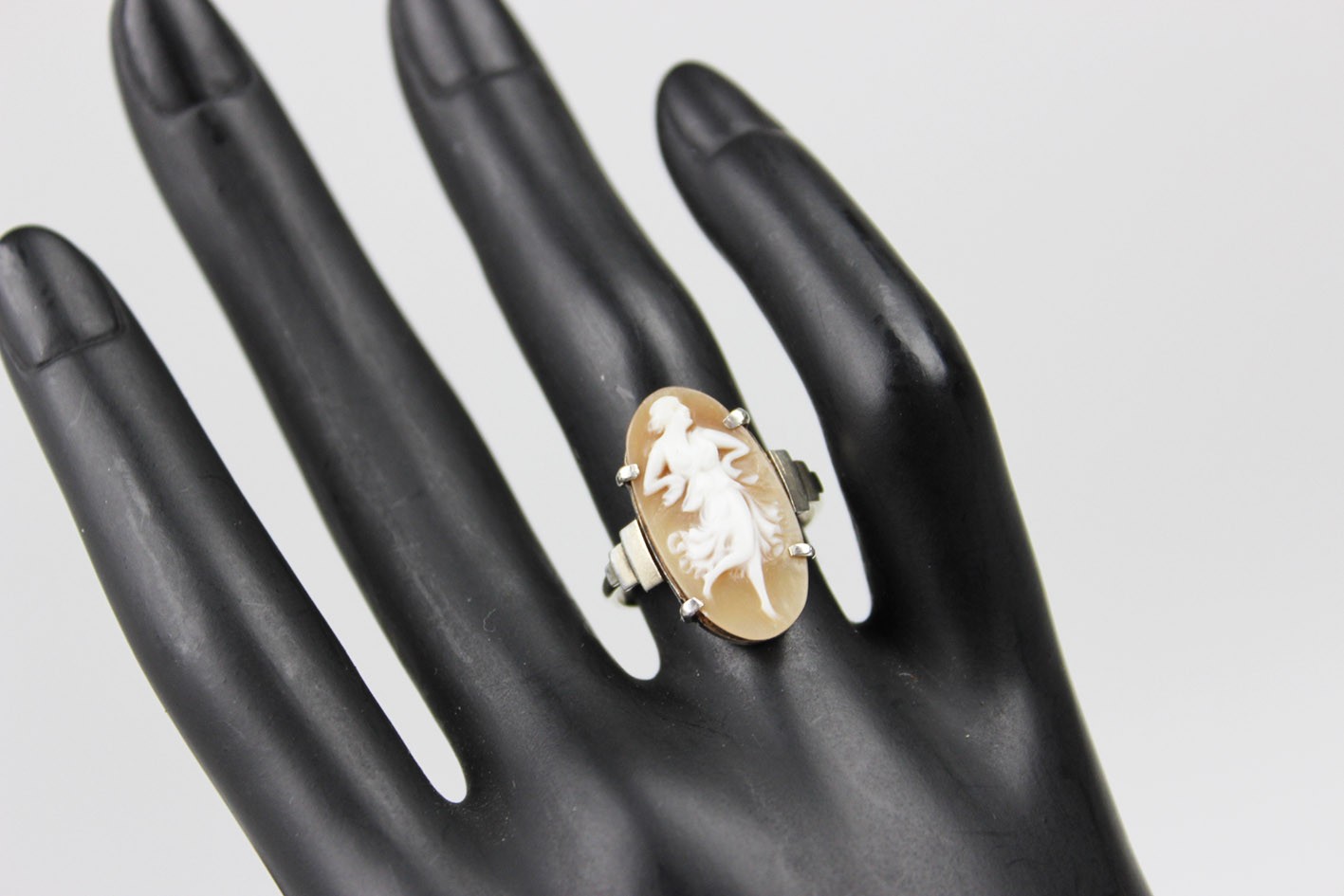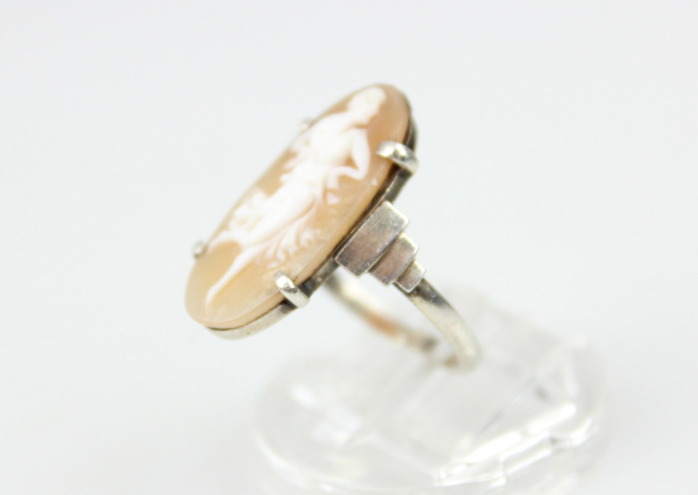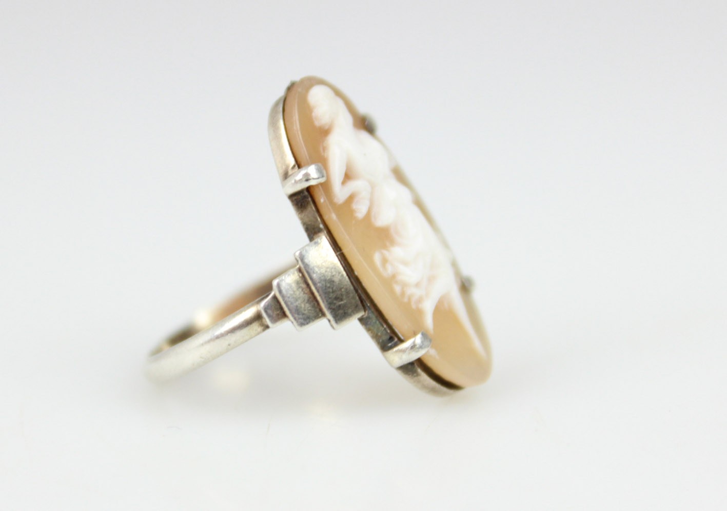 Pierścionek z naturalną kameą z muszli, osadzoną w oprawie ze srebra próby 800. Ręcznie rzeźbiona kamea przedstawia smukłą postać kobiecą w lekkiej, płynącej szacie — motyw typowy dla włoskich wyrobów z drugiej ćwierci XX wieku, inspirowanych klasycznym antykiem i tradycją neoklasycyzmu w jubilerstwie. Relief wykonano w naturalnej muszli o subtelnym przejściu barw od ciepłego beżu po mlecznobiałą tonację postaci.