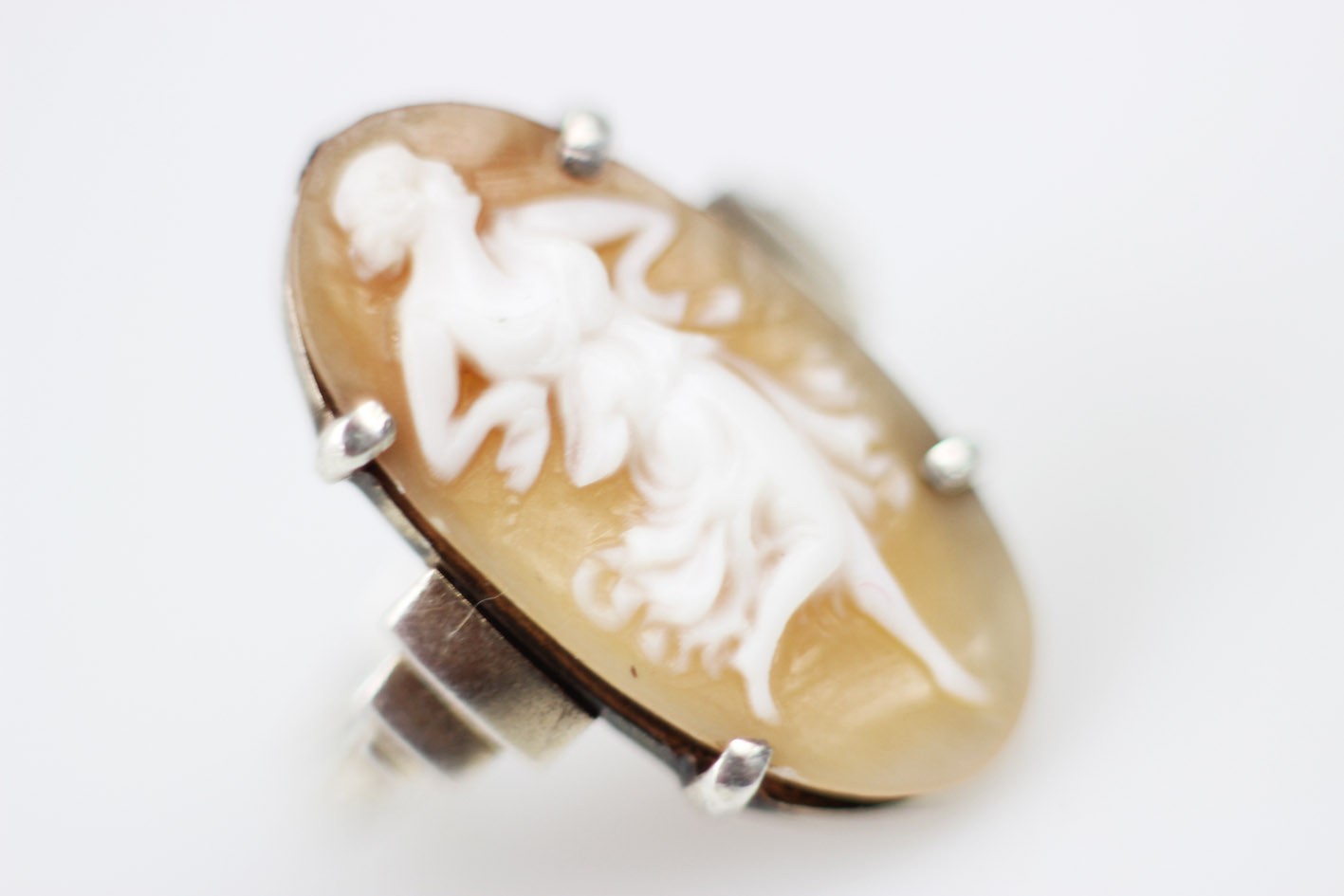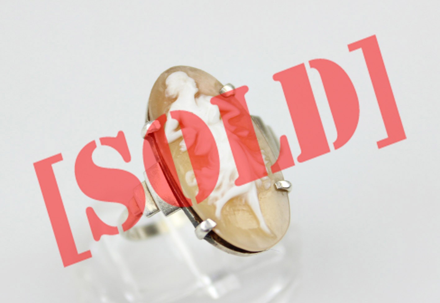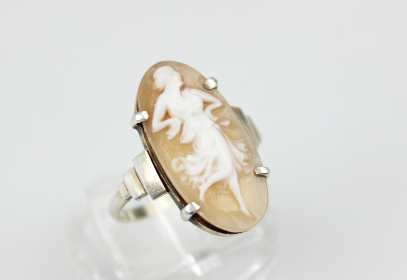 Pierścionek z naturalną kameą z muszli, osadzoną w oprawie ze srebra próby 800. Ręcznie rzeźbiona kamea przedstawia smukłą postać kobiecą w lekkiej, płynącej szacie — motyw typowy dla włoskich wyrobów z drugiej ćwierci XX wieku, inspirowanych klasycznym antykiem i tradycją neoklasycyzmu w jubilerstwie. Relief wykonano w naturalnej muszli o subtelnym przejściu barw od ciepłego beżu po mlecznobiałą tonację postaci.