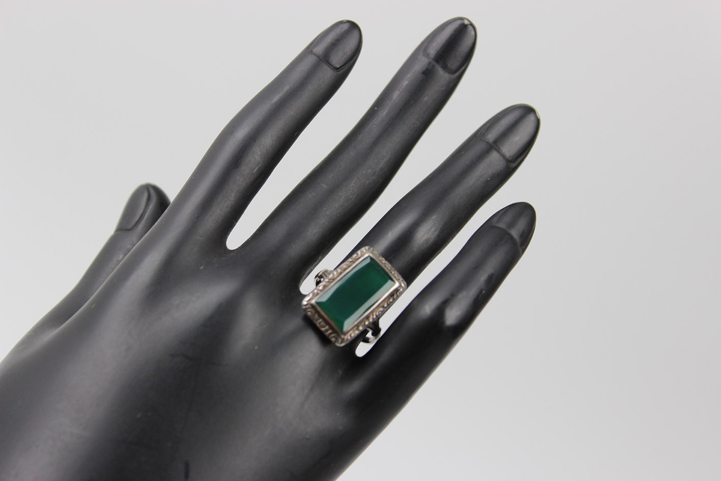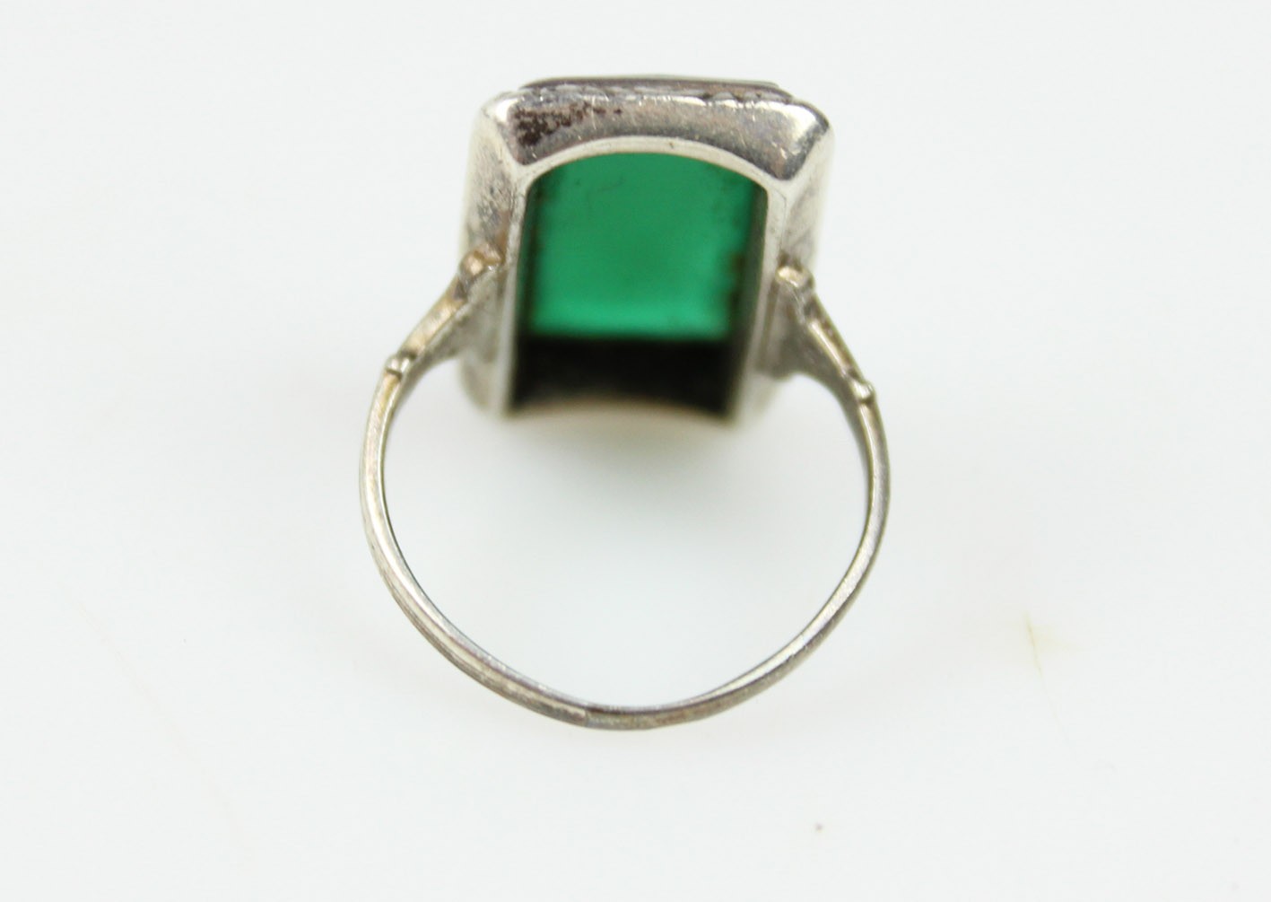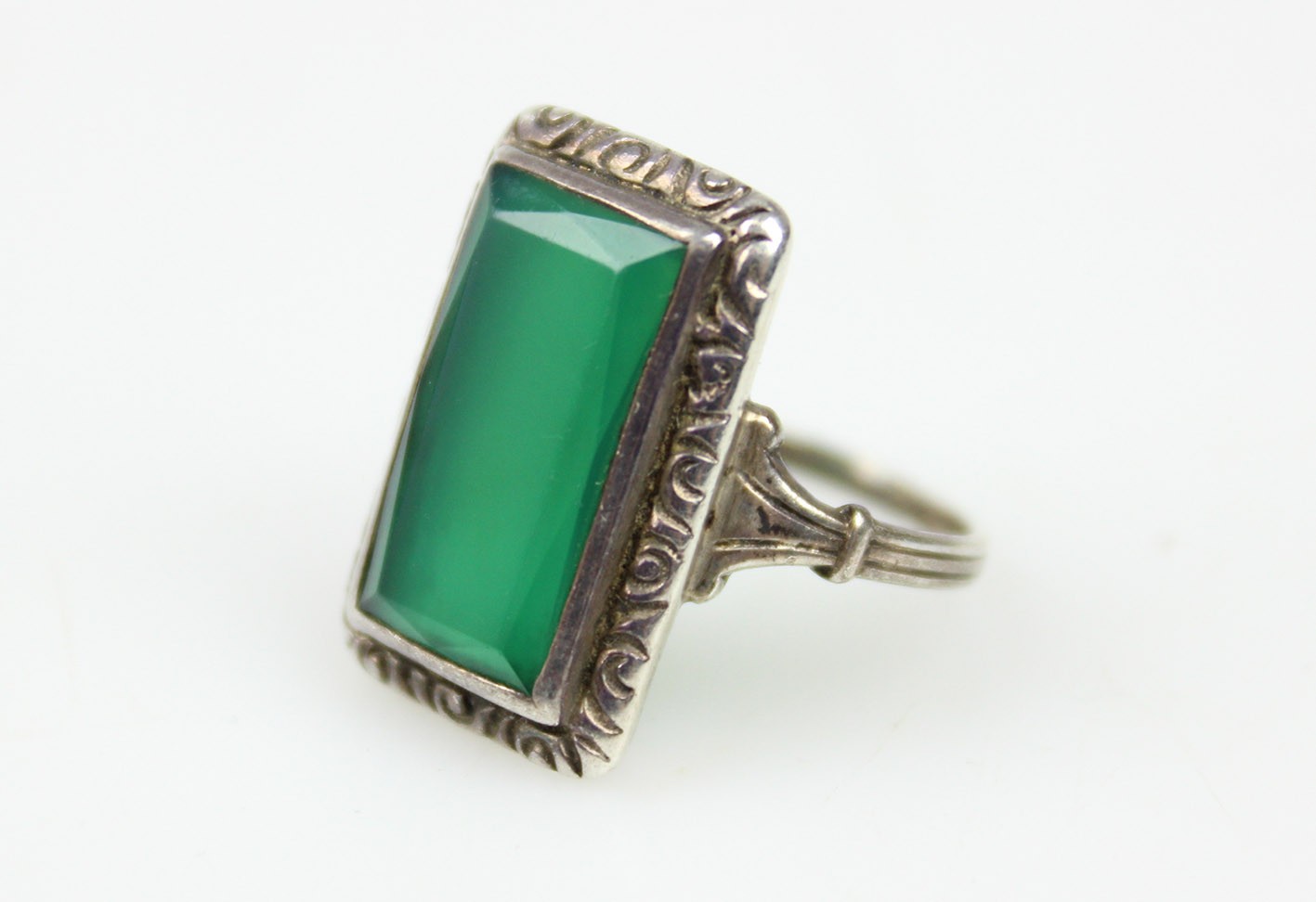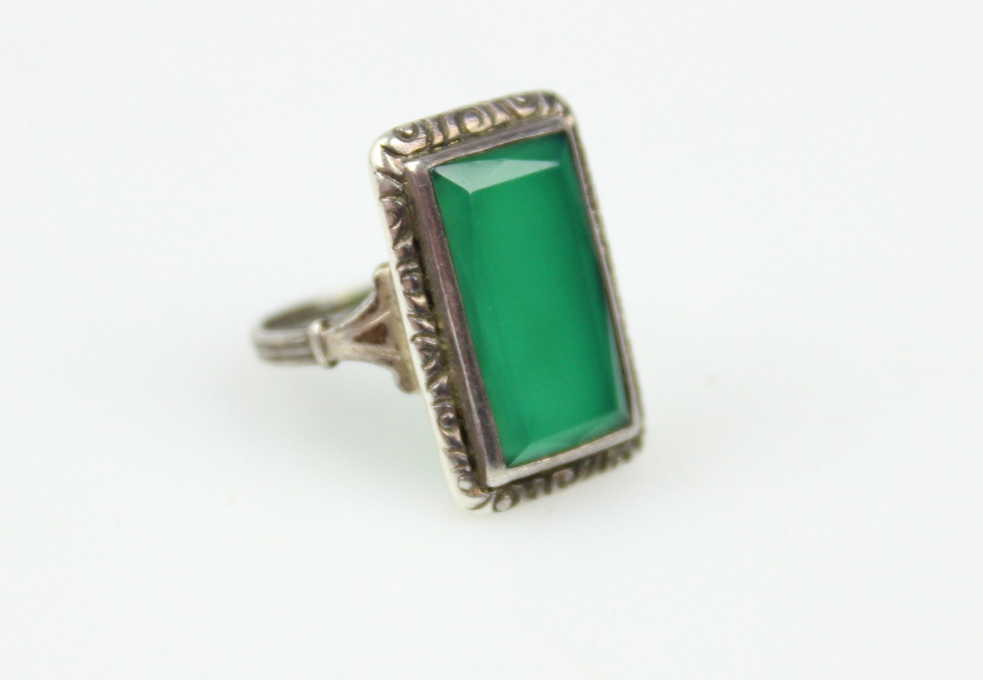 Srebrny pierścionek z lat 20-tych XX wieku, utrzymany w charakterystycznej dla wczesnego Art Deco stylistyce. Wyrób wykonany w srebrze próby około 800 ( brak punc badanie kwasowe). Centralnym elementem pierścionka jest efektowny zielony agat o intensywnej, nasyconej zielonej barwie, starannie oszlifowany w prostokątną formę z wyraźnie zaznaczonymi płaszczyznami. Kamień osadzono w masywnej, dekoracyjnej oprawie z profilowanym rantem, wzbogaconym subtelnym ornamentem reliefowym, który dodaje całości elegancji, nie zakłócając jednocześnie surowego, modernistycznego charakteru formy. Korpus pierścionka jest stabilny i dobrze wyważony, z delikatnie profilowaną szyną, zapewniającą komfort noszenia. Stan zachowania bardzo dobry, bez pęknięć czy wyszczerbień kamienia, z naturalną patyną srebra podkreślającą wiek i autentyczność wyrobu. Wymiary: