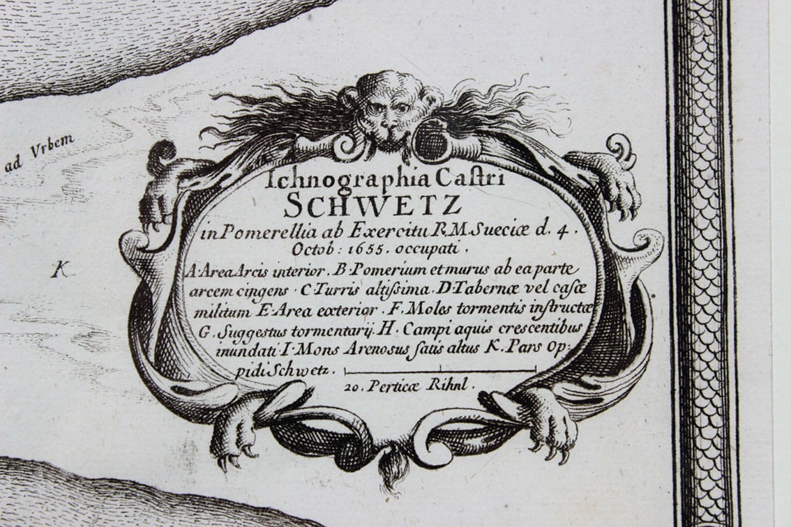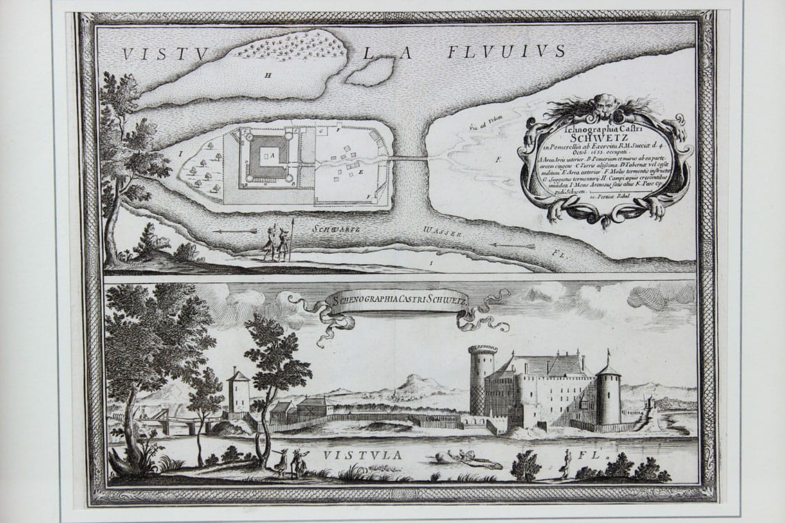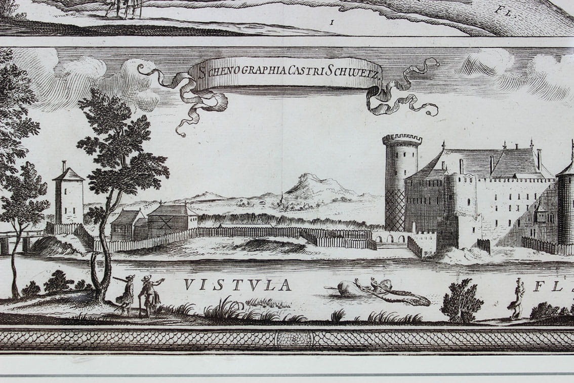 Plan i widok zamku w Świeciu nad Wisłą podczas potopu szwedzkiego - rycina wg rysunku Erika Dahlbergha ukazała się w dziele Samuela Pufendorfa „De Rebus a Carolo Gustavo...”. Wydanie : Norymberga 1696. Zatytułowana: „Ichnographia Castri Schwetz in Pomerellia ab Exercitu R. M. Sueciae d. 4. Octob: 1655. occupati”; 1696. Stan zachowania st. bdb.. Całość w ozdobnym passe-partout w drewnianej ramie za szkłem. Wymiar płyty: 24,5cm x 31 cm (odbitka na dwóch połączonych arkuszach papieru) Wymiar ramy 37cm x 46,5 cm