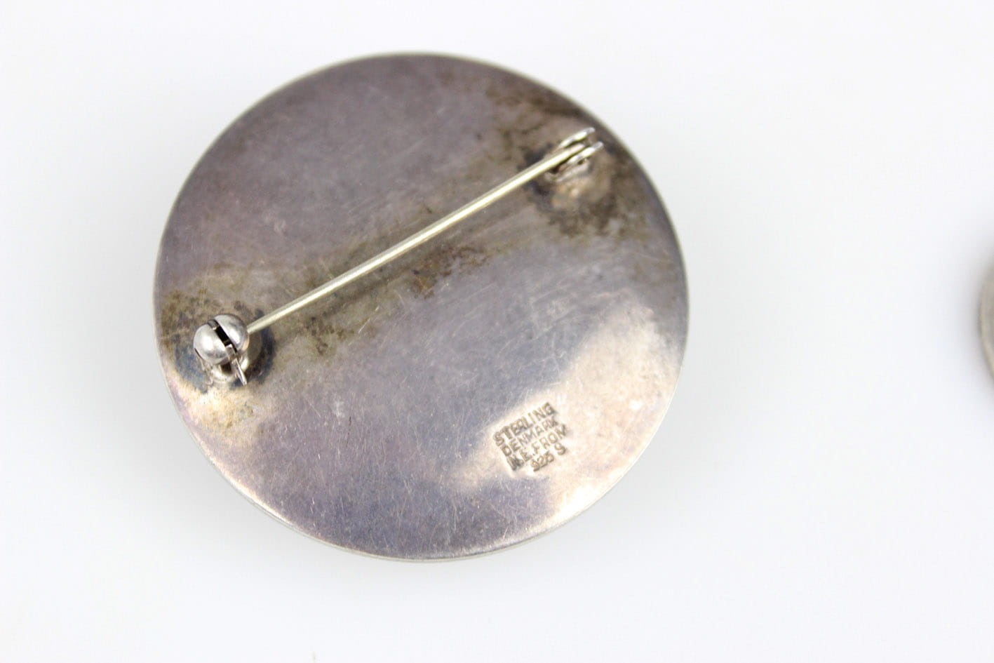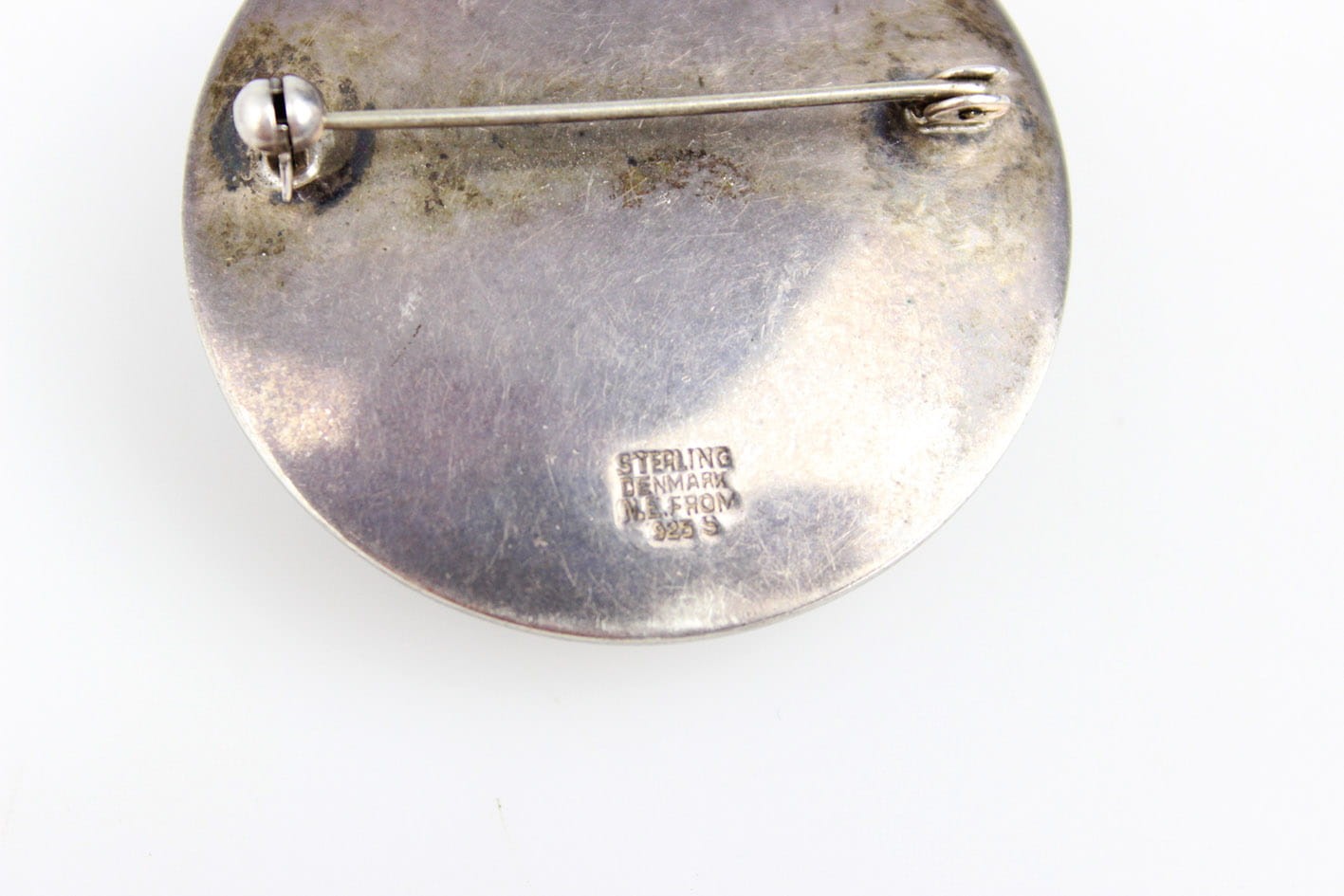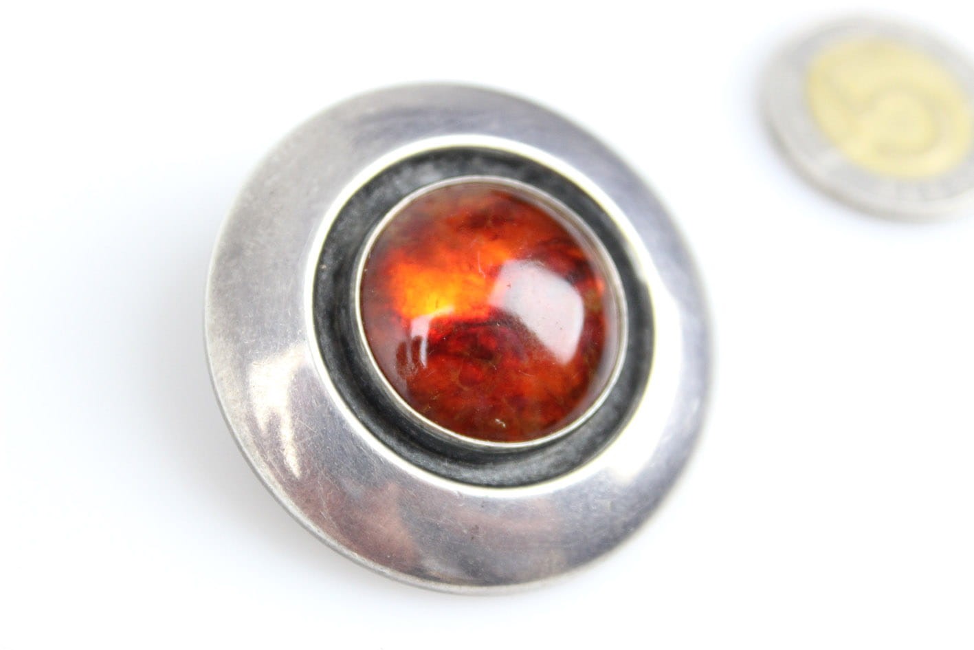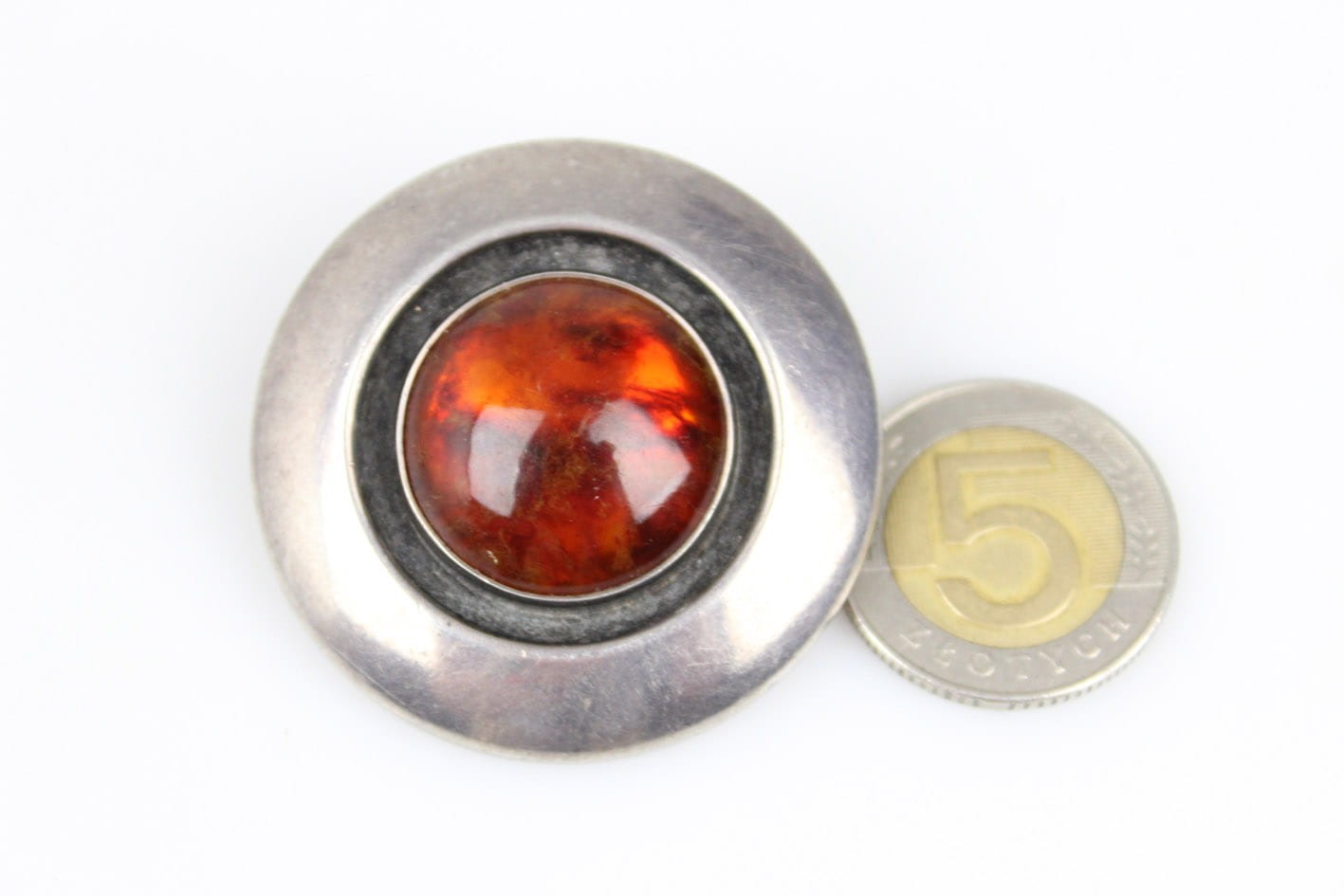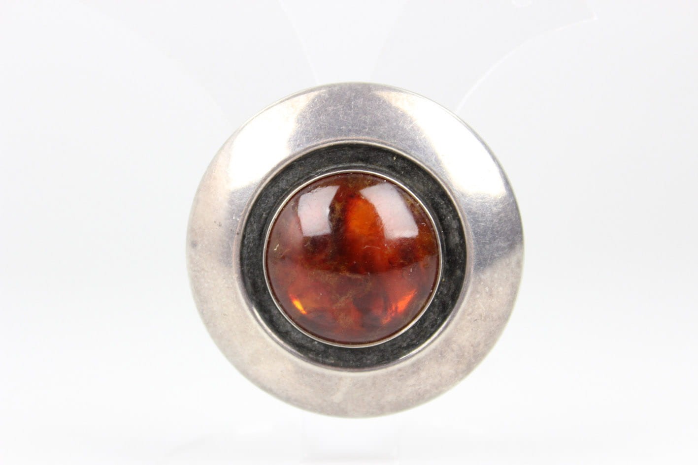 Okazała, okrągła broszka z lat 60/70-tych XX wieku, pochodząca z duńskiej wytwórni jubilerskiej Nielsa Erika From. Broszka wykonana w srebrze, sygnowana puncą STERLING DENMARK N.E.FROM 925S. Centralną jej część zdobi okazały bursztyn bałtycki w szlifie kaboszonowym. Wymiary: