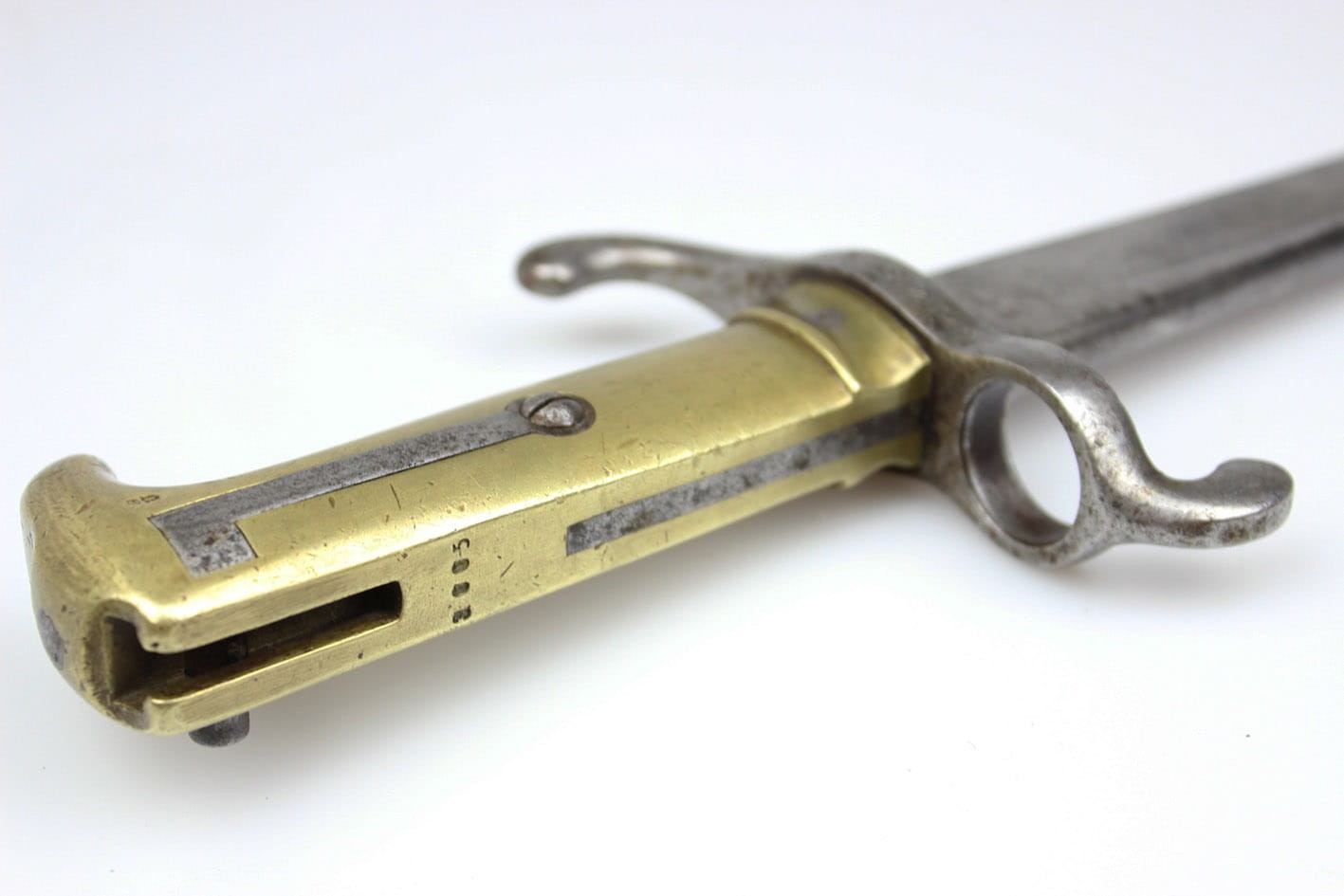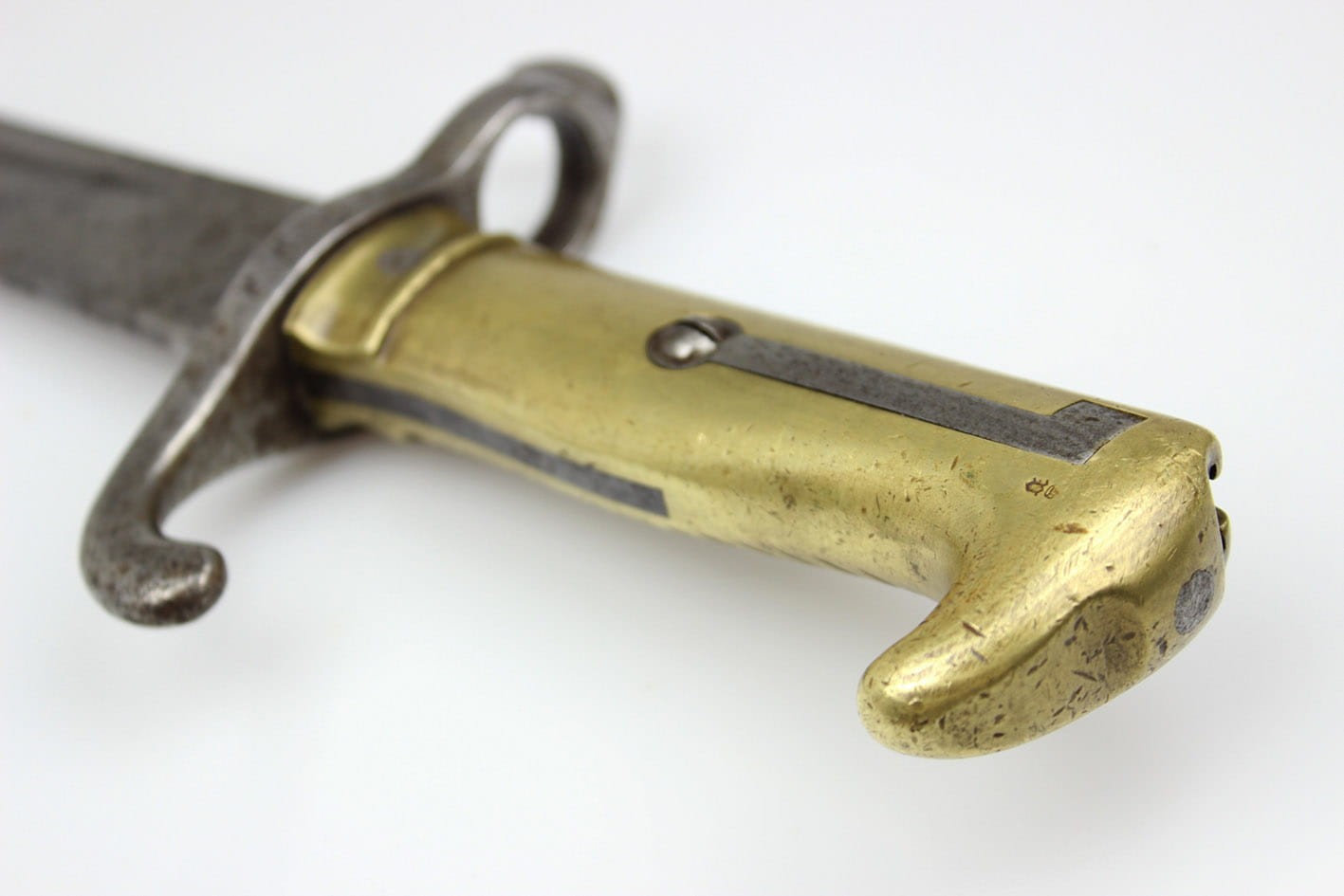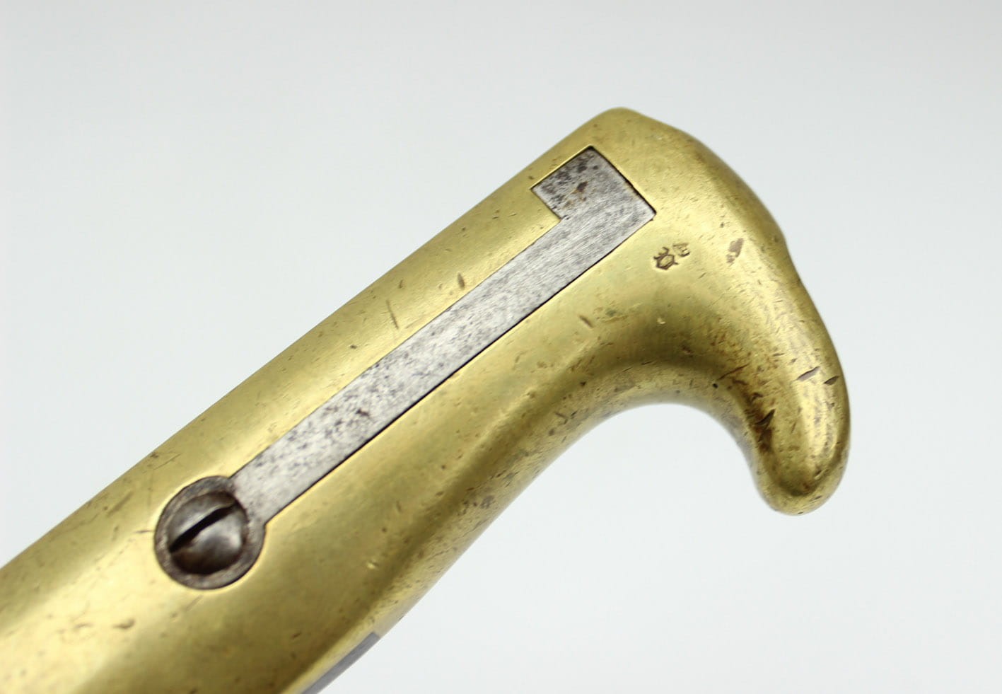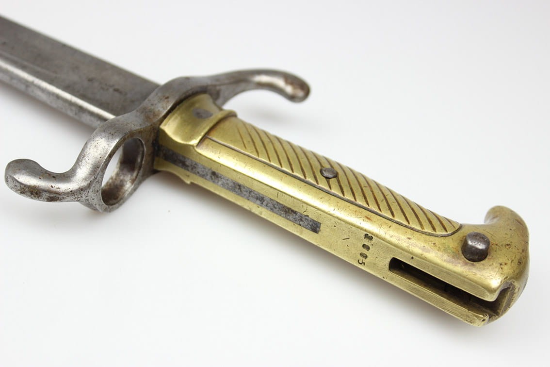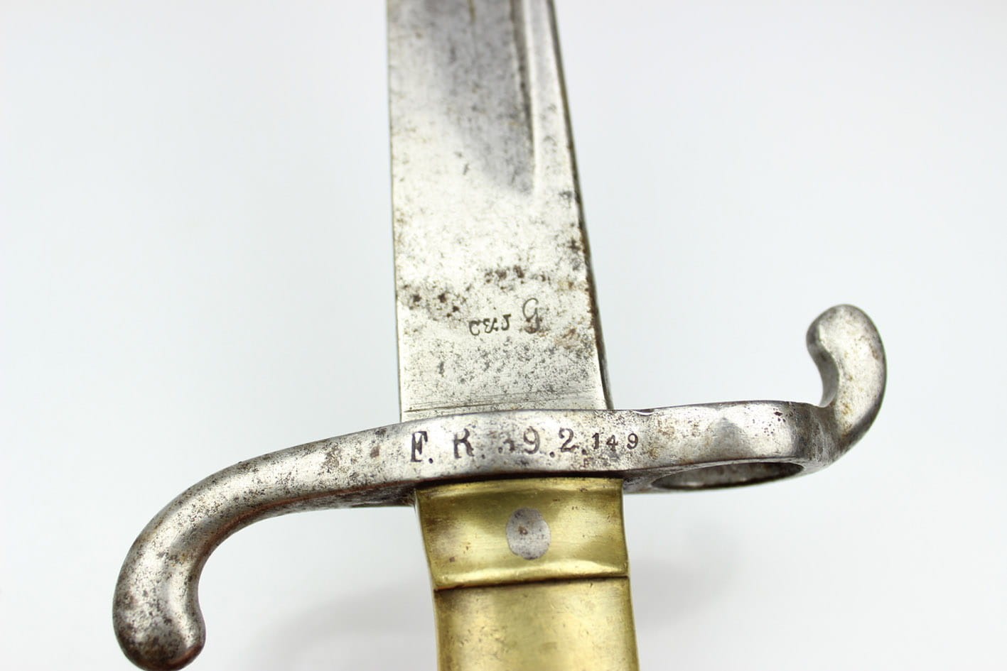 Oryginalny pruski bagnet fizylierów przeznaczony do karabinu Dreyse wzór 1860. Bagnet z masywną rękojeścią odlewaną w mosiądzu , jelec o kształcie litery S i zatrzask z płaską sprężyną. Głownia polerowana, szeroka płaska, wzmocniona ością przechodzącą przez całą jej długość. Grzbiet w przekroju okrągły. Oznaczenia na progach głowni wybite sygnatury- po stronie wewnętrznej C&J oraz wybita litera G ( Guss Stahl), oznaczająca wykonanie głowni ze stali węglowej. Po stronie zewnętrznej W pod koroną (Wilhelm I Hohenzollern, 1797-1888) liczba 62 ( bagnet przyjęty na stan armii w 1862 roku) oraz cecha kontroli technicznej gotyckie D pod koroną. Na jelcu wybite oznaczenie pułkowe F.R.39 (Füsilier-Regiment 39) Dolnoreński Pułk Fizylierów, który w latach 1860-1866 stacjonował w Koblencji, a od 1866 w Düsseldorfie. Bagnet w bardzo dobrym stanie zachowania. jedynie drobna kaszka na końcu głowni. Sprężyna zamka sprawna.