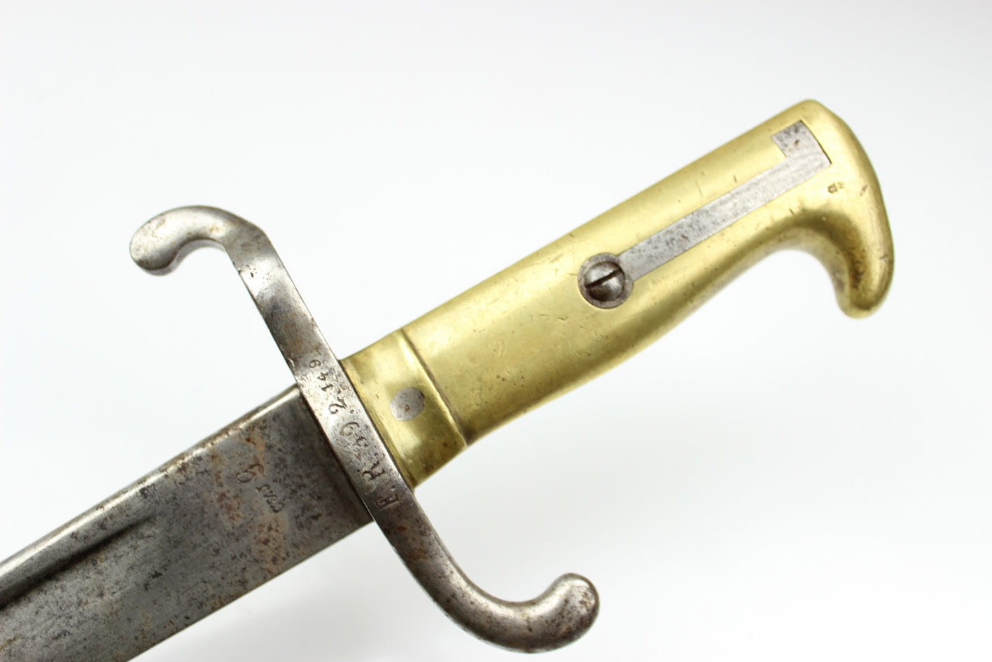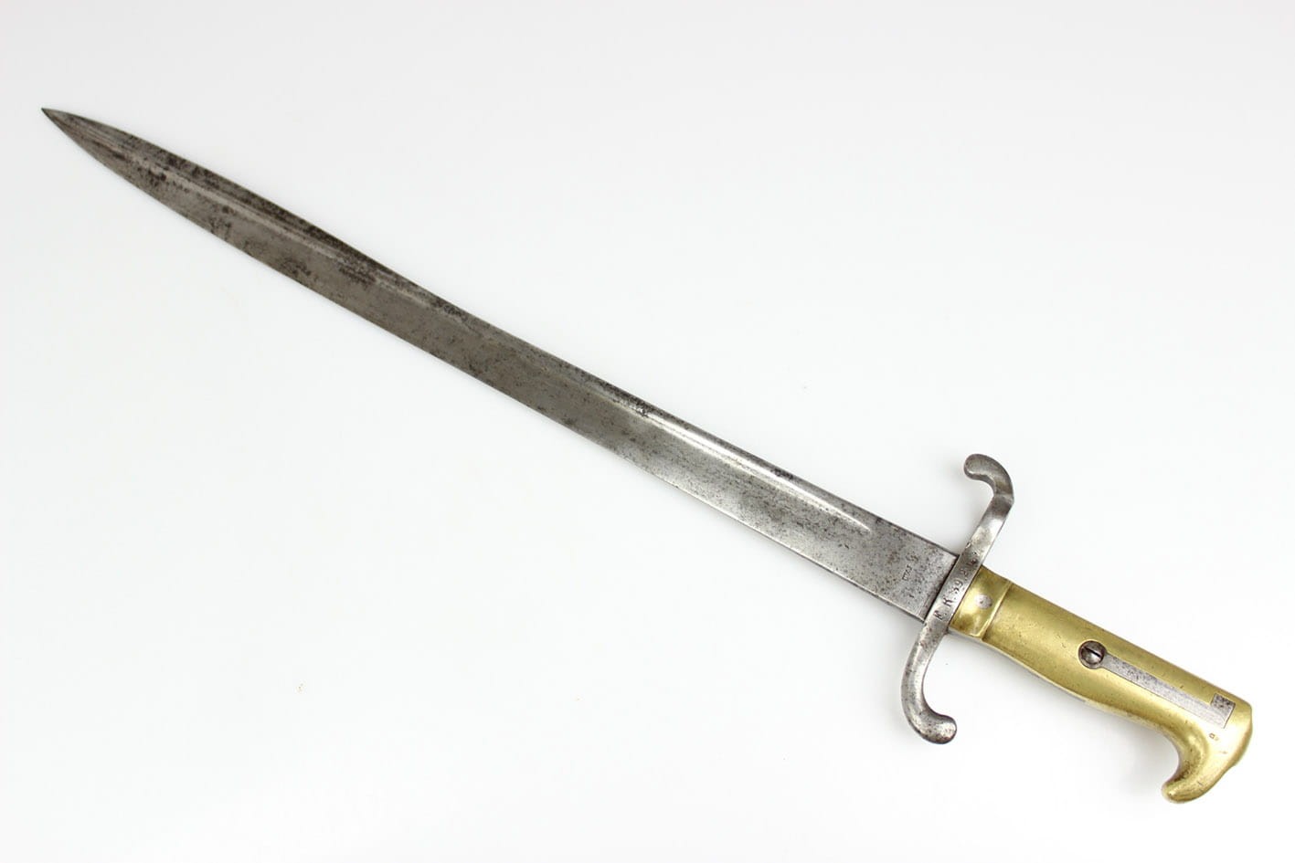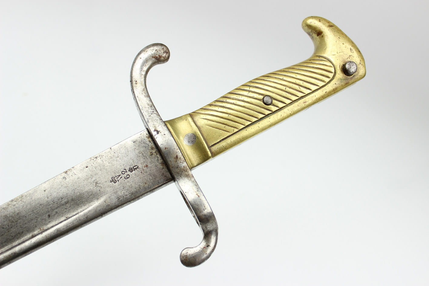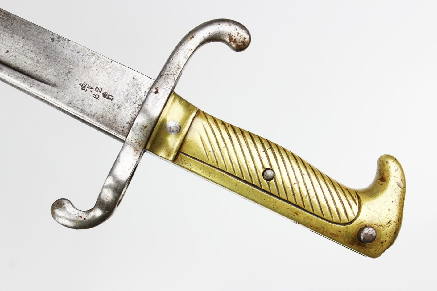 Oryginalny pruski bagnet fizylierów przeznaczony do karabinu Dreyse wzór 1860. Bagnet z masywną rękojeścią odlewaną w mosiądzu , jelec o kształcie litery S i zatrzask z płaską sprężyną. Głownia polerowana, szeroka płaska, wzmocniona ością przechodzącą przez całą jej długość. Grzbiet w przekroju okrągły. Oznaczenia na progach głowni wybite sygnatury- po stronie wewnętrznej C&J oraz wybita litera G ( Guss Stahl), oznaczająca wykonanie głowni ze stali węglowej. Po stronie zewnętrznej W pod koroną (Wilhelm I Hohenzollern, 1797-1888) liczba 62 ( bagnet przyjęty na stan armii w 1862 roku) oraz cecha kontroli technicznej gotyckie D pod koroną. Na jelcu wybite oznaczenie pułkowe F.R.39 (Füsilier-Regiment 39) Dolnoreński Pułk Fizylierów, który w latach 1860-1866 stacjonował w Koblencji, a od 1866 w Düsseldorfie. Bagnet w bardzo dobrym stanie zachowania. jedynie drobna kaszka na końcu głowni. Sprężyna zamka sprawna.