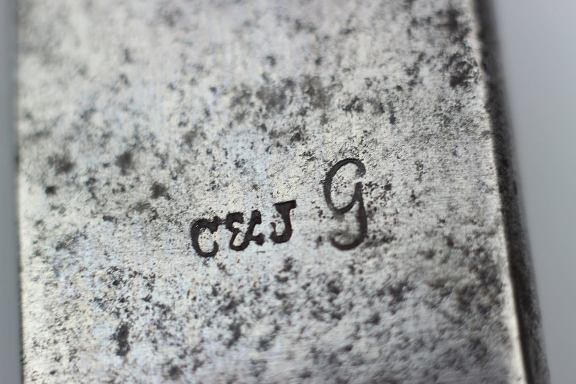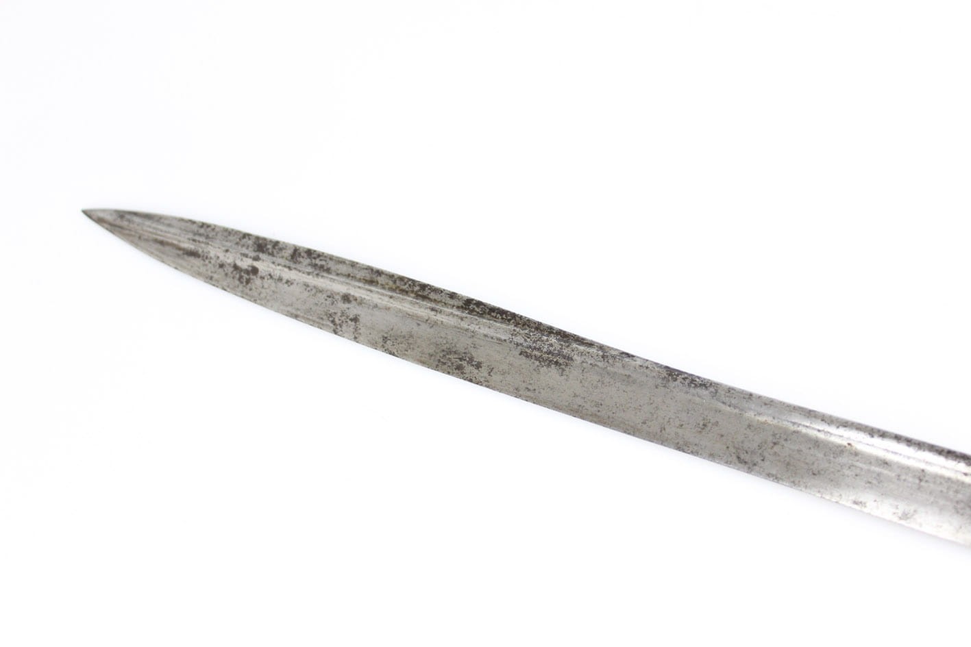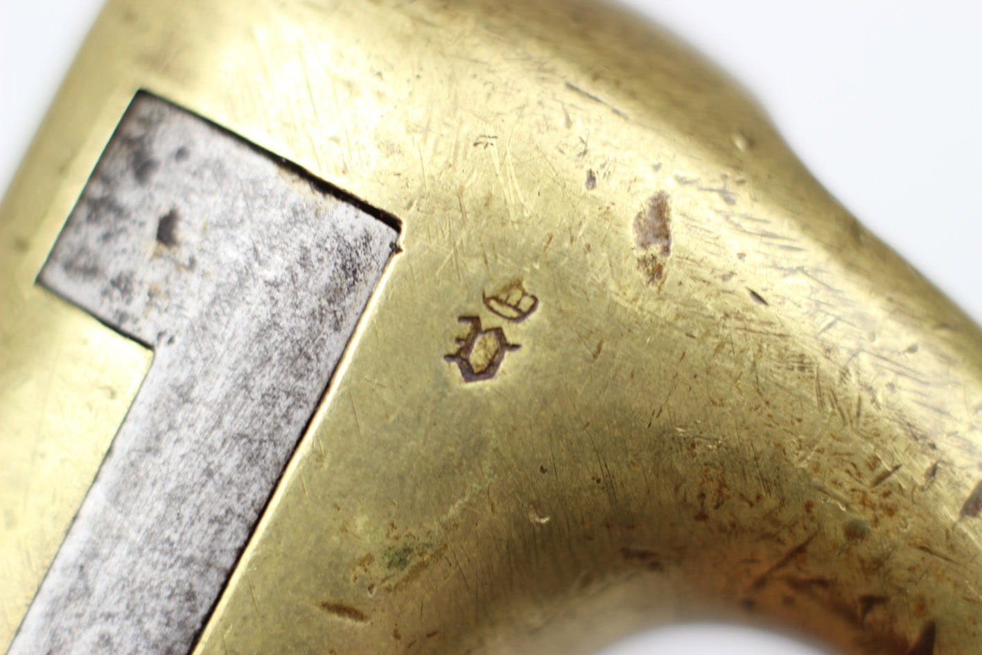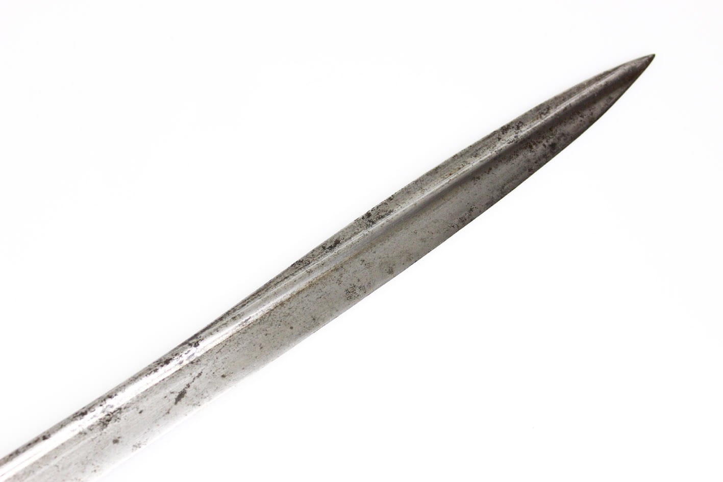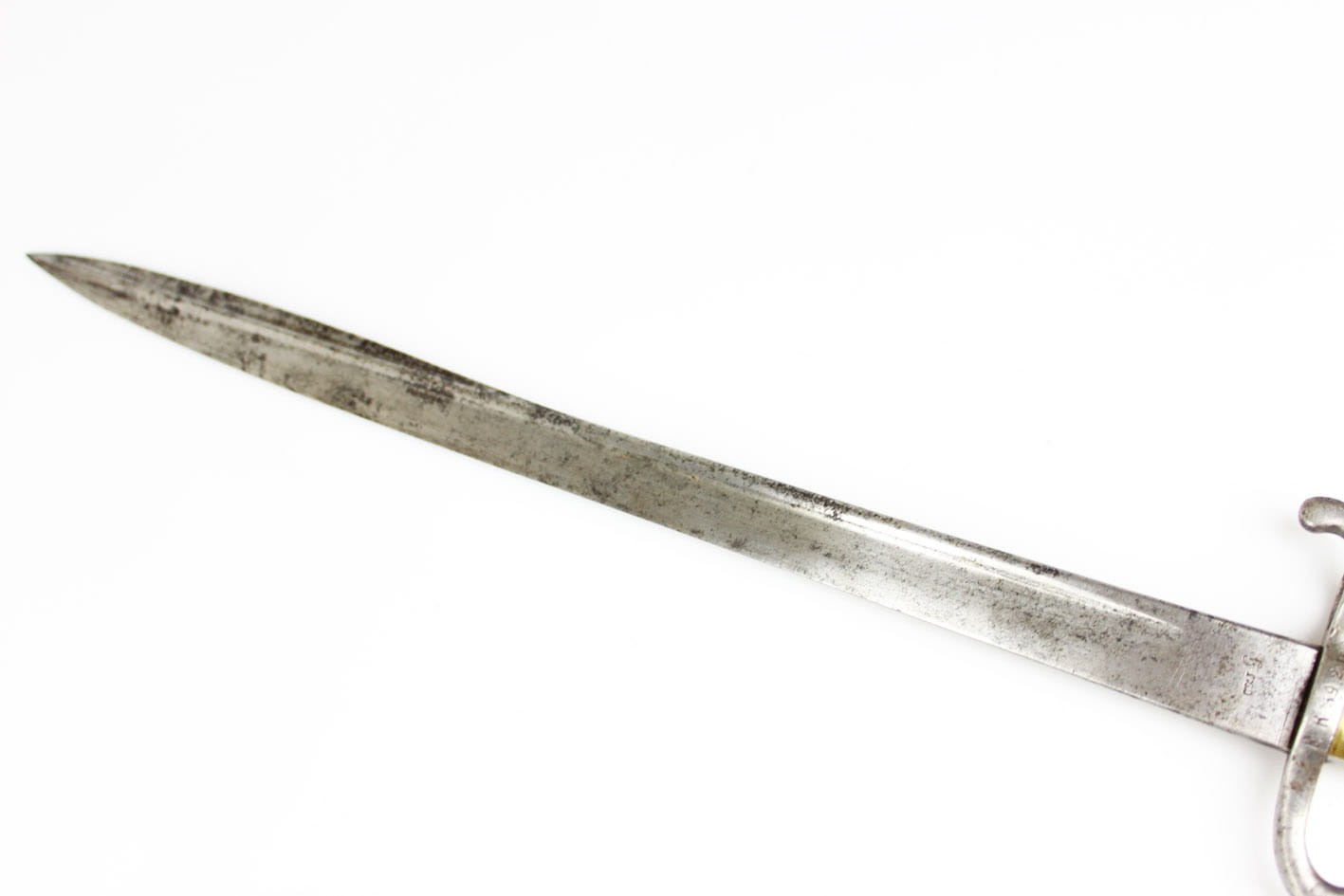 Oryginalny pruski bagnet fizylierów przeznaczony do karabinu Dreyse wzór 1860. Bagnet z masywną rękojeścią odlewaną w mosiądzu , jelec o kształcie litery S i zatrzask z płaską sprężyną. Głownia polerowana, szeroka płaska, wzmocniona ością przechodzącą przez całą jej długość. Grzbiet w przekroju okrągły. Oznaczenia na progach głowni wybite sygnatury- po stronie wewnętrznej C&J oraz wybita litera G ( Guss Stahl), oznaczająca wykonanie głowni ze stali węglowej. Po stronie zewnętrznej W pod koroną (Wilhelm I Hohenzollern, 1797-1888) liczba 62 ( bagnet przyjęty na stan armii w 1862 roku) oraz cecha kontroli technicznej gotyckie D pod koroną. Na jelcu wybite oznaczenie pułkowe F.R.39 (Füsilier-Regiment 39) Dolnoreński Pułk Fizylierów, który w latach 1860-1866 stacjonował w Koblencji, a od 1866 w Düsseldorfie. Bagnet w bardzo dobrym stanie zachowania. jedynie drobna kaszka na końcu głowni. Sprężyna zamka sprawna.