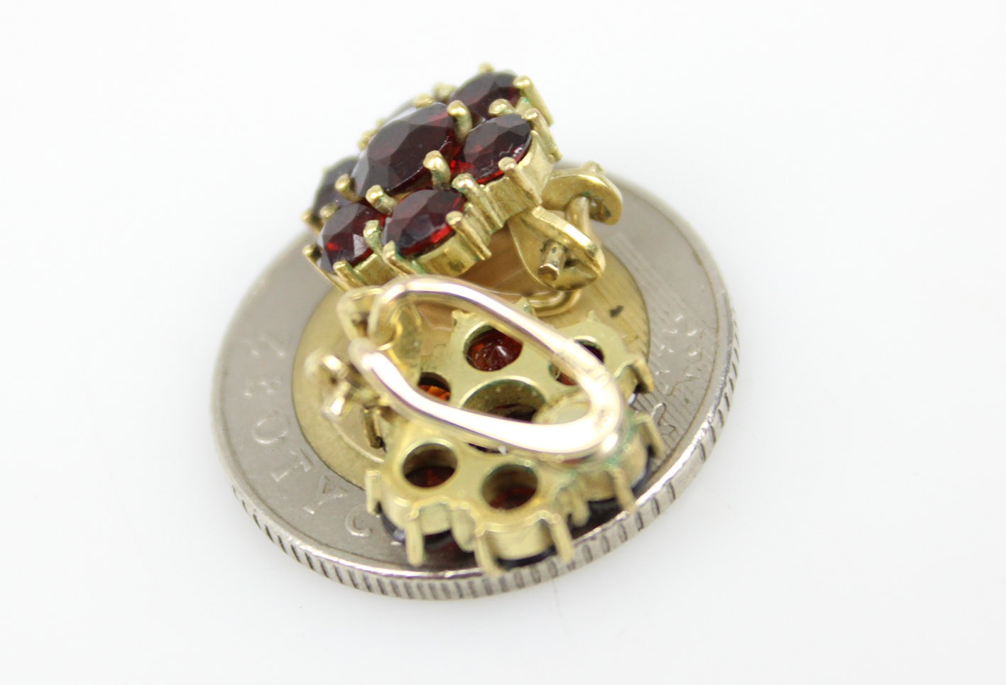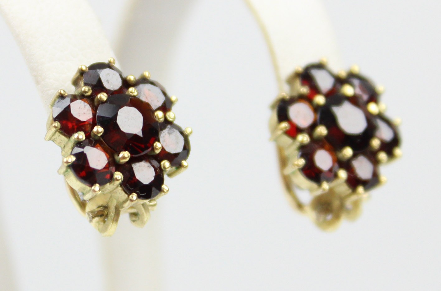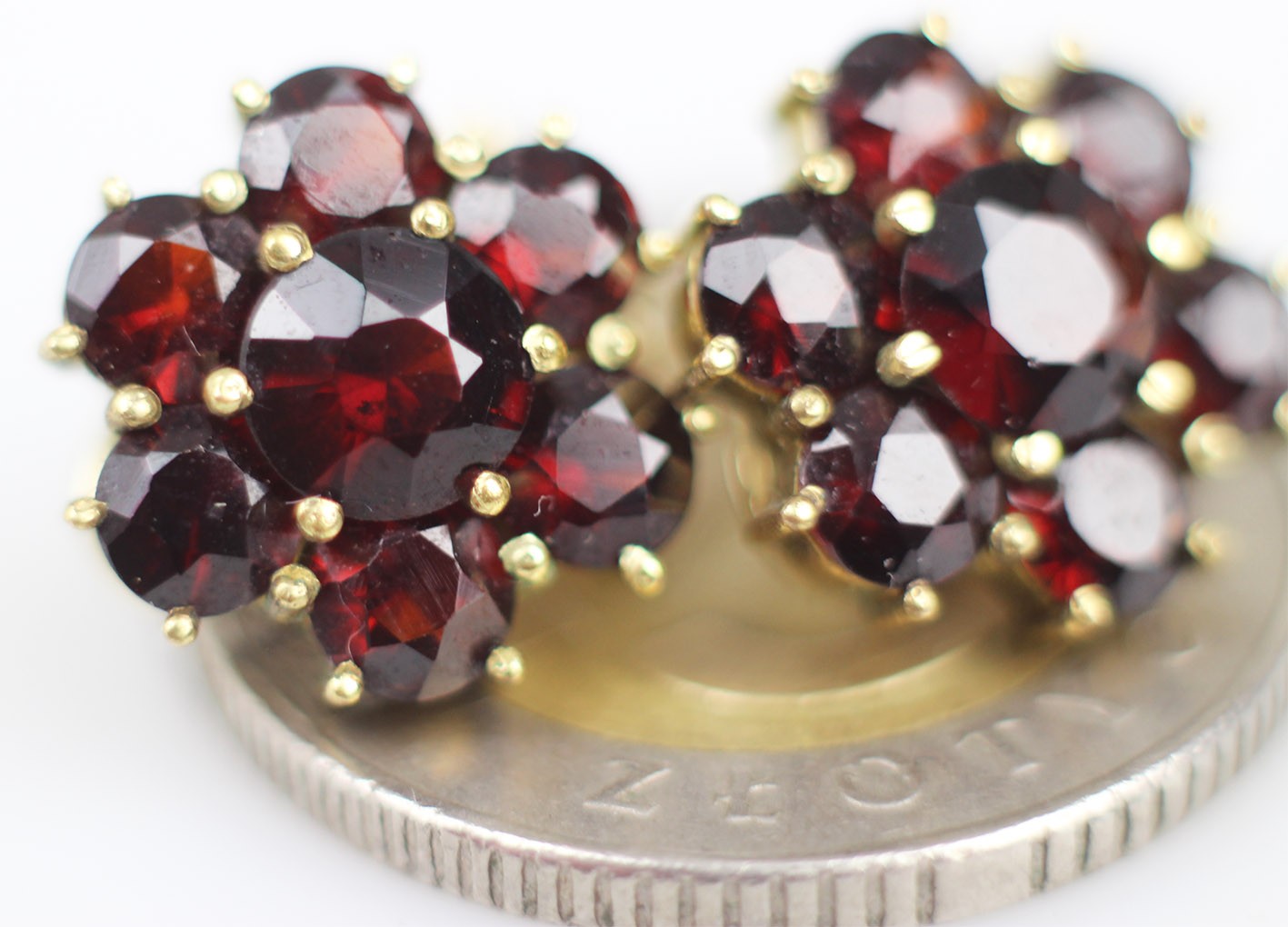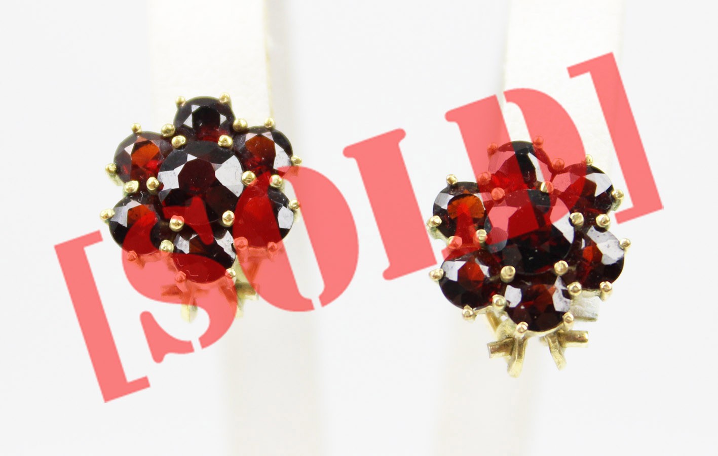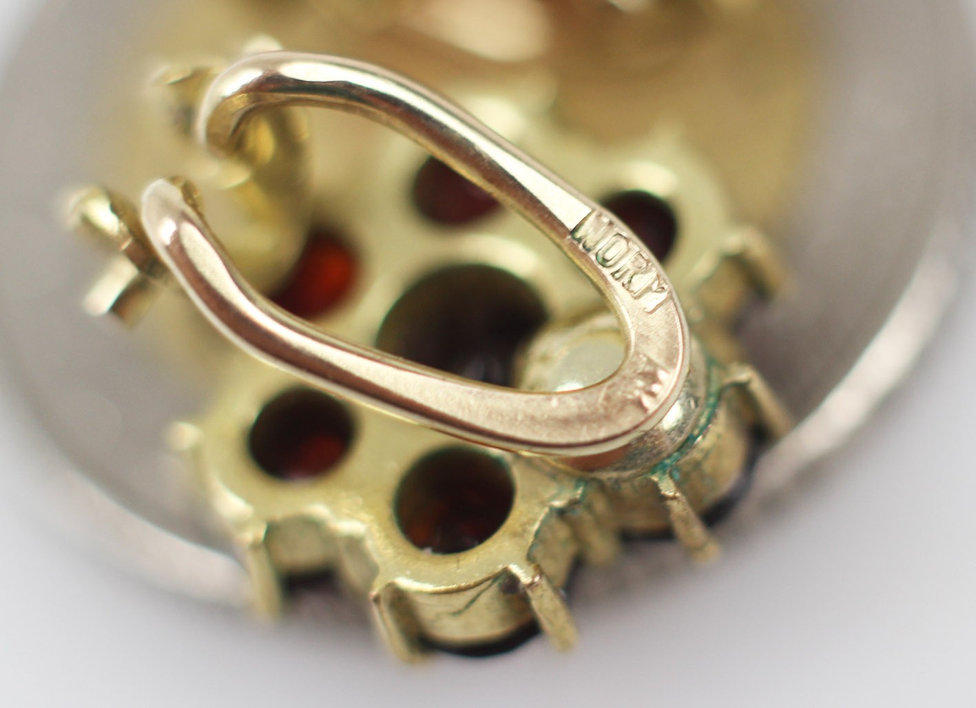 Stylowe klipsy z lat 30. XX wieku, wykonane w stopie metali znanym jako Norm Gold /Norm- szeroko stosowanym w Europie w okresie międzywojennym. Stop ten ceniono za dużą plastyczność, trwałość oraz odporność na ciemnienie, dzięki czemu idealnie nadawał się do oprawy kamieni. Kolczyki zdobione naturalnymi granatami o głębokiej, winno-czerwonej barwie, osadzonymi w klasycznej, rozetowej kompozycji typu „kwiat”. Kamienie szlifowane fasetowo, dobrze dobrane kolorystycznie, z ładnym połyskiem w świetle. Oprawa w formie drobnych łapek, typowa dla biżuterii art déco i okresu międzywojennego. Konstrukcja solidna, estetyczna, wykonana z dużą starannością. Zapięcia typu klips – sprawne, stabilne, wygodne w noszeniu. Stan zachowania bardzo dobry jak na wiek przedmiotu. Granaty bez pęknięć i wyszczerbień, oprawa kompletna, bez luzów. Wymiary :