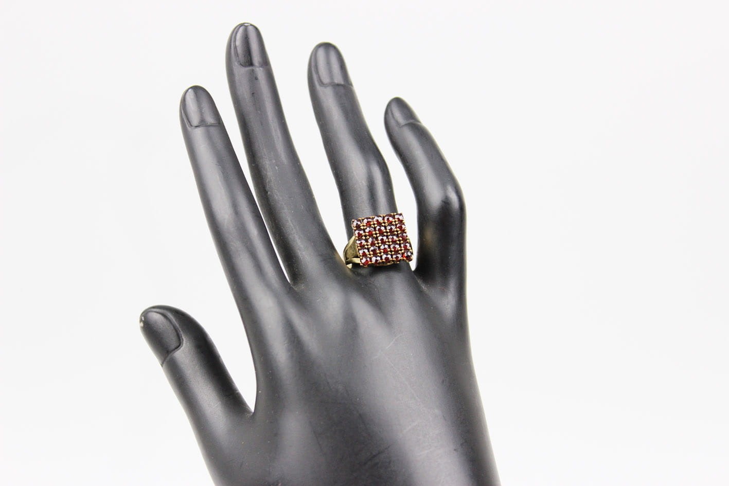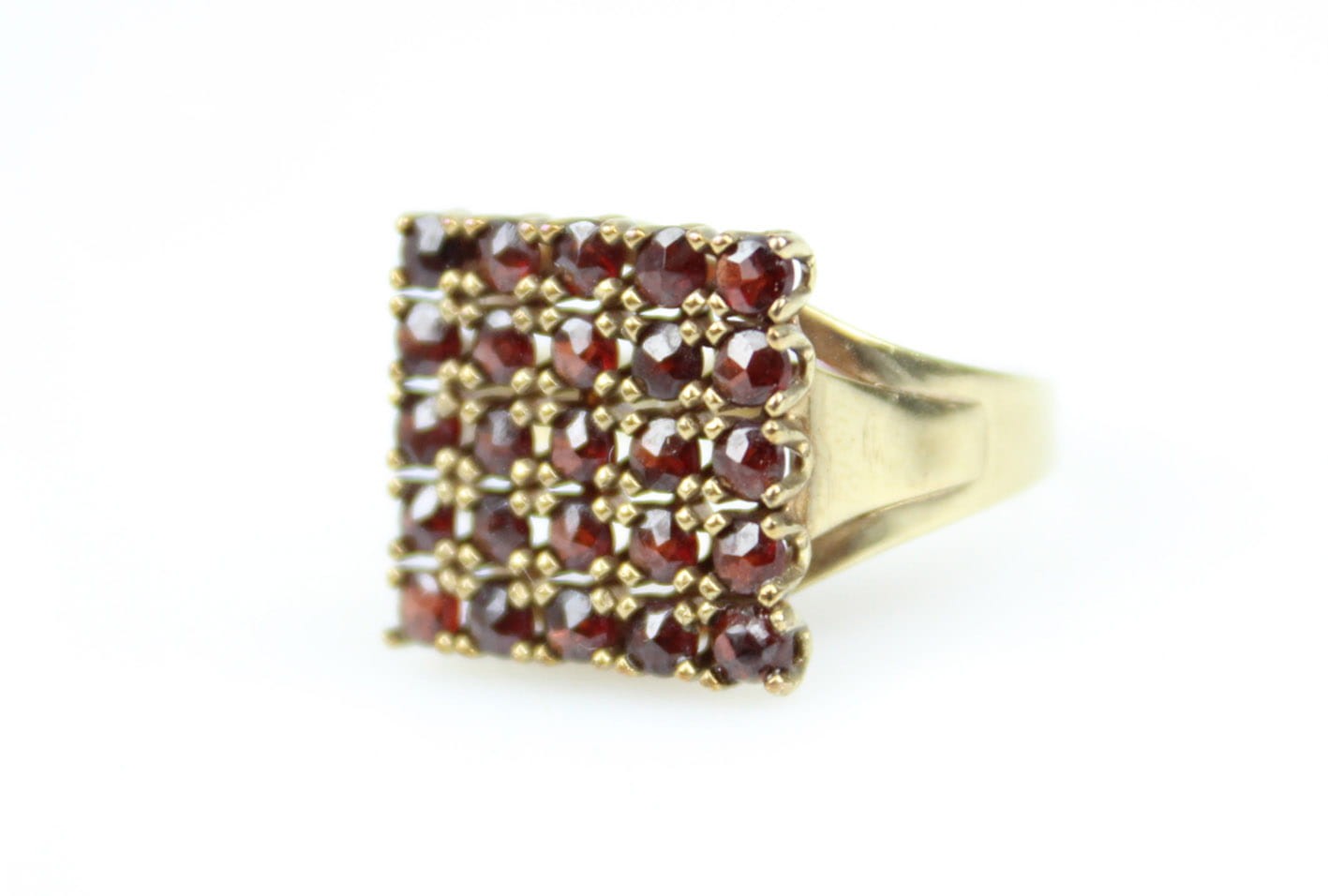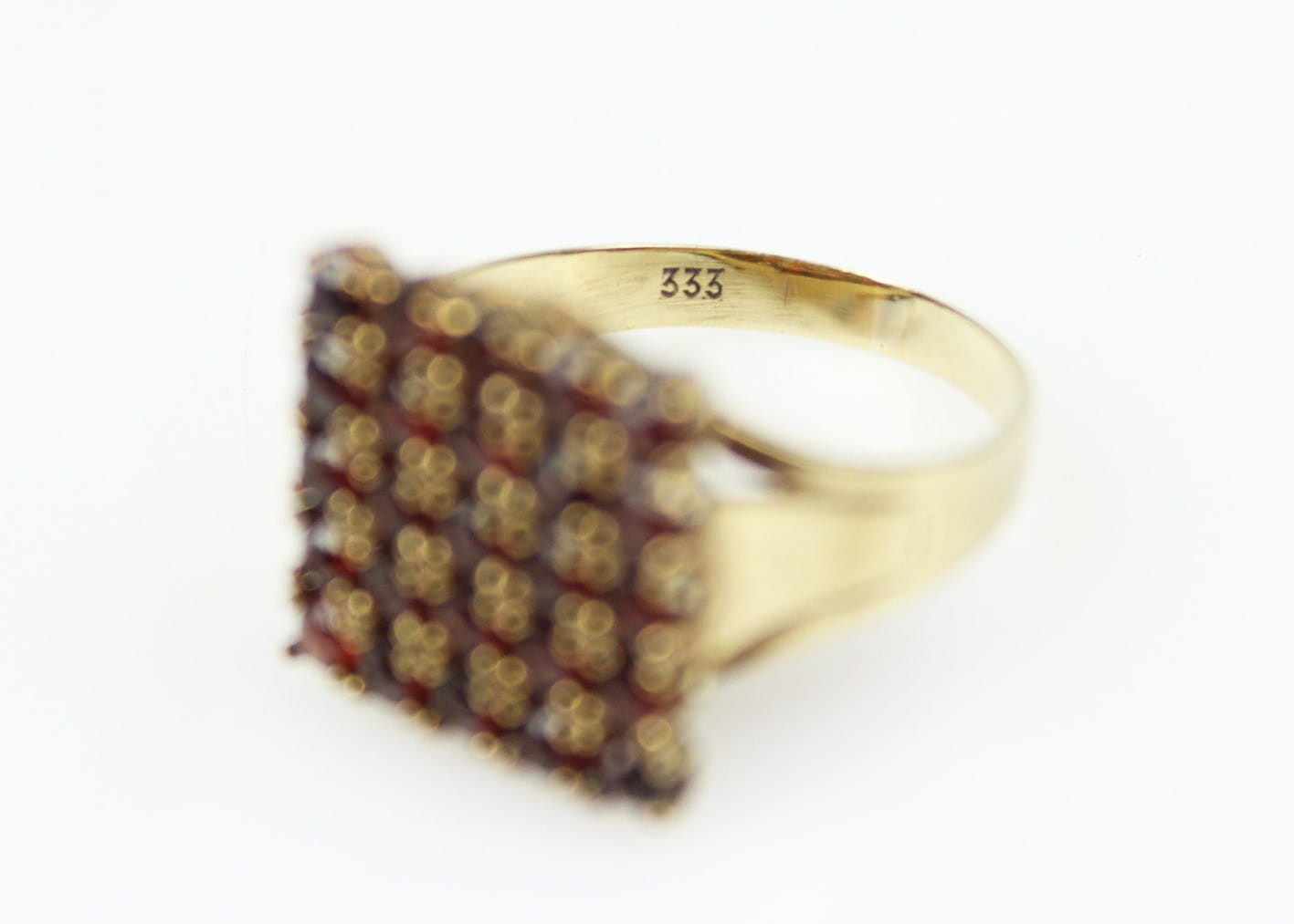 Modernistyczny pierścionek z końca lat 30-tych XX wieku. Główka w formie prostokątnej, kameryzowana naturalnymi granatami, konstrukcja w złocie ośmio karatowym sygnowana na obrączce puncą 333. Stan zachowania bardzo dobry, kamienie w komplecie. Wymiary: