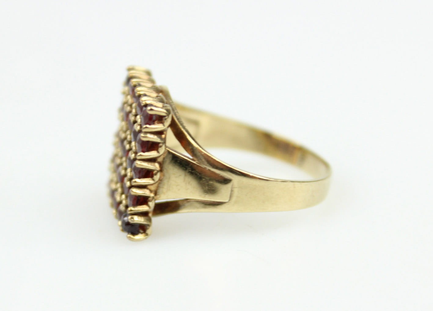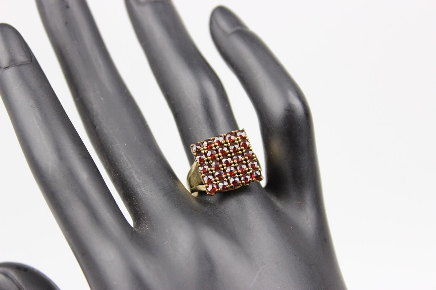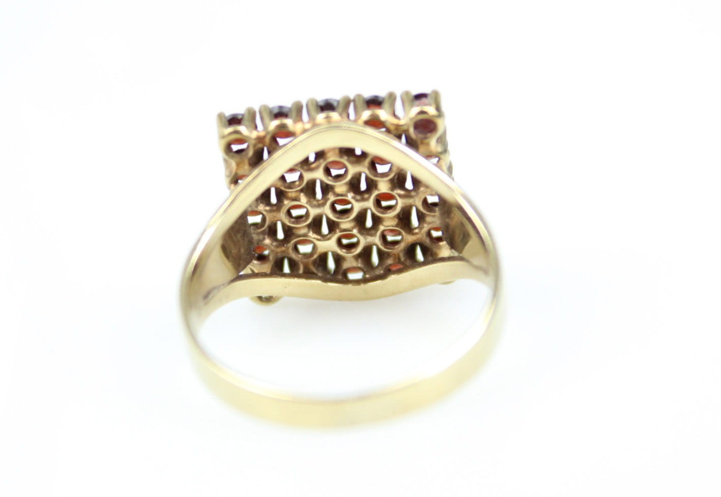 Modernistyczny pierścionek z końca lat 30-tych XX wieku. Główka w formie prostokątnej, kameryzowana naturalnymi granatami, konstrukcja w złocie ośmio karatowym sygnowana na obrączce puncą 333. Stan zachowania bardzo dobry, kamienie w komplecie. Wymiary: