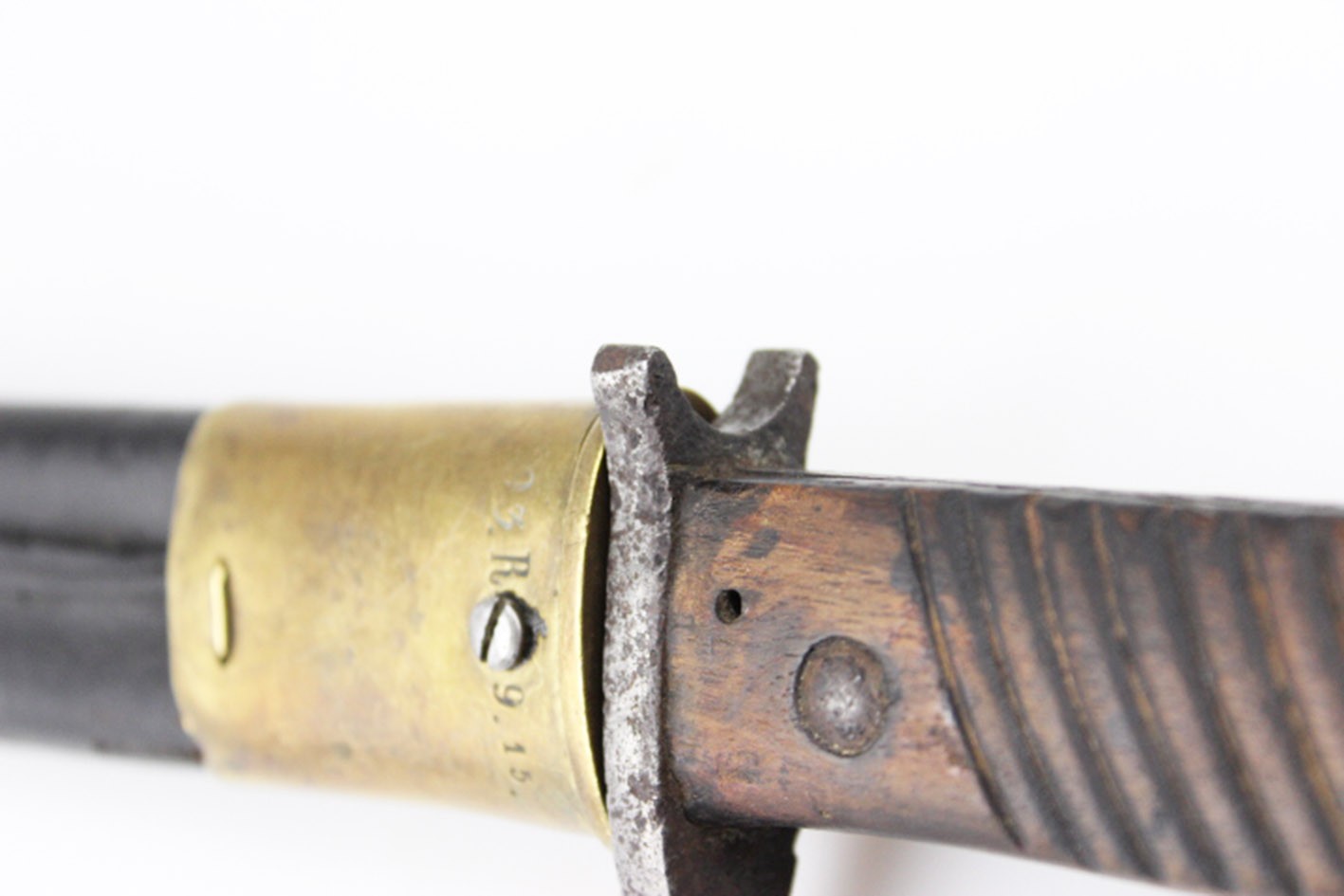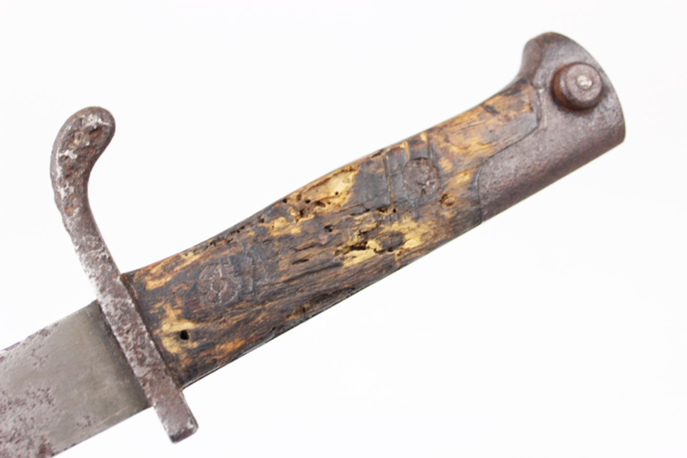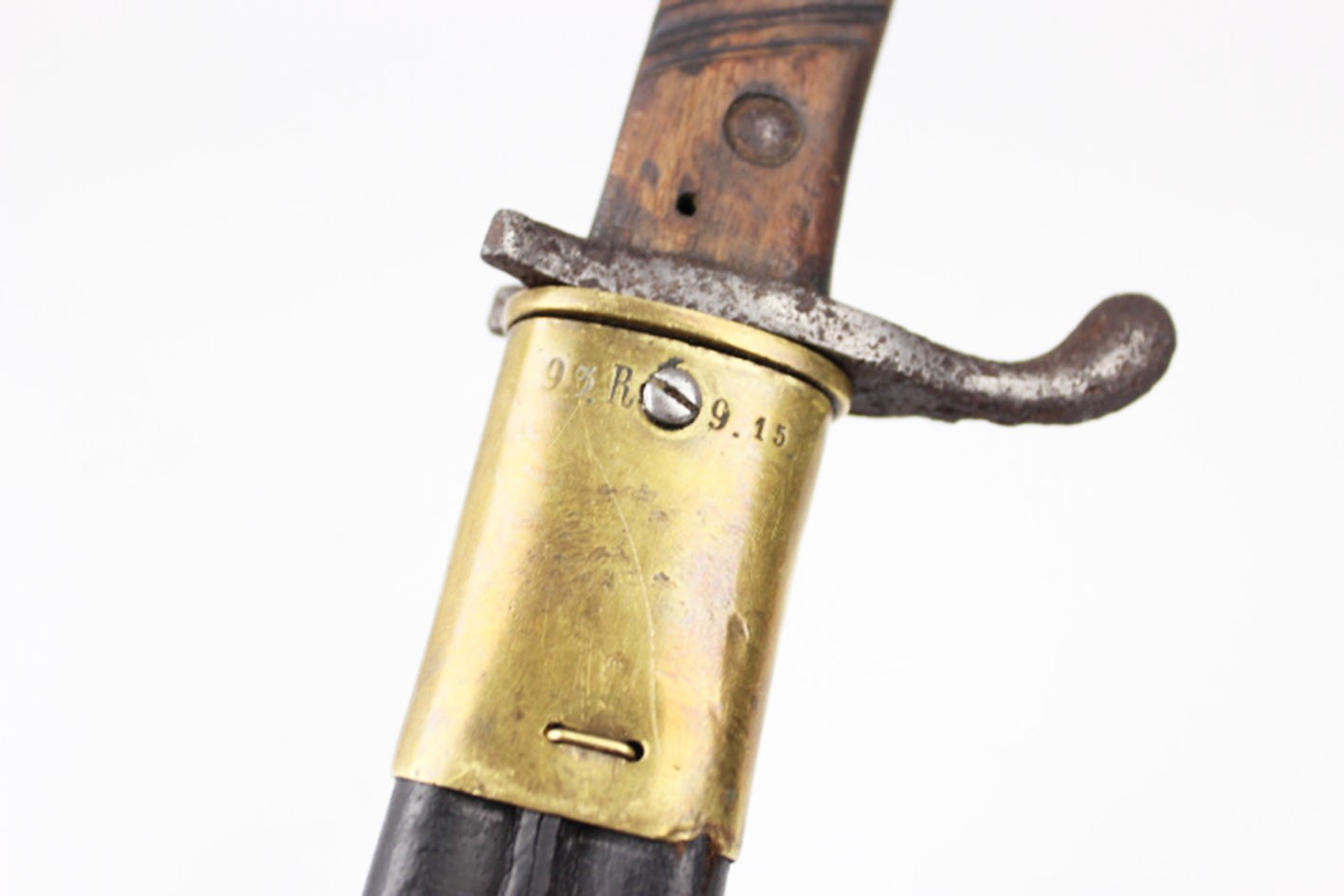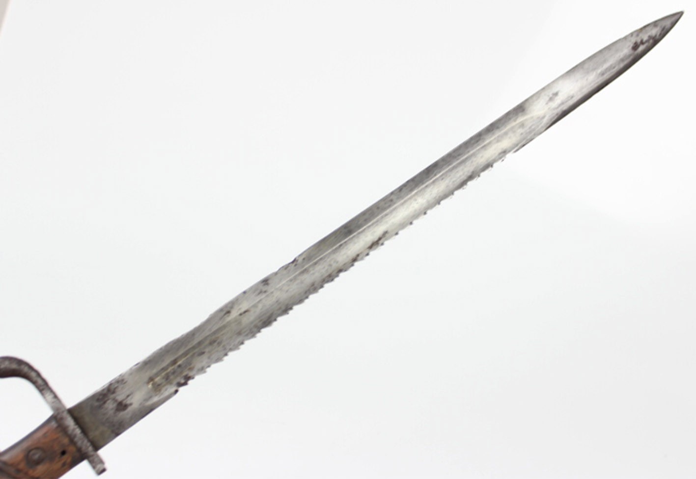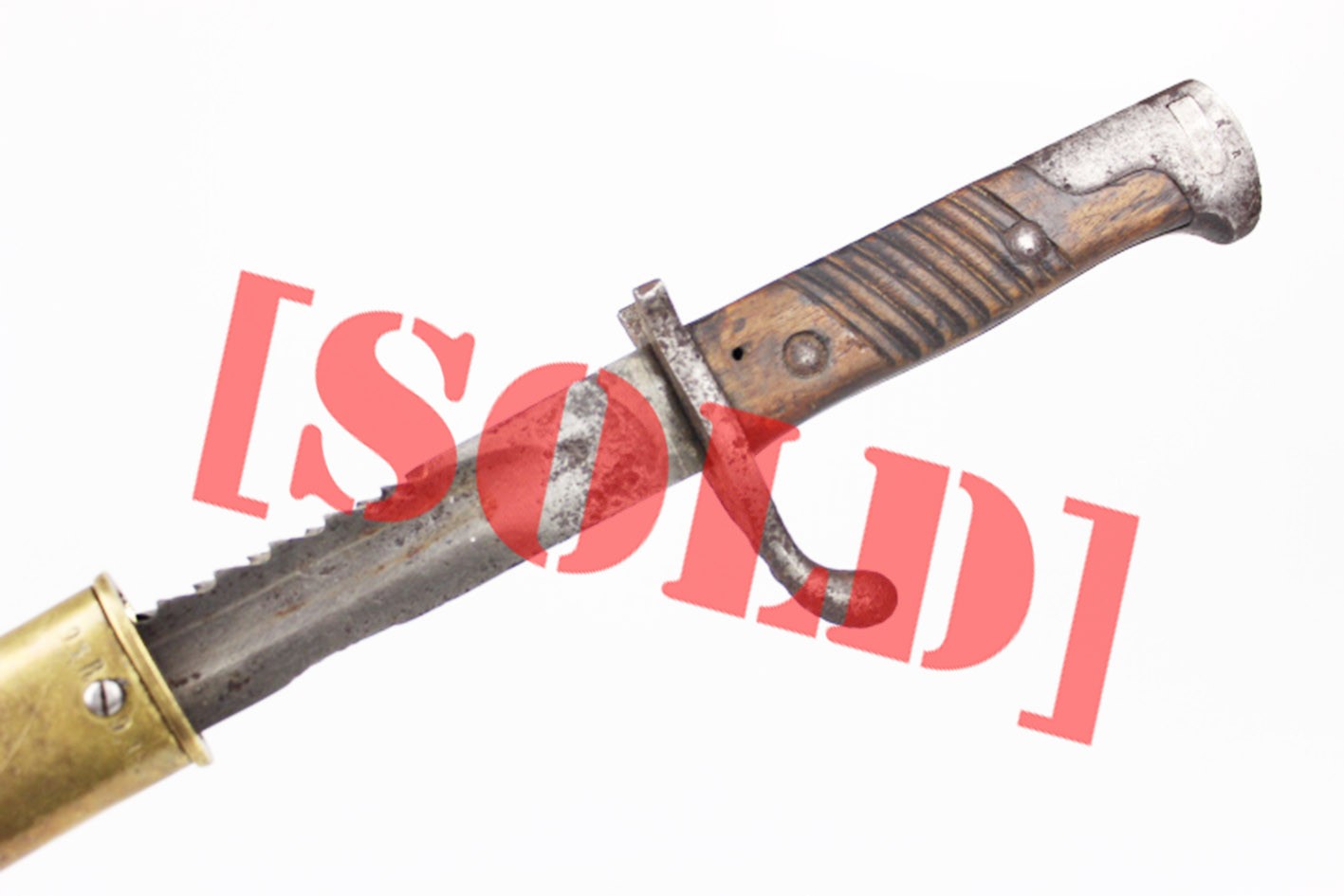 Prezentowany bagnet posiada oryginalne, nieruszane drewniane okładziny rękojeści, z widocznymi śladami użytkowania i starzenia, ale bez wtórnych ingerencji. Zamek sprawny, a na elementach metalowych zachowane punce odbioru wojskowego. Głownia z piłą bez oznaczeń producenta oraz roku odbioru, co jest zgodne z praktyką spotykaną w tego typu konwersjach.