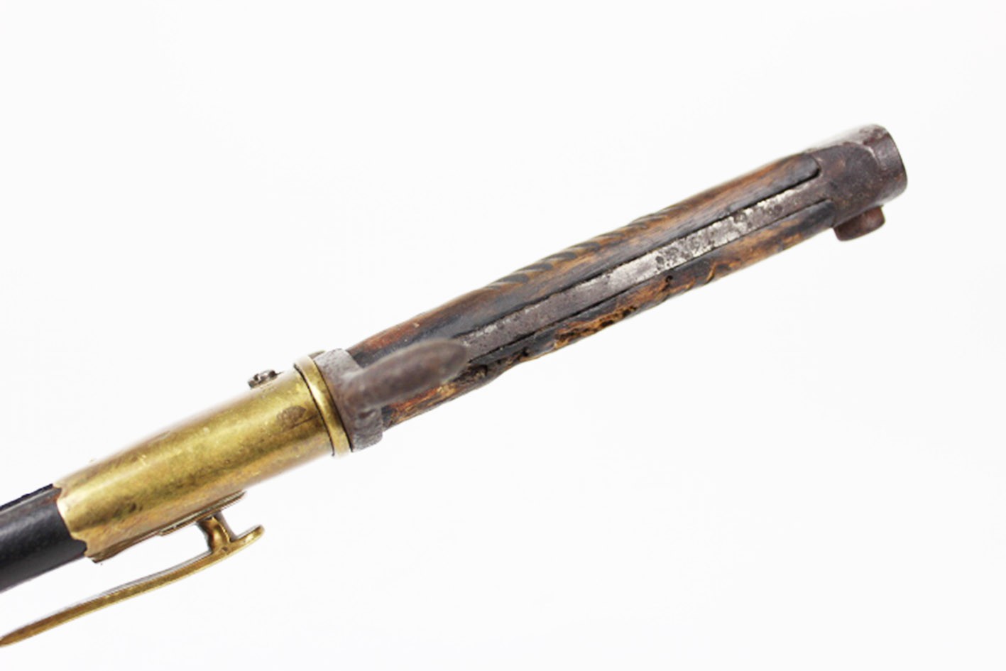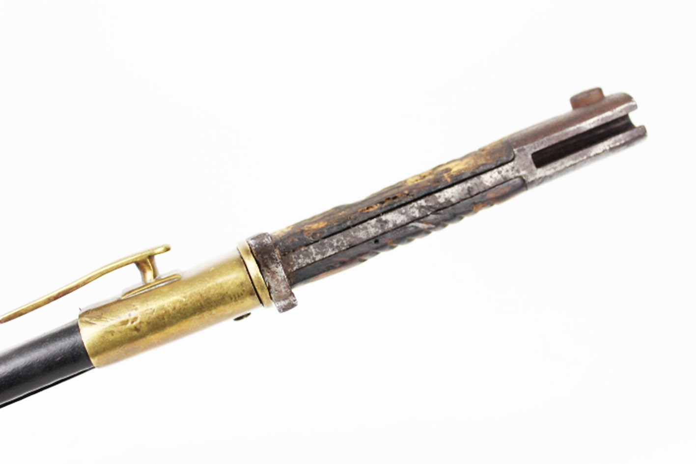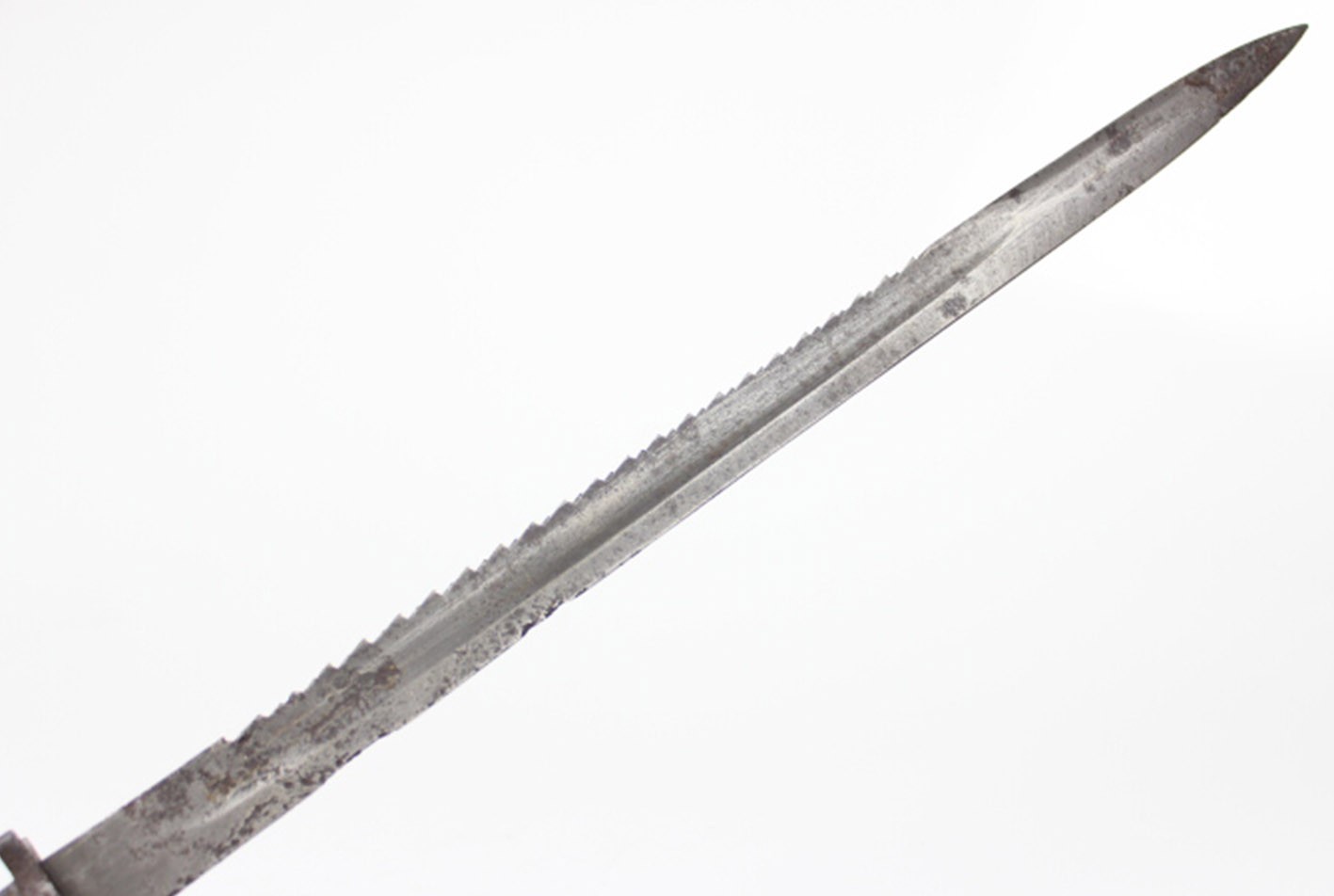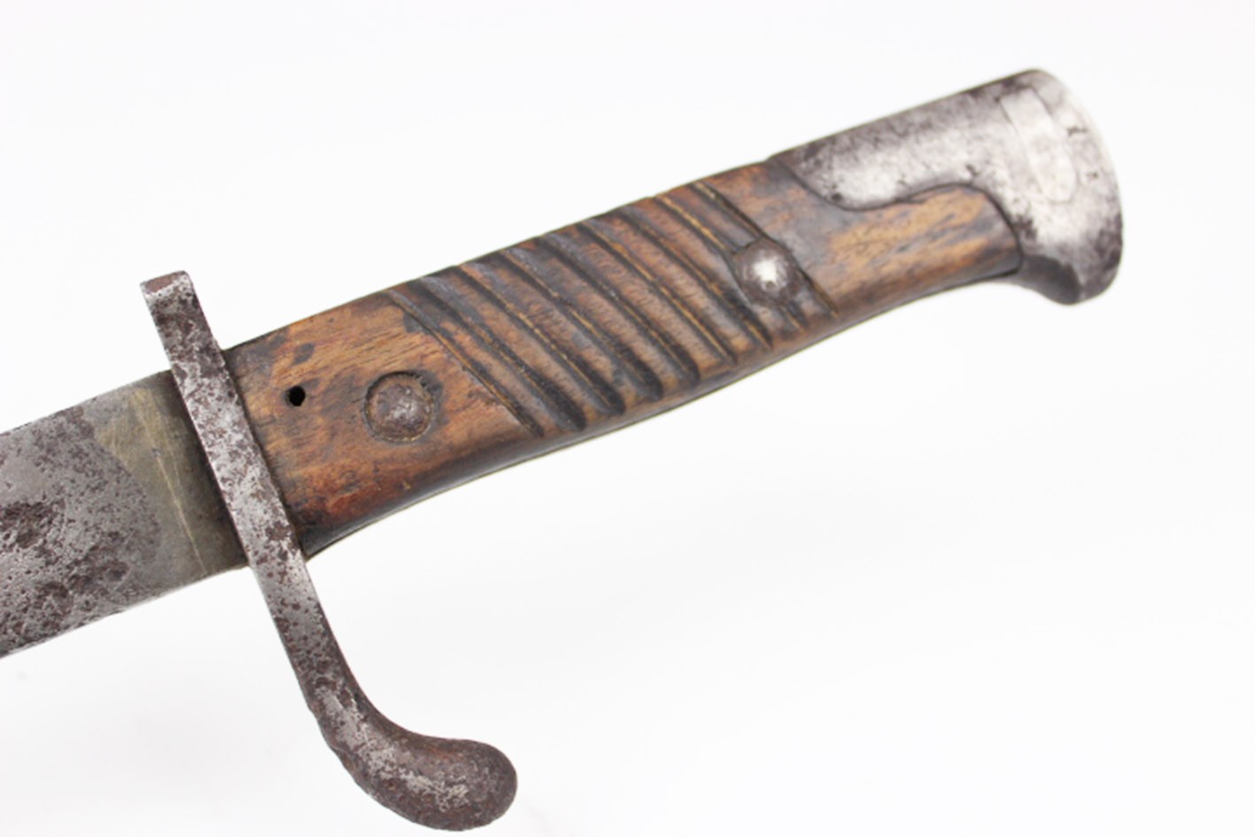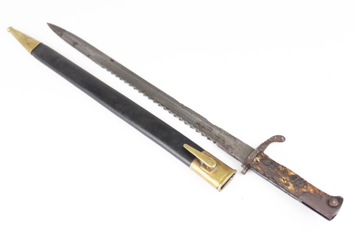Prezentowany bagnet posiada oryginalne, nieruszane drewniane okładziny rękojeści, z widocznymi śladami użytkowania i starzenia, ale bez wtórnych ingerencji. Zamek sprawny, a na elementach metalowych zachowane punce odbioru wojskowego. Głownia z piłą bez oznaczeń producenta oraz roku odbioru, co jest zgodne z praktyką spotykaną w tego typu konwersjach.