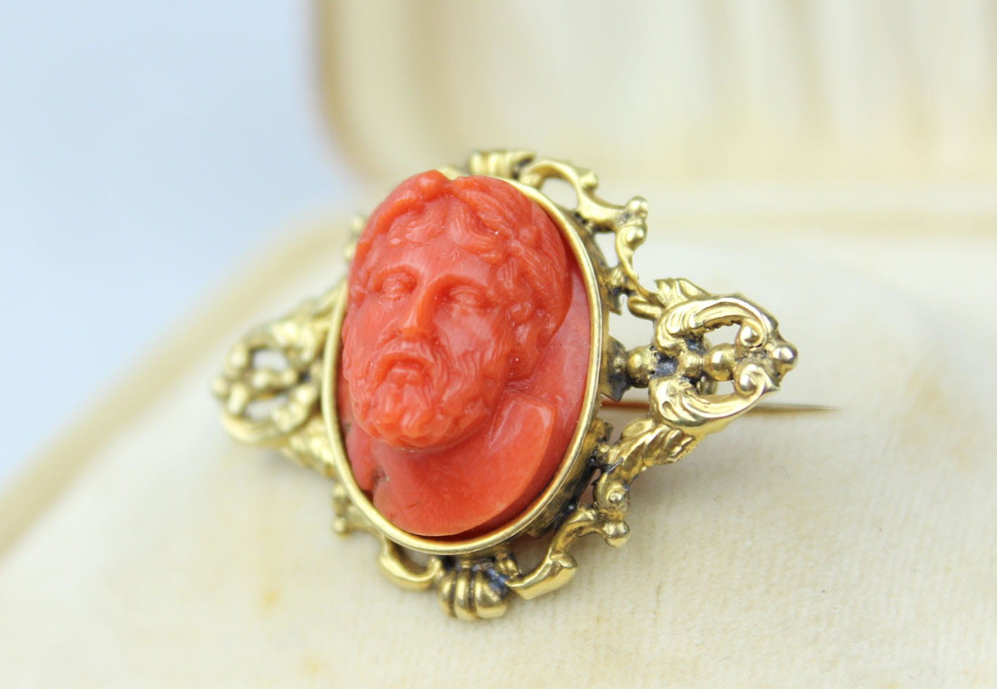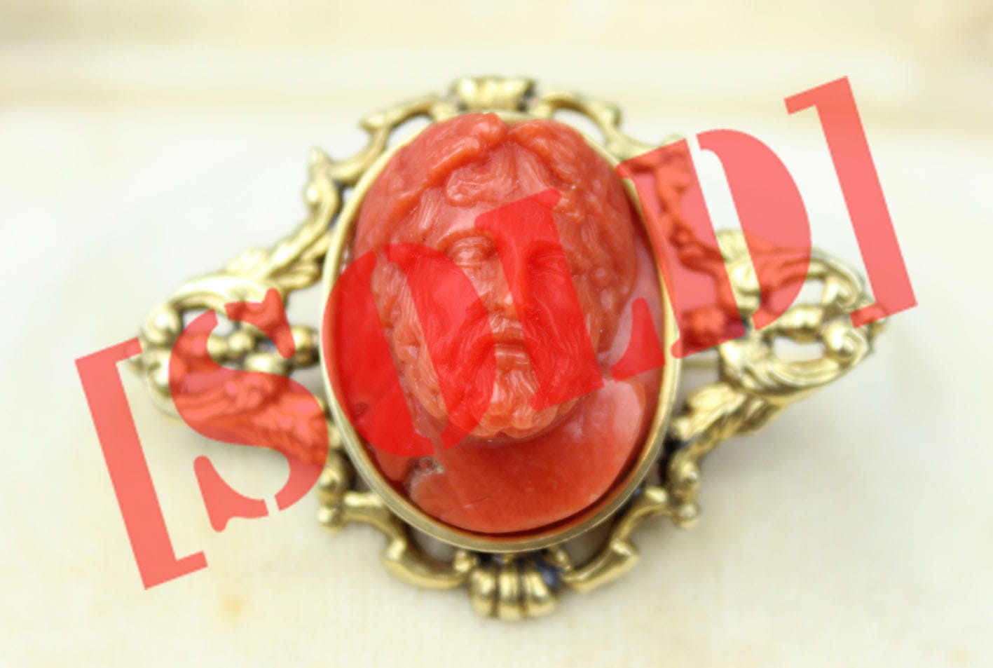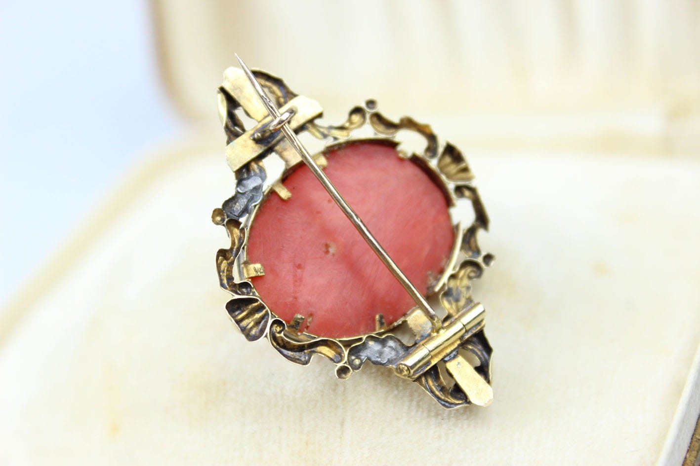 Niepowtarzalna eklektyczna broszka o zarysie rombu z lat 60-tych XIX wieku. Podstawa broszki wykonana w złocie próby ok. 560. ( brak punc badanie kwasowe). Element centralny stanowi rzeźbiona w koralu szlachetnym kamea przedstawiająca popiersie mężczyzny z wieńcem laurowym na głowie. Całość w bardzo dobrym stanie zachowania, jedynie dwa ślady cyny na odwrocie. Zapięcie typu "C". Wymiary:
