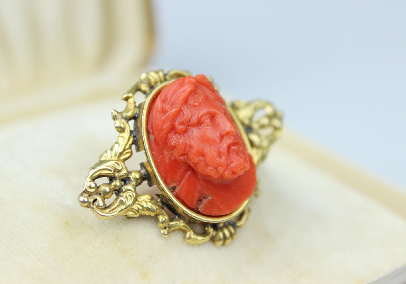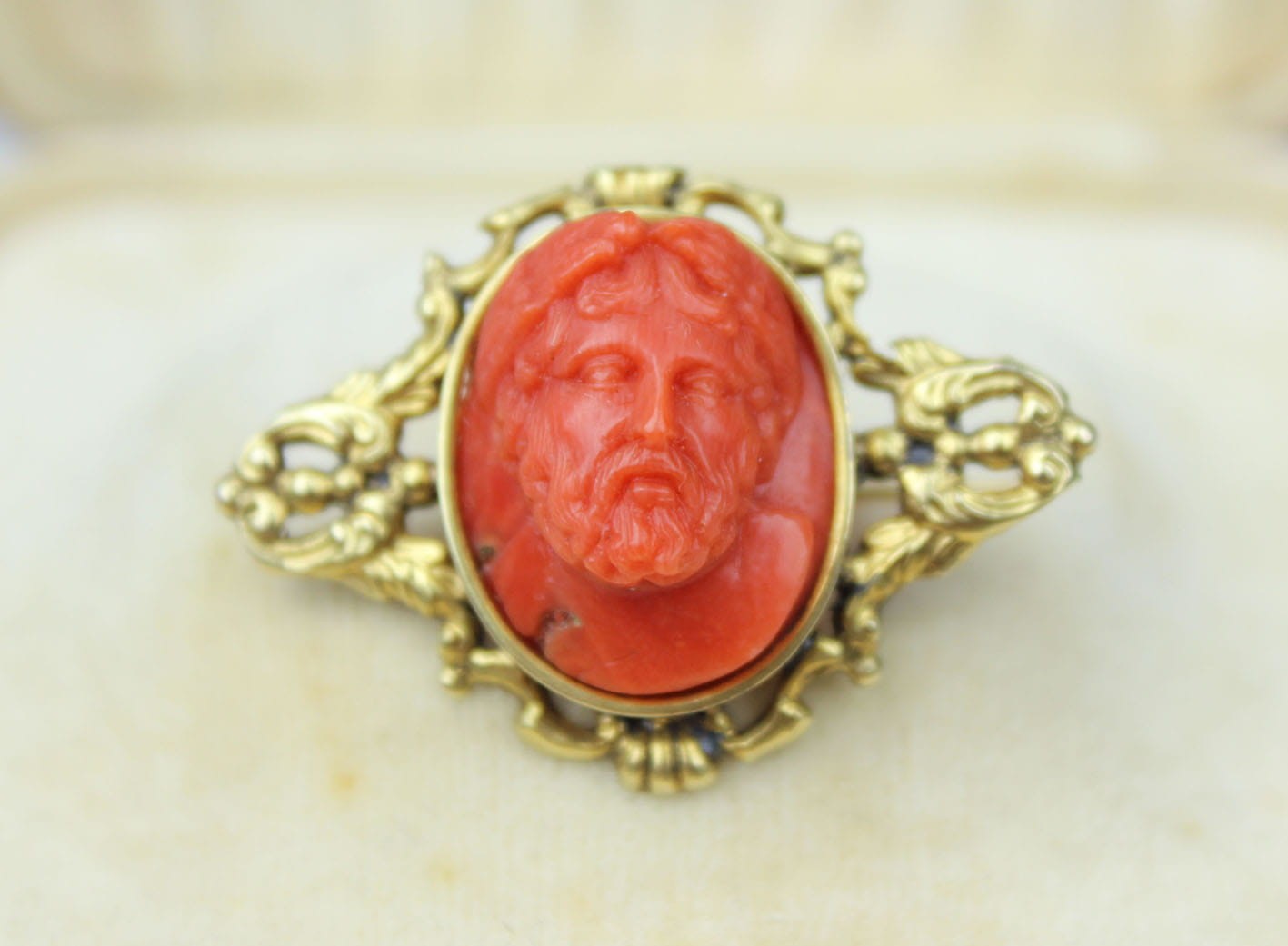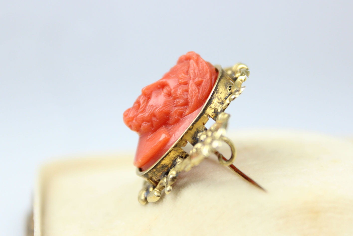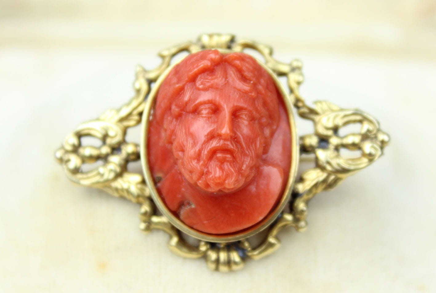 Niepowtarzalna eklektyczna broszka o zarysie rombu z lat 60-tych XIX wieku. Podstawa broszki wykonana w złocie próby ok. 560. ( brak punc badanie kwasowe). Element centralny stanowi rzeźbiona w koralu szlachetnym kamea przedstawiająca popiersie mężczyzny z wieńcem laurowym na głowie. Całość w bardzo dobrym stanie zachowania, jedynie dwa ślady cyny na odwrocie. Zapięcie typu "C". Wymiary:
