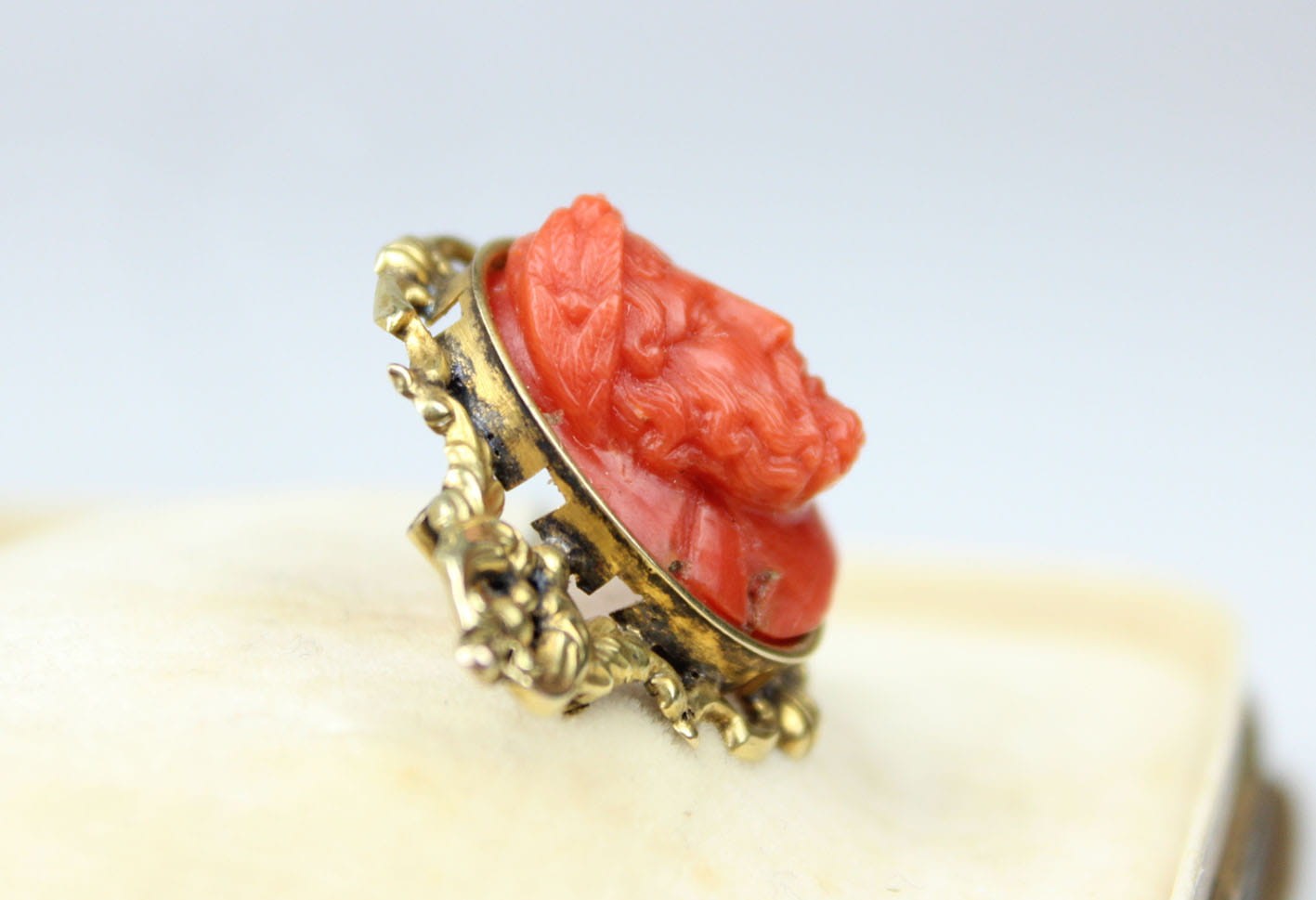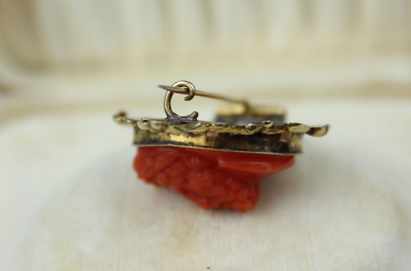 RZEŹBIONY KORAL BROSZKA XIX WIEK ZŁOTO