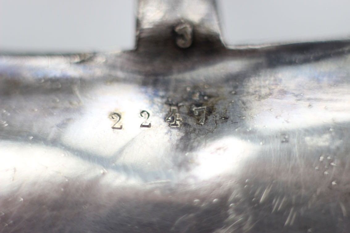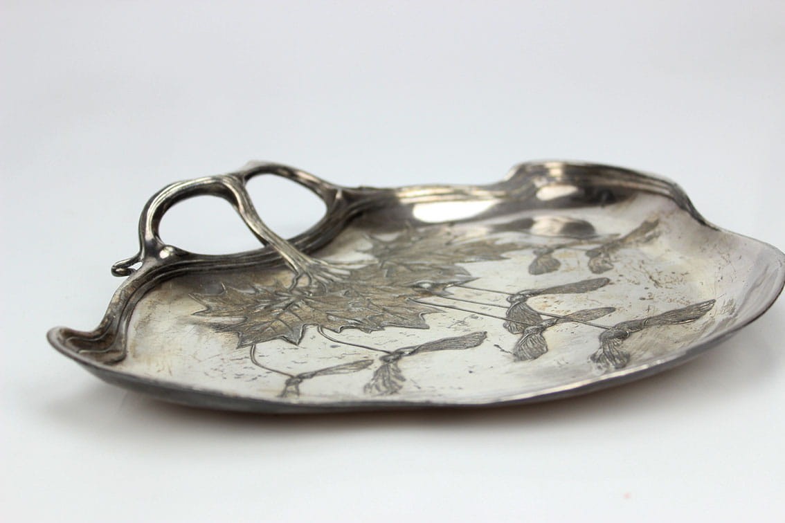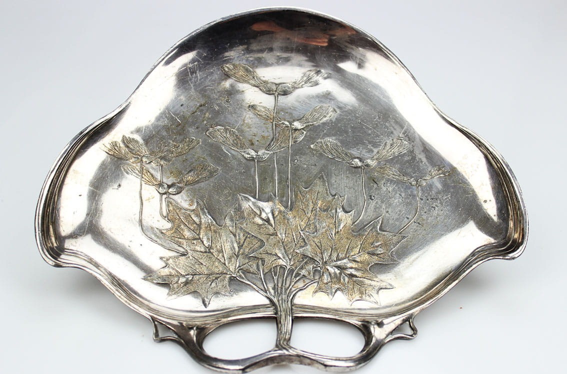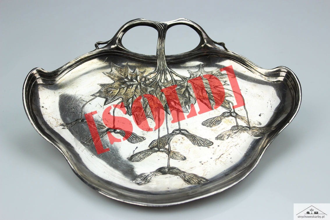 Patera o miękkiej, pływającej formie przepięknie zdobioną motywem gałązek, liści i owoców klonu. Całość w bardzo dobrym stanie zachowania w oryginalnym srebrzeniu z delikatną wiekową patynką.