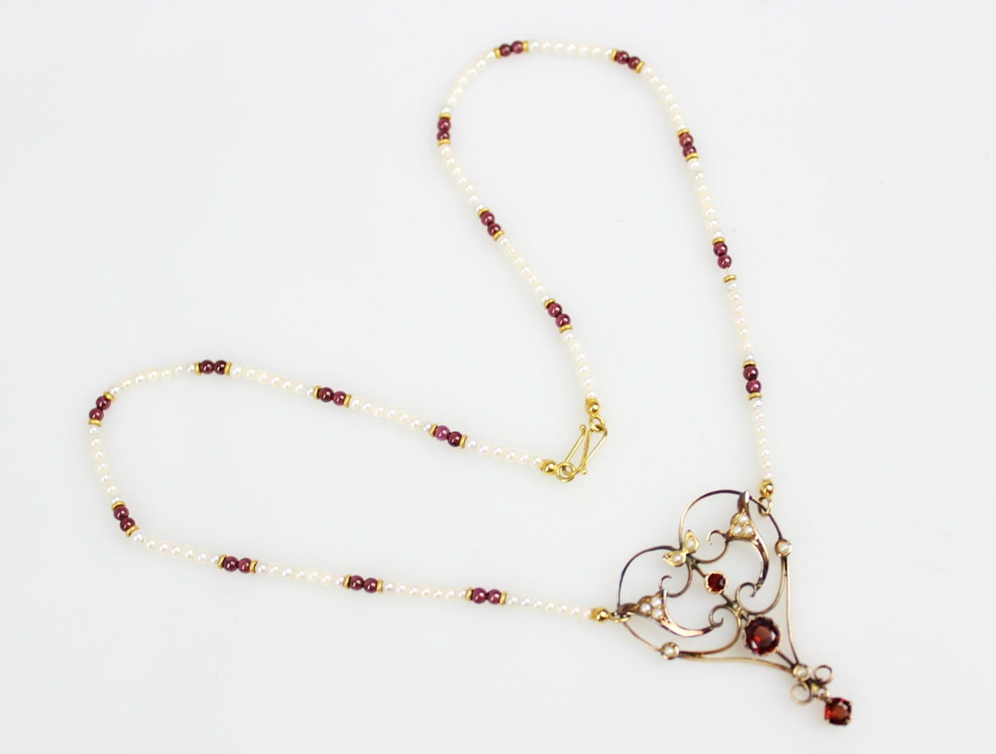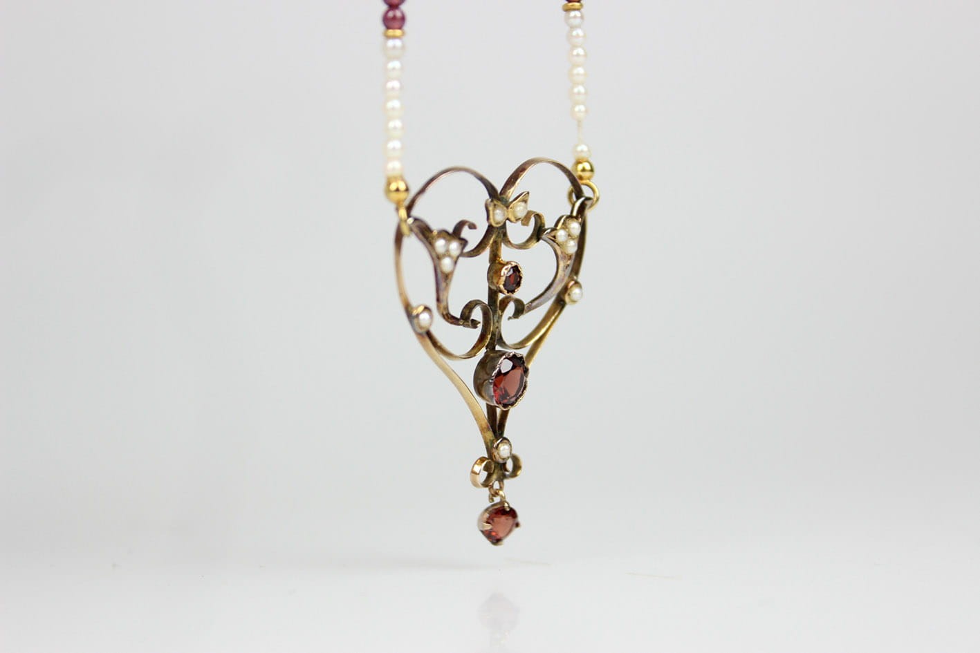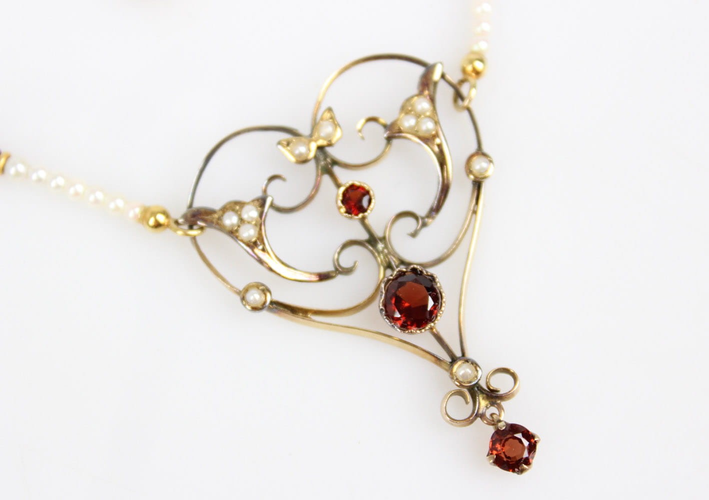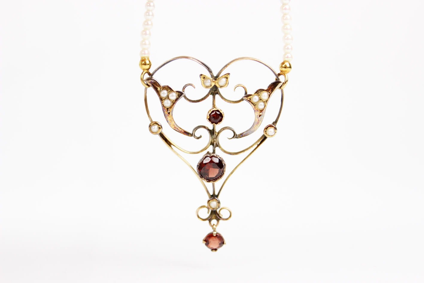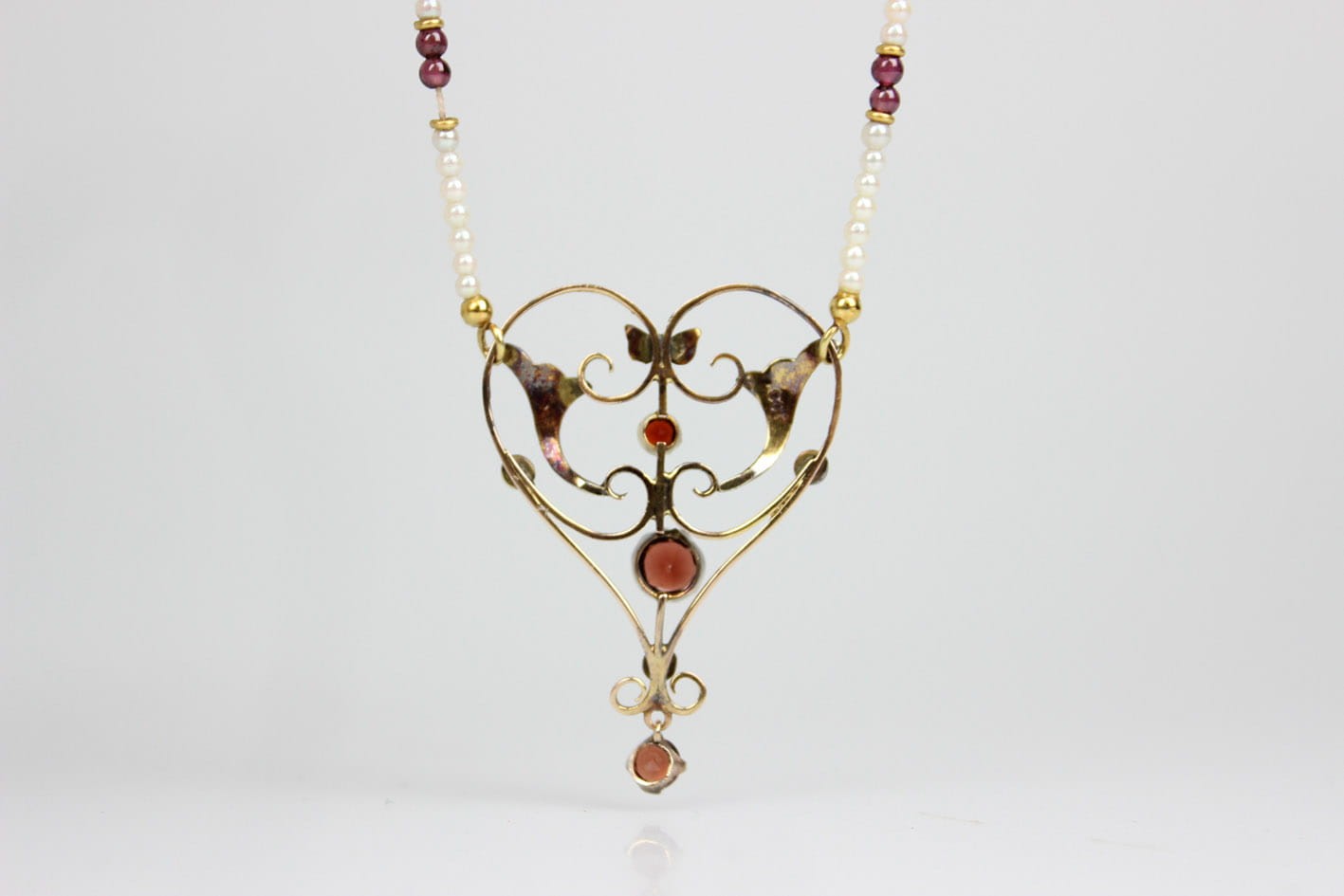 Wyjątkowy naszyjnik pochodzący z okresu secesji zachwycający swoją bogatą ornamentyką i szlachetnymi kamieniami. Część ozdobna wykonana ze złota próby 375 (badanie kwasowe), kameryzowana almandynami oraz perłami. Łańcuszek stanowi sznur maleńkich słonowodnych pereł układanych naprzemiennie z almandynami i złotymi przekładkami. Zapięcie w złocie próby 585. Bardzo dobry stan zachowania. Kamienie w komplecie. Wymiary: