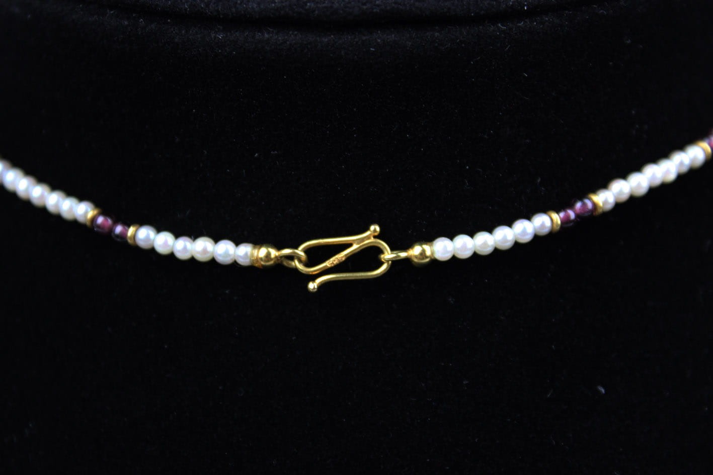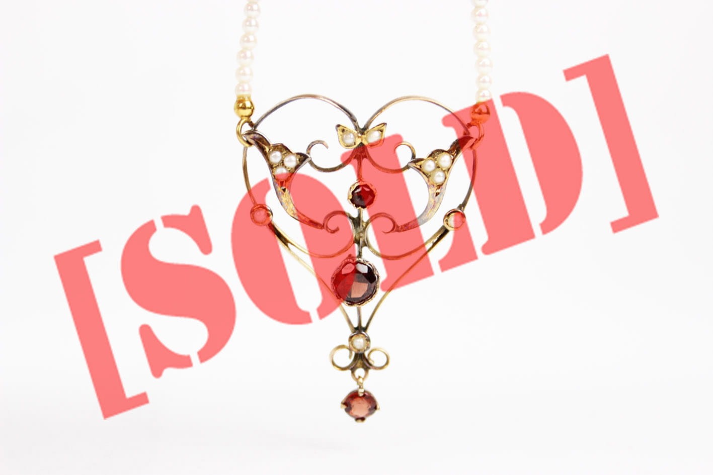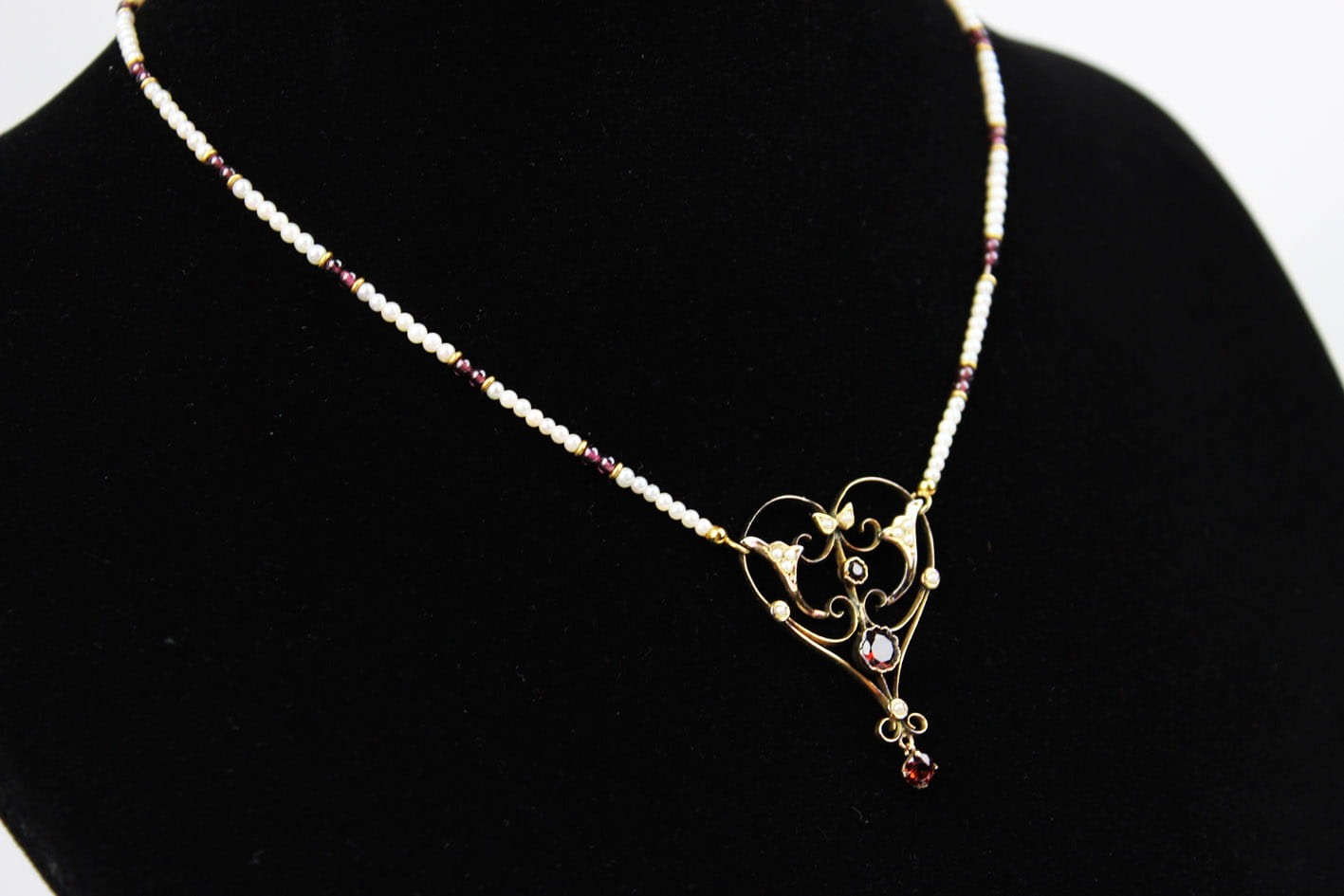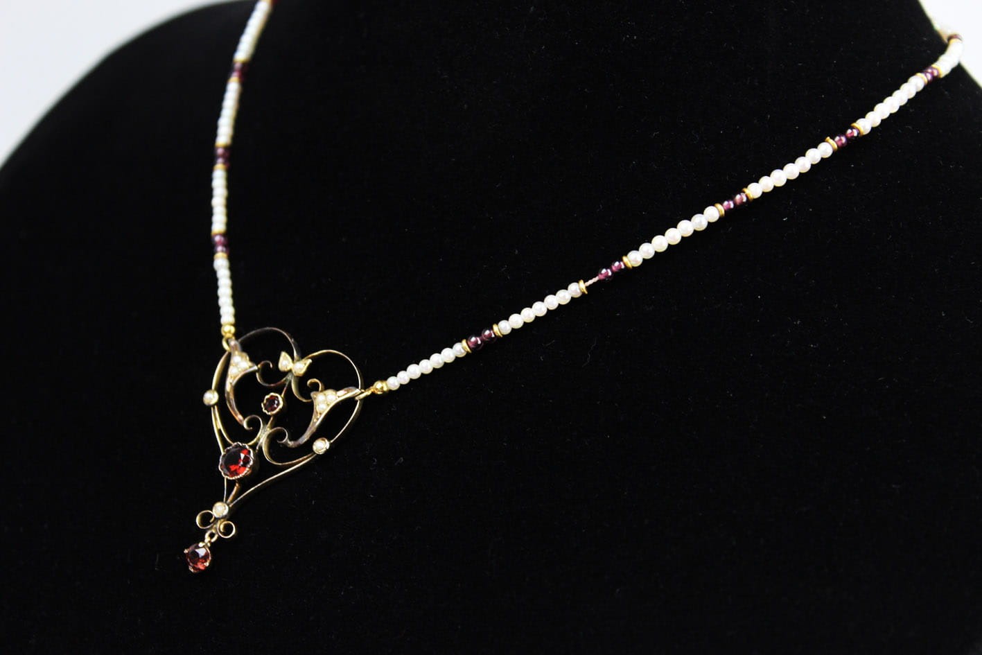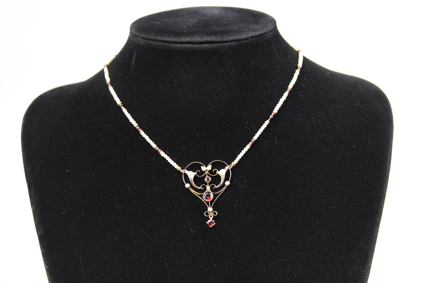 Wyjątkowy naszyjnik pochodzący z okresu secesji zachwycający swoją bogatą ornamentyką i szlachetnymi kamieniami. Część ozdobna wykonana ze złota próby 375 (badanie kwasowe), kameryzowana almandynami oraz perłami. Łańcuszek stanowi sznur maleńkich słonowodnych pereł układanych naprzemiennie z almandynami i złotymi przekładkami. Zapięcie w złocie próby 585. Bardzo dobry stan zachowania. Kamienie w komplecie. Wymiary: