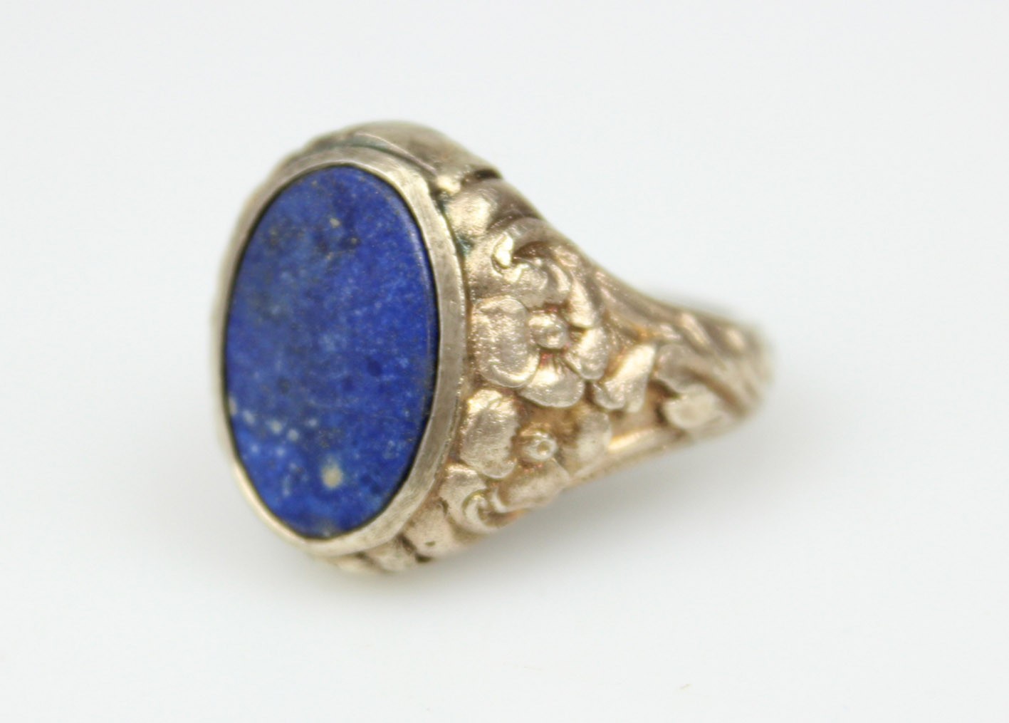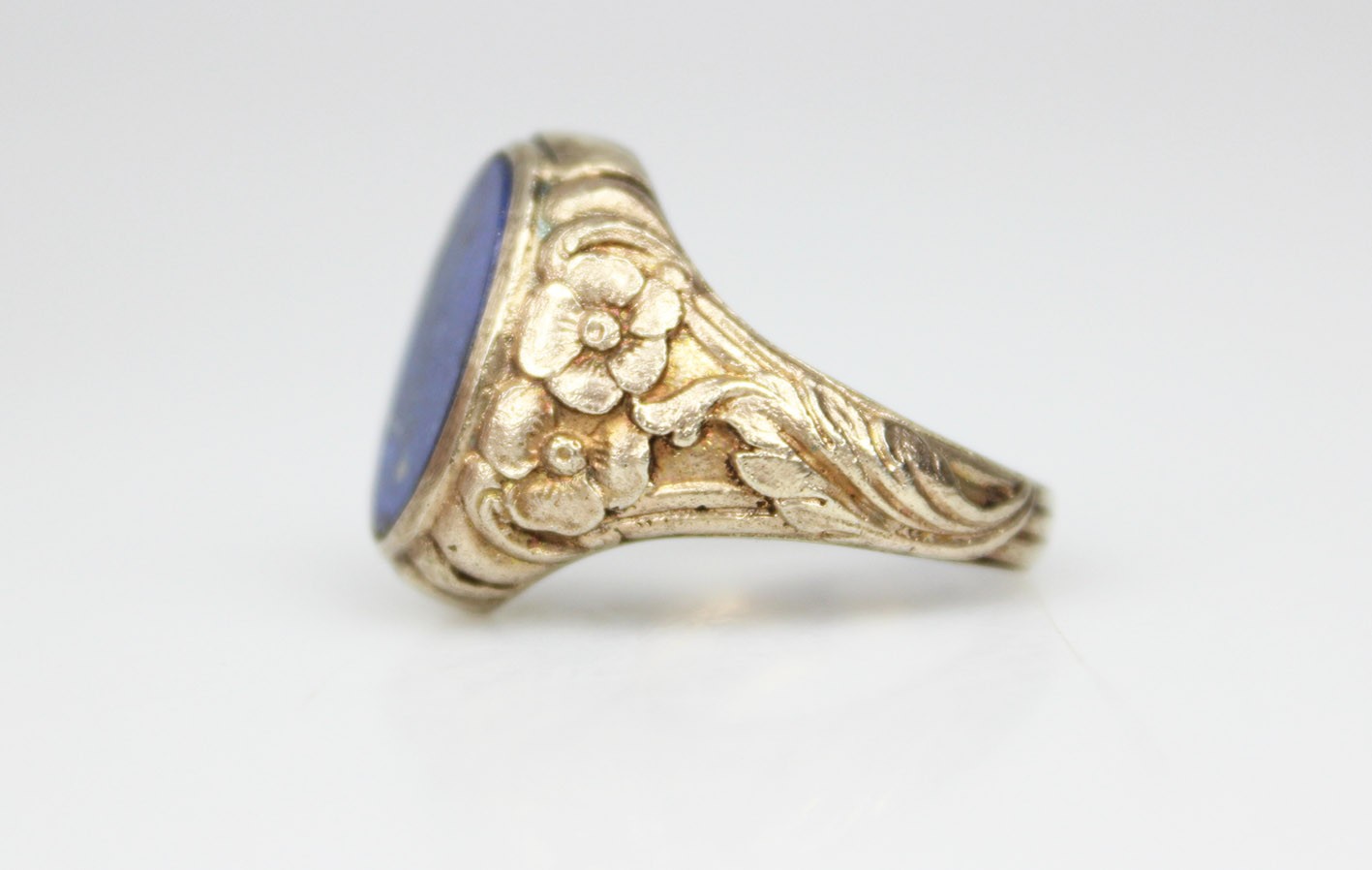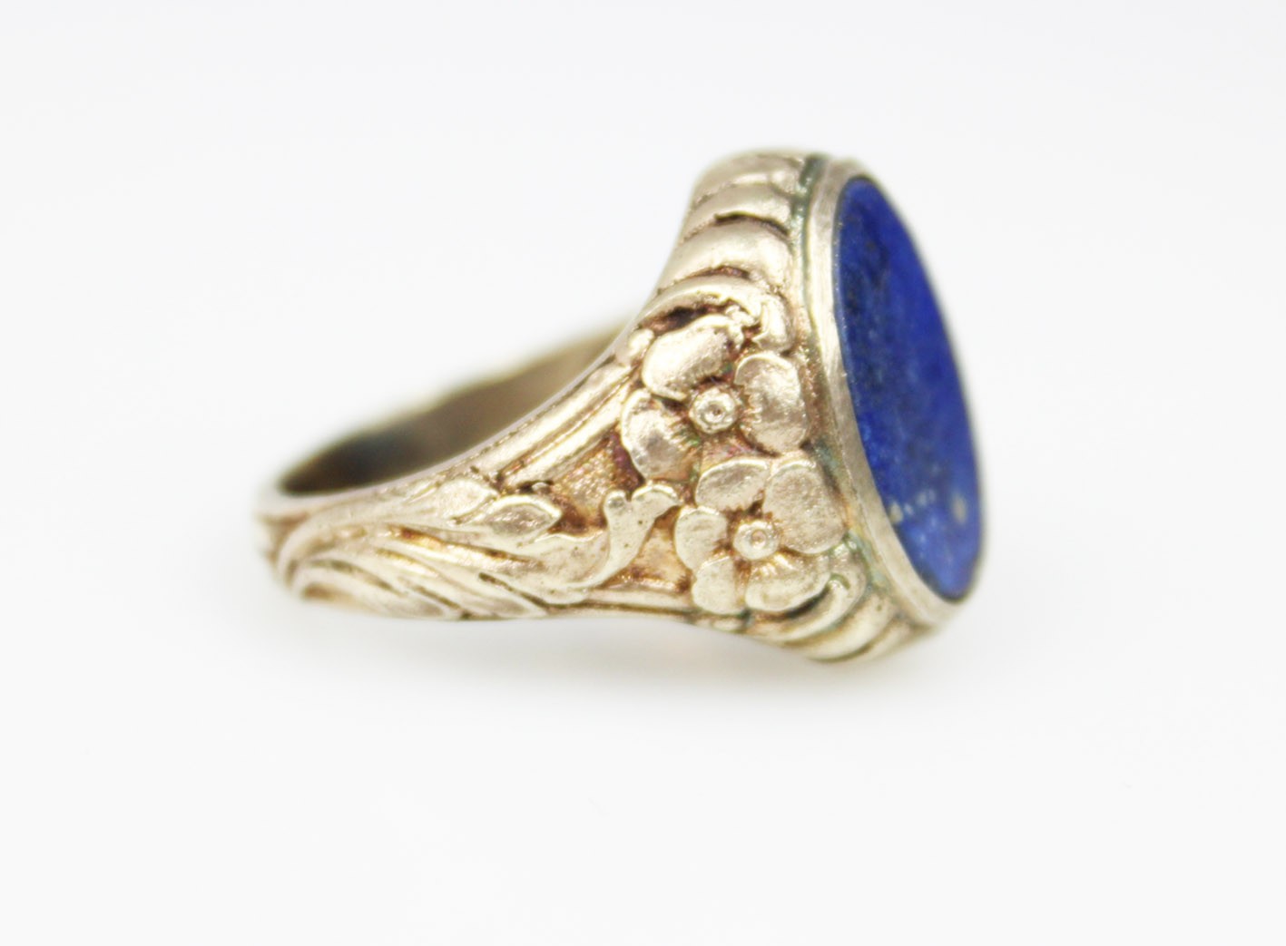 Stylowy pierścień o miękkiej, płynnej linii charakterystycznej dla secesji, wykonany ze srebra próby 835 z delikatnym złoceniem. Szyna dekorowana jest reliefowym ornamentem florystycznym – motywem kwiatów i wijących się liści, typowym dla biżuterii przełomu XIX i XX wieku. Centralną część zdobi owalna płytka lapis-lazuli o intensywnej, kobaltowej barwie z drobnymi inkluzjami pirytu, stanowiąc piękny kontrast dla ciepłego odcienia złoconego metalu. Kamień osadzony jest w prostej, klasycznej oprawie, co pozwala w pełni wydobyć jego naturalny kolor i strukturę. Sygnet zachowany w dobrym stanie z oryginalną patyną i śladami użytkowania, podkreślającymi jego wiekowy charakter.