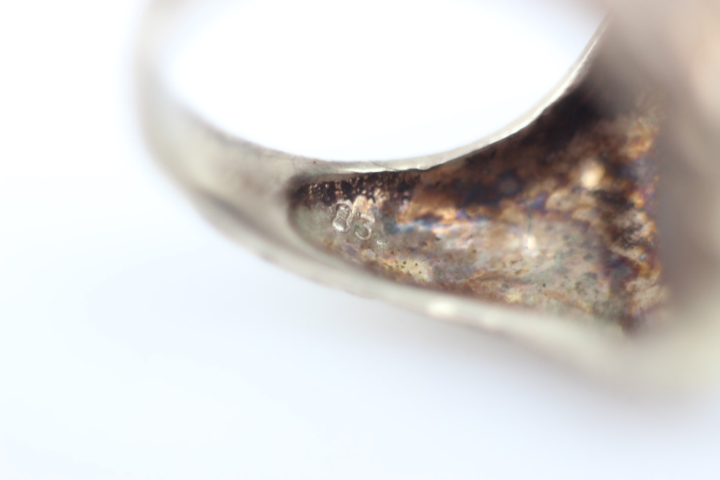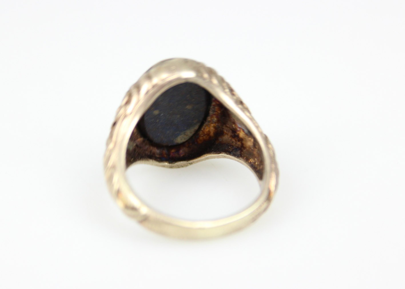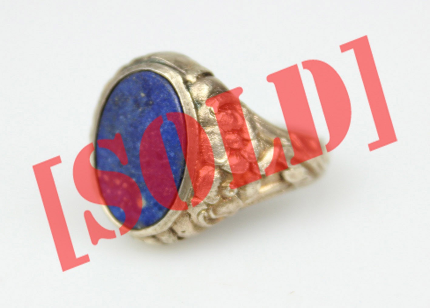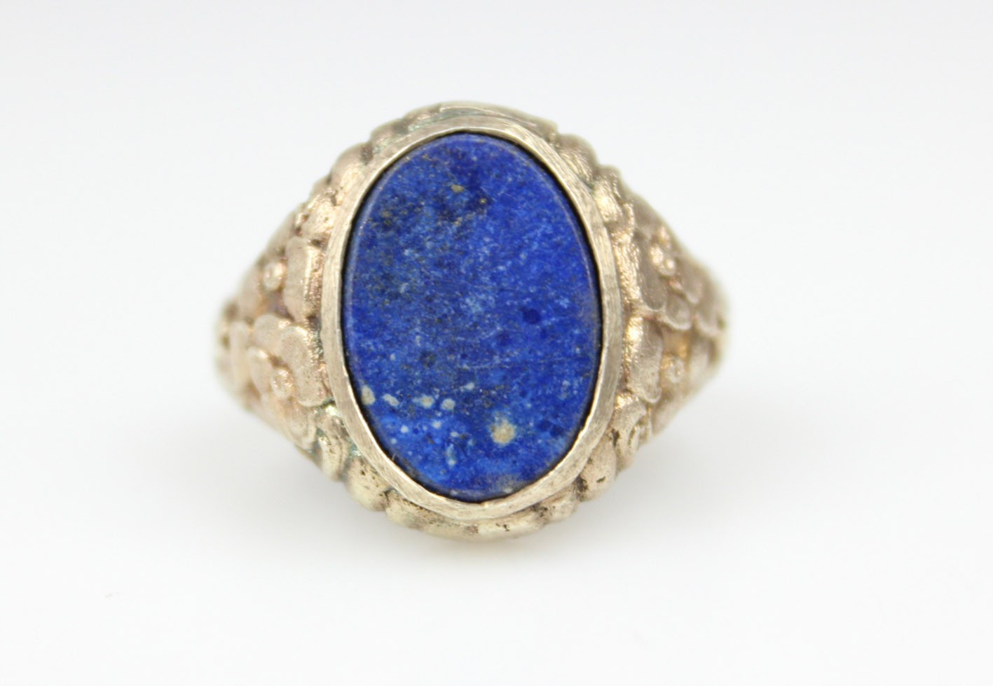 Stylowy pierścień o miękkiej, płynnej linii charakterystycznej dla secesji, wykonany ze srebra próby 835 z delikatnym złoceniem. Szyna dekorowana jest reliefowym ornamentem florystycznym – motywem kwiatów i wijących się liści, typowym dla biżuterii przełomu XIX i XX wieku. Centralną część zdobi owalna płytka lapis-lazuli o intensywnej, kobaltowej barwie z drobnymi inkluzjami pirytu, stanowiąc piękny kontrast dla ciepłego odcienia złoconego metalu. Kamień osadzony jest w prostej, klasycznej oprawie, co pozwala w pełni wydobyć jego naturalny kolor i strukturę. Sygnet zachowany w dobrym stanie z oryginalną patyną i śladami użytkowania, podkreślającymi jego wiekowy charakter.