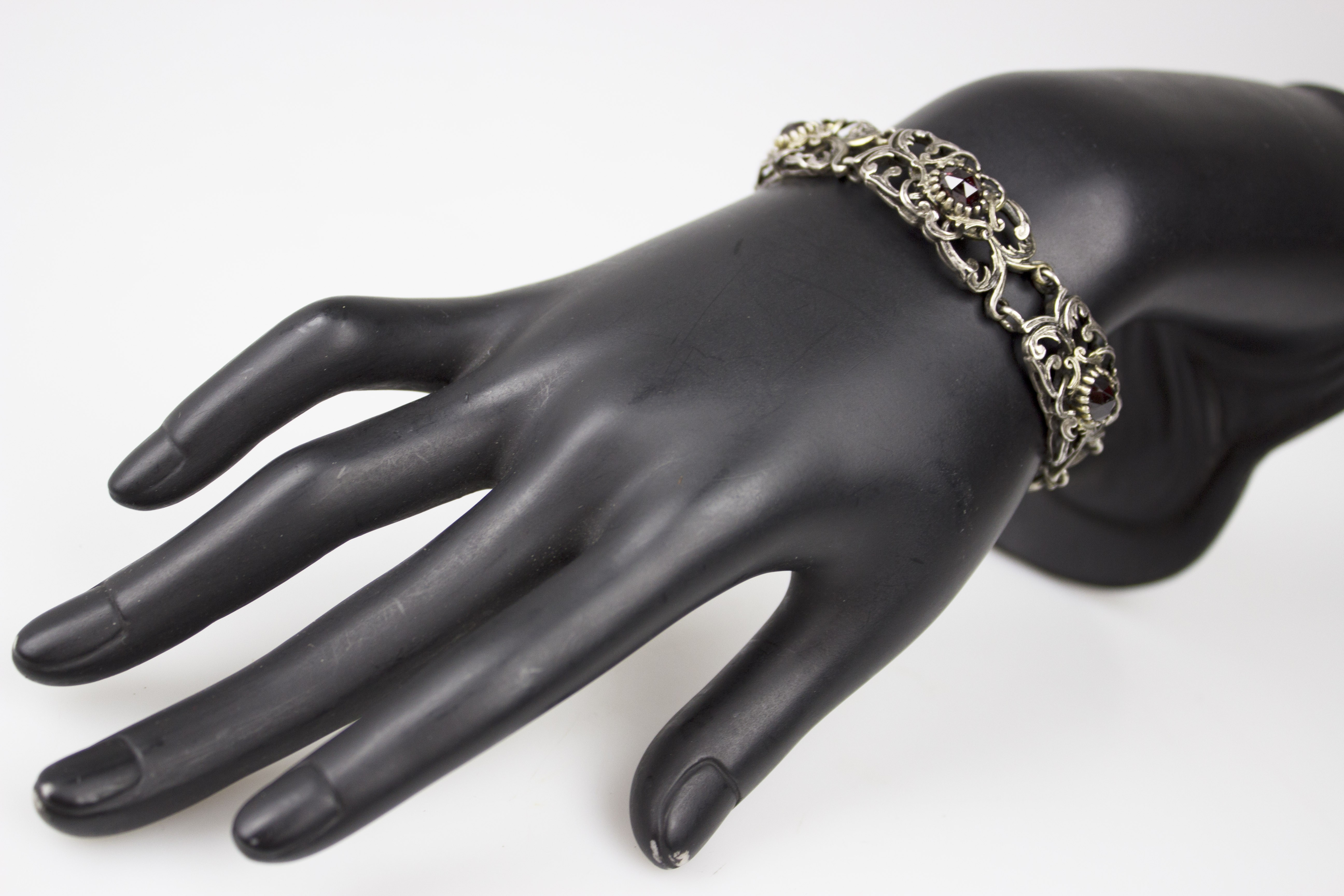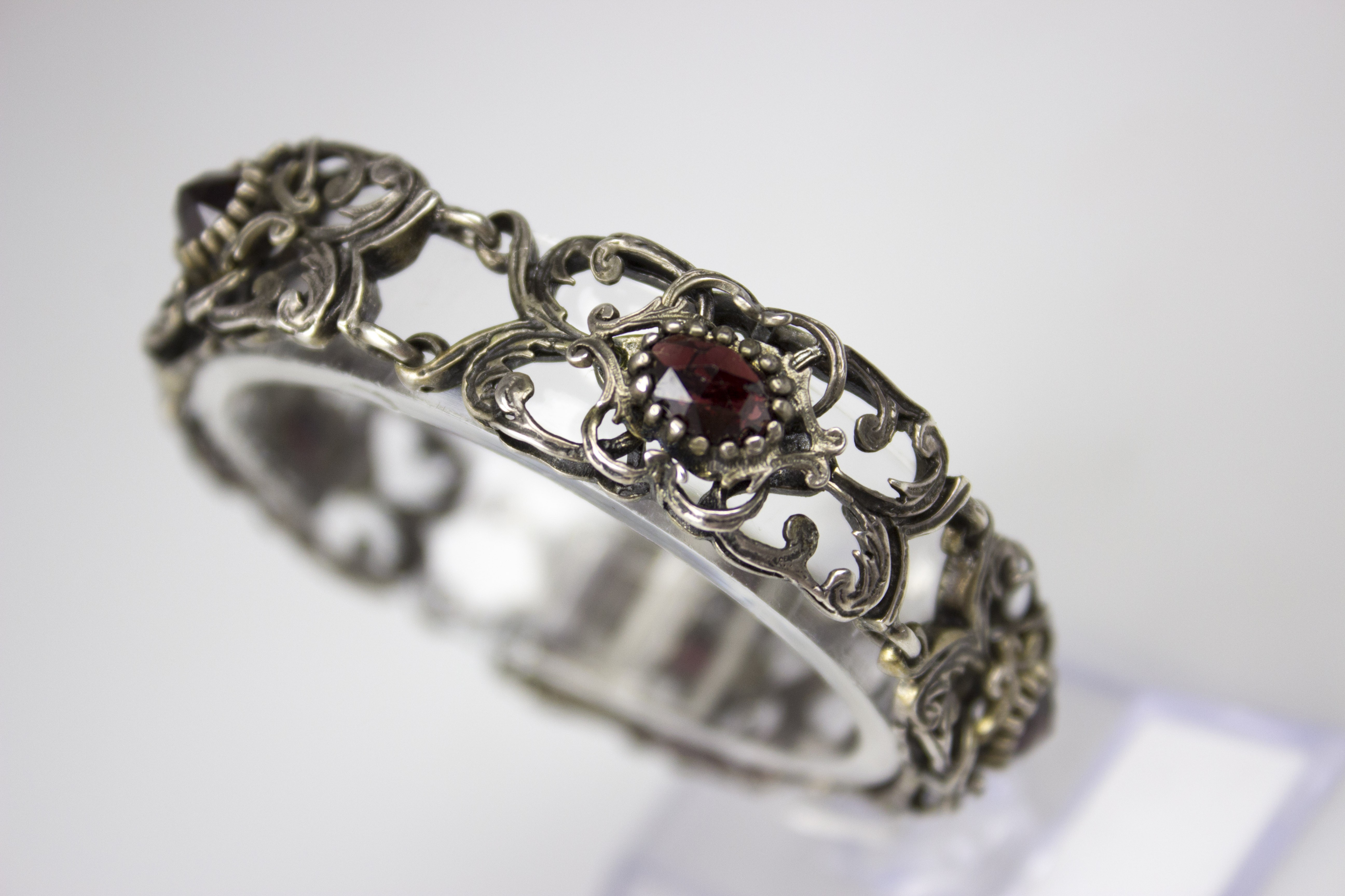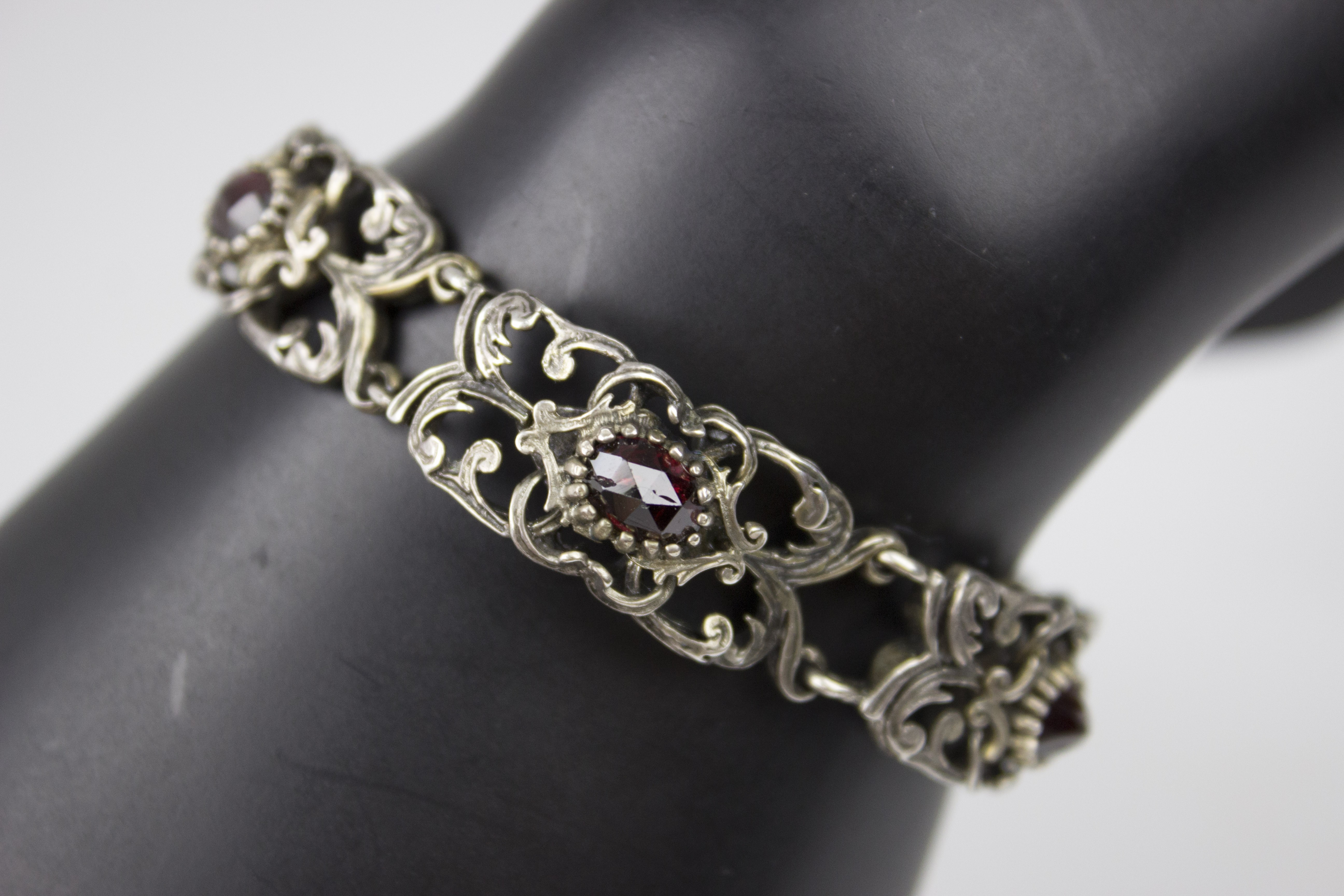 Efektowna, ażurowa bransoletka segmentowa wykonana w srebrze próby 800, utrzymana w dekoracyjnej stylistyce o miękkich, płynnych liniach. Konstrukcja oparta na powtarzalnych, bogato opracowanych ogniwach połączonych w harmonijną całość, która bardzo dobrze układa się na nadgarstku. Forma przestrzenna, lekka wizualnie, a jednocześnie solidna i wyraźnie biżuteryjna. Każdy segment zdobiony jest naturalnym, fasetowanym granatem o głębokiej, winnej czerwieni, osadzonym centralnie w dekoracyjnej oprawie. Kamienie są równe, dobrze dobrane kolorystycznie i estetycznie współgrają z srebrem. Bransoletka wyposażona w solidne zapięcie szufladkowe, sygnowane próbą srebra 800z dodatkowym zabezpieczeniem w postaci łańcuszka. Stan zachowania bardzo dobry, z naturalną, delikatną patyną odpowiednią do wieku, bez uszkodzeń, braków czy deformacji. Wymiary: