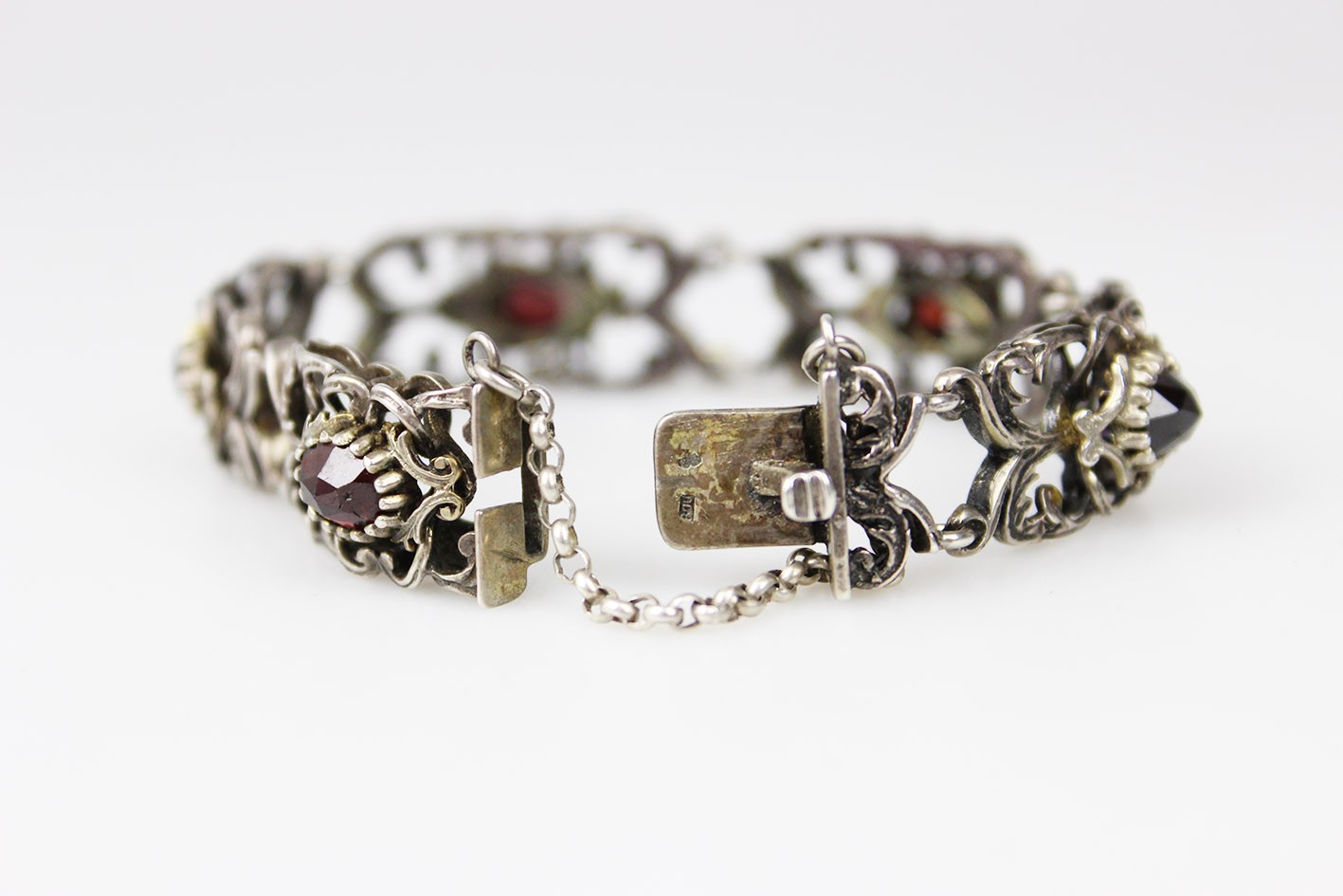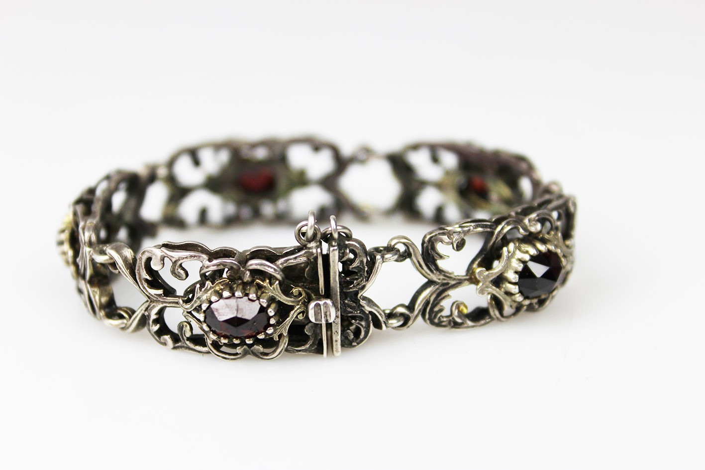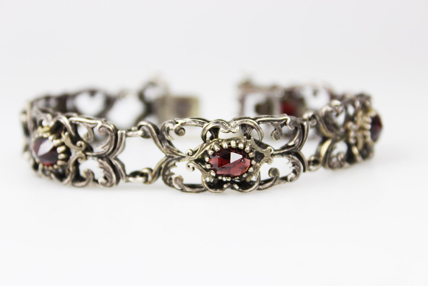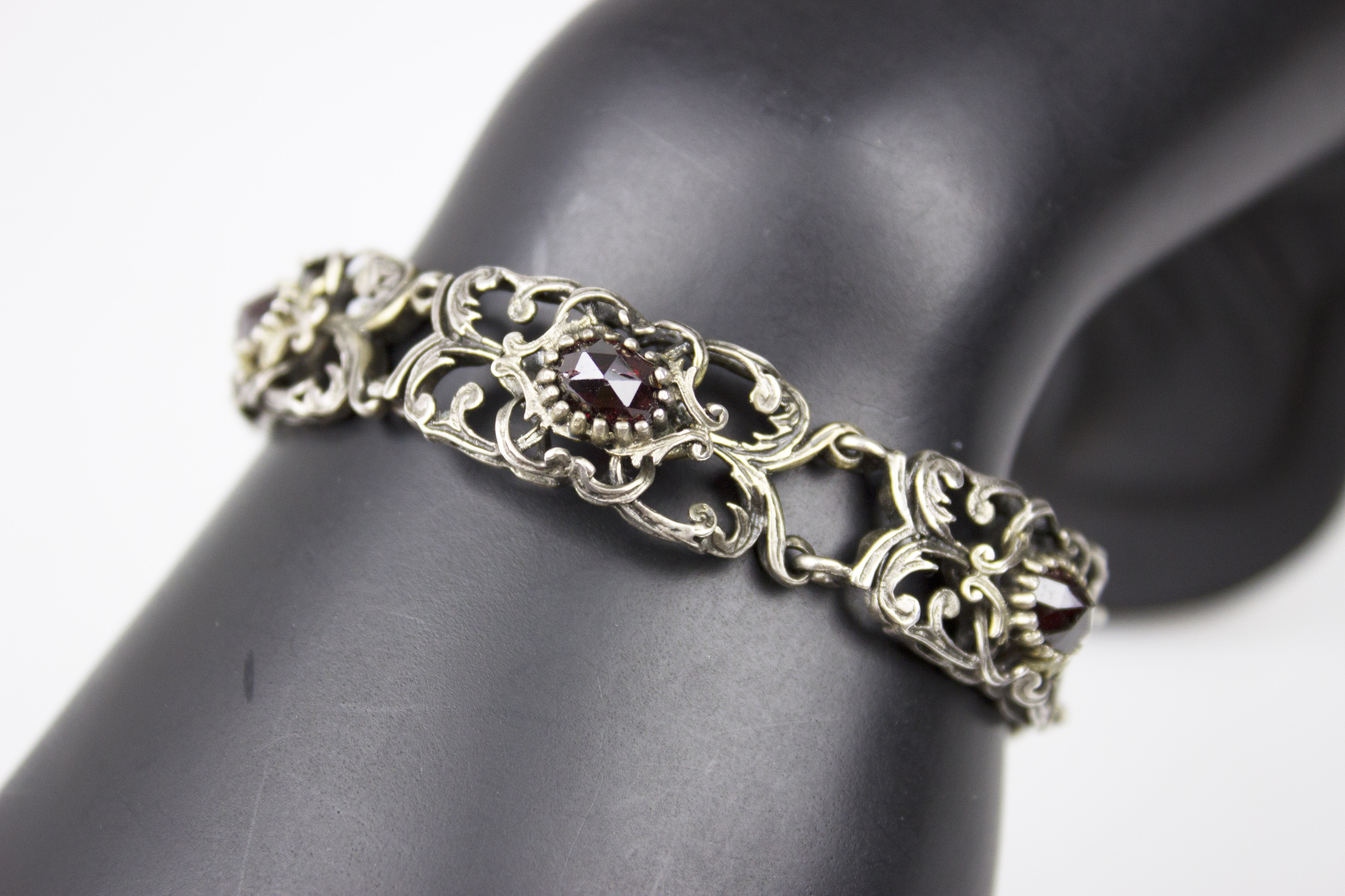 Efektowna, ażurowa bransoletka segmentowa wykonana w srebrze próby 800, utrzymana w dekoracyjnej stylistyce o miękkich, płynnych liniach. Konstrukcja oparta na powtarzalnych, bogato opracowanych ogniwach połączonych w harmonijną całość, która bardzo dobrze układa się na nadgarstku. Forma przestrzenna, lekka wizualnie, a jednocześnie solidna i wyraźnie biżuteryjna. Każdy segment zdobiony jest naturalnym, fasetowanym granatem o głębokiej, winnej czerwieni, osadzonym centralnie w dekoracyjnej oprawie. Kamienie są równe, dobrze dobrane kolorystycznie i estetycznie współgrają z srebrem. Bransoletka wyposażona w solidne zapięcie szufladkowe, sygnowane próbą srebra 800z dodatkowym zabezpieczeniem w postaci łańcuszka. Stan zachowania bardzo dobry, z naturalną, delikatną patyną odpowiednią do wieku, bez uszkodzeń, braków czy deformacji. Wymiary: